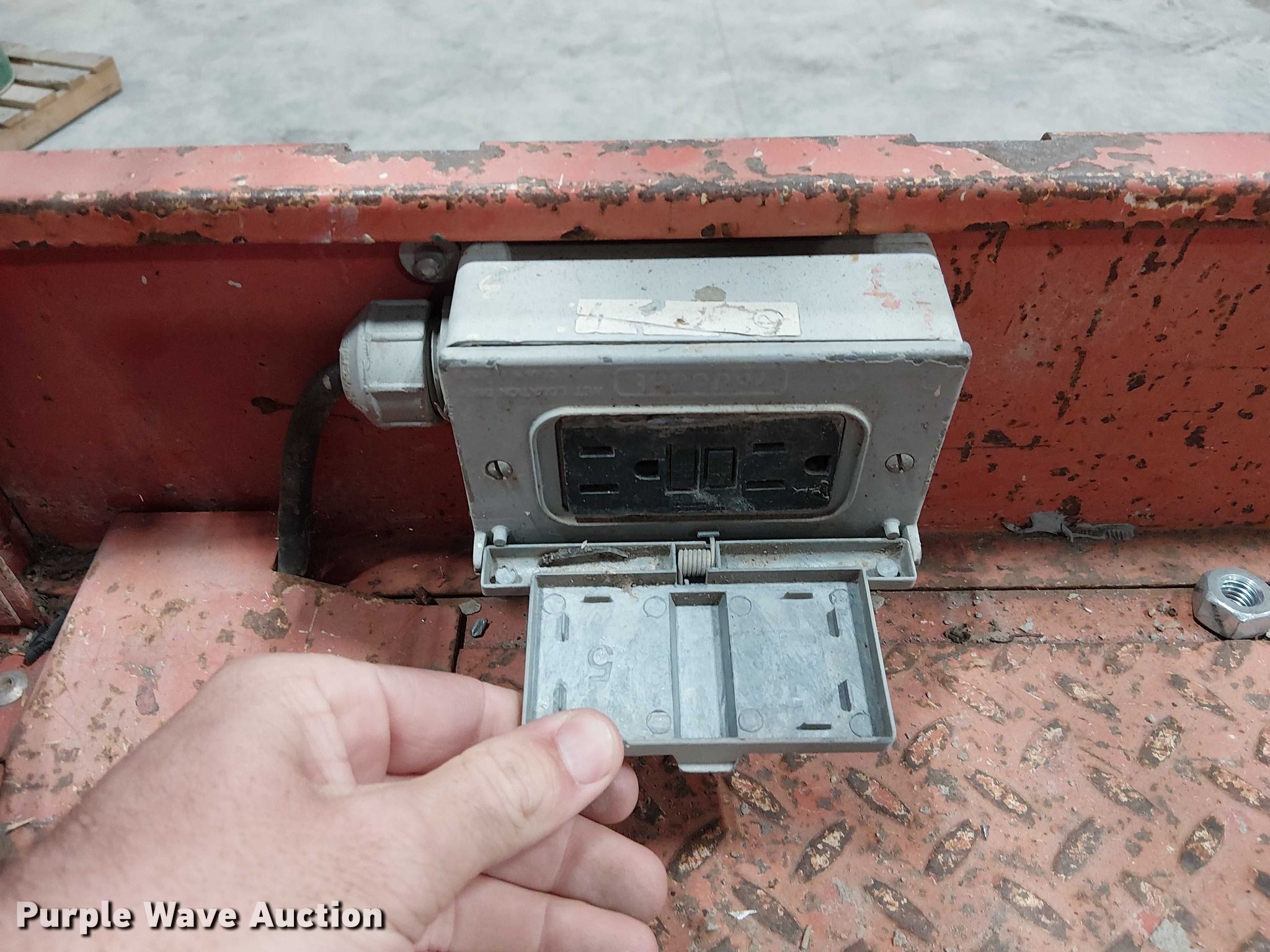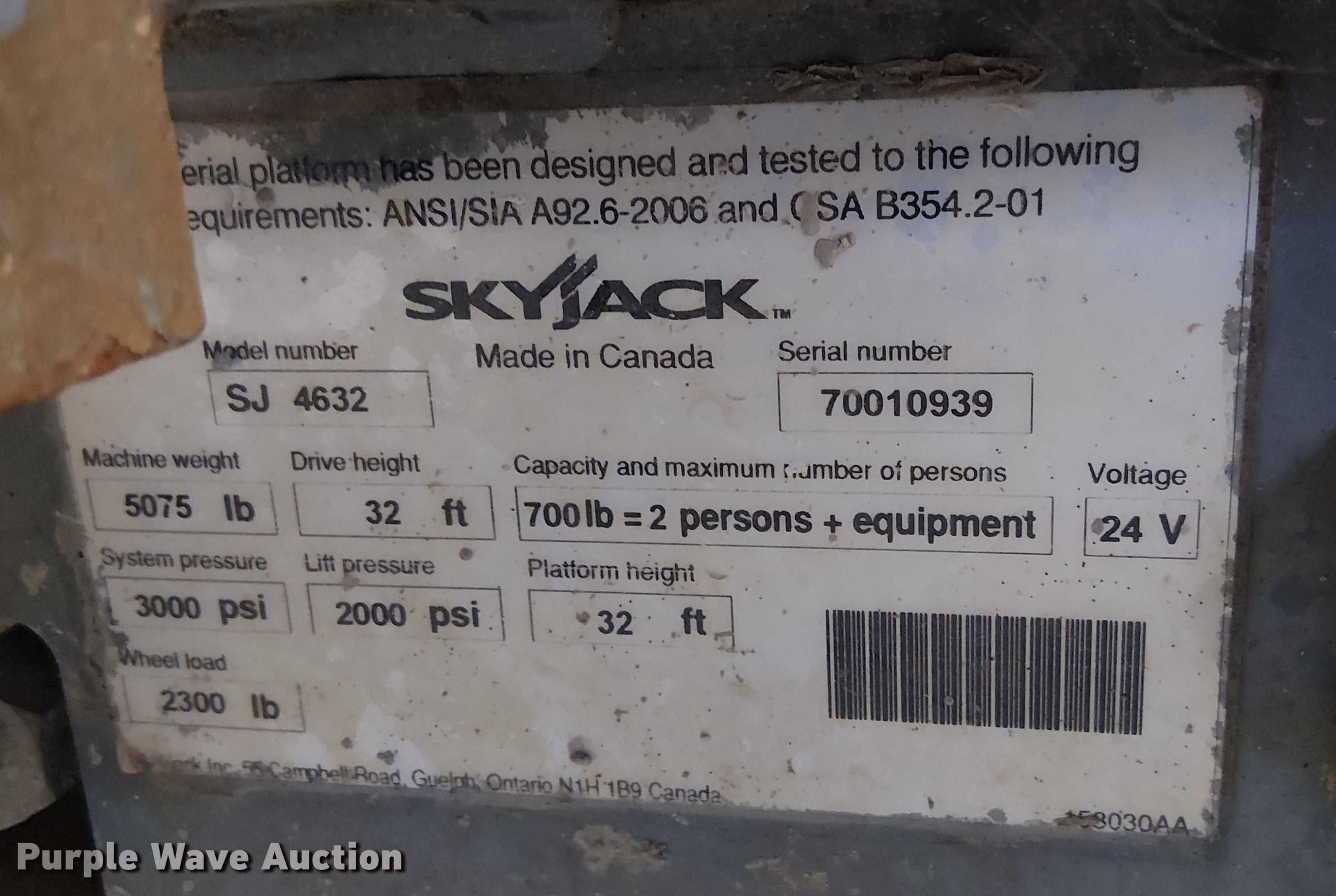 SkyJack SJIII 4632 scissor lift. Hours: 320 on meter, Serial: 70010939. Electric Motor Volts: 24. Features Maximum lift capacity: 700 lbs, Maximum lift height: 32', Platform: 85" L x 44" W, AC power outlet, Controls: Platform, Ground, Platform extensions: Manual. Tires Solid. Notes Steering issues, does not turn right , Unit does not move when lift is up. Anderson Mechanical. Kansas City, MO 64130