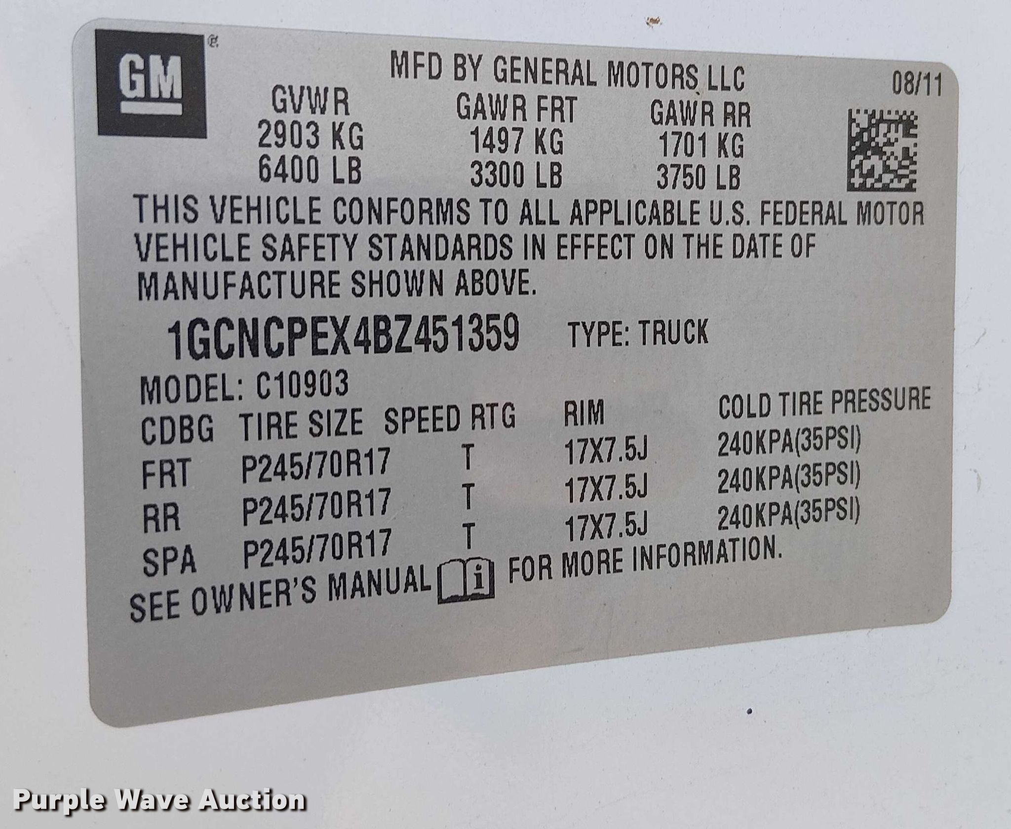 - VIN: 1GCNCPEX4BZ451359