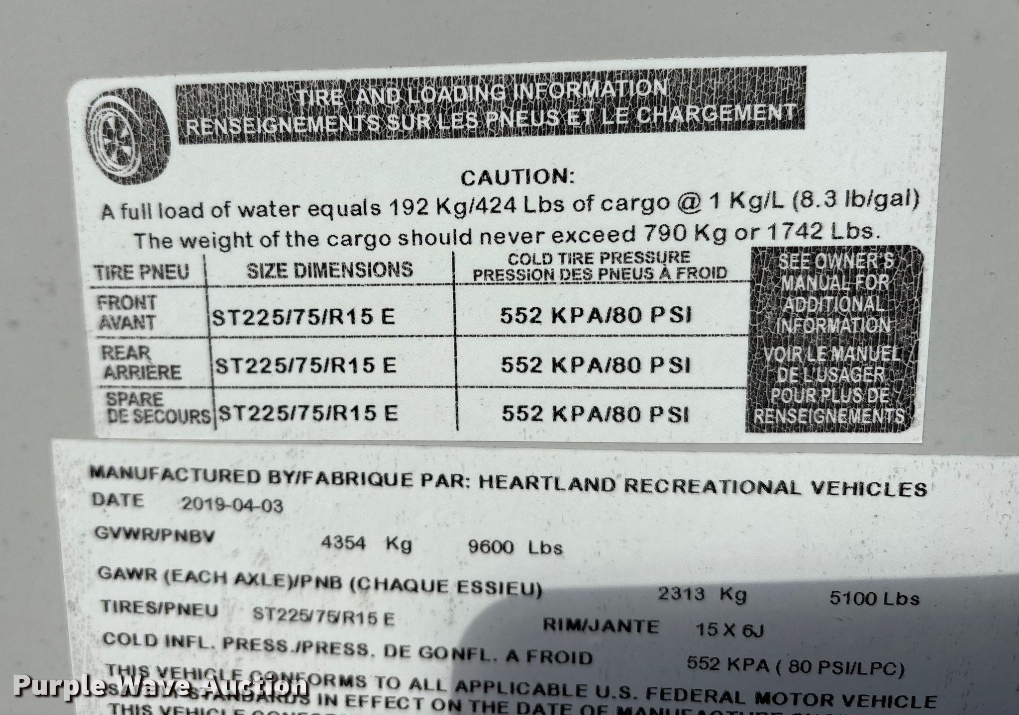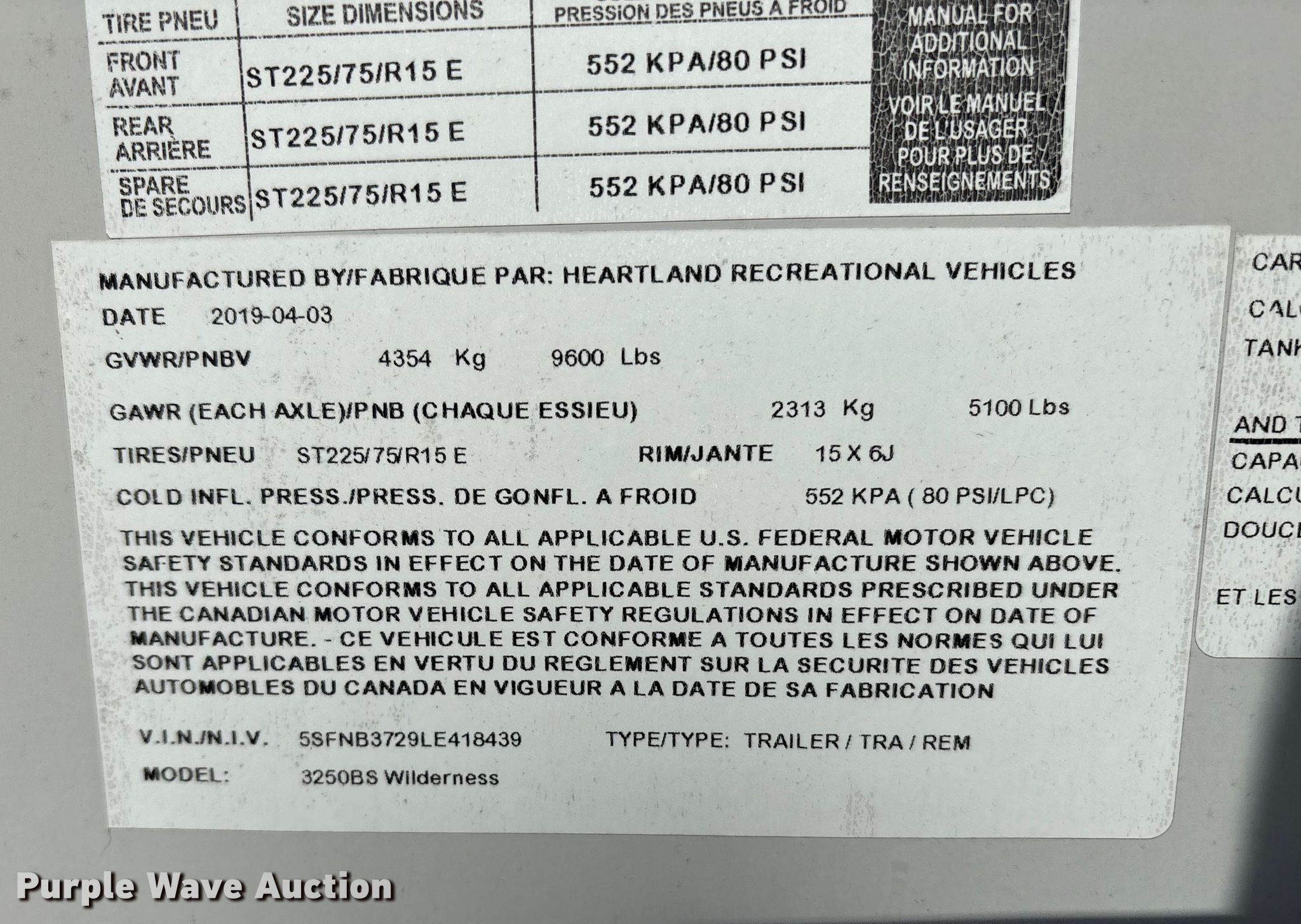 2020 Heartland Wilderness camper. Camper length: 32' 10", VIN: 5SFNB3729LE418439, Unit #: 88892585. Chassis Axles: Tandem, Suspension: Spring, Brakes: Electric, GVWR: 9,600 lbs. Interior Kitchen: Sink, Refrigerator, Freezer, Microwave, Oven, Stove: Propane, Living room: Table, Couch, Bathroom, Beds: 5 Bed type: Queen, Twin, TVs: 2, AC units: 2. Features Slide outs: 3, Awnings: 1 Awning type: Electric, Ball hitch: 2". Tires Size: 225/65R15. Notes Key not included, Flat tires, Unknown operating condition. Repossessed item, stored at a secured facility. Please review REQUIRED REMOVAL INSTRUCTIONS. Titles will be distributed after confirmation of payment and removal. Tennessee title. Title distribution may be delayed up to 14 days from verification of funds. Lender Owned. 795 Sipe Road. York Haven, PA 17370