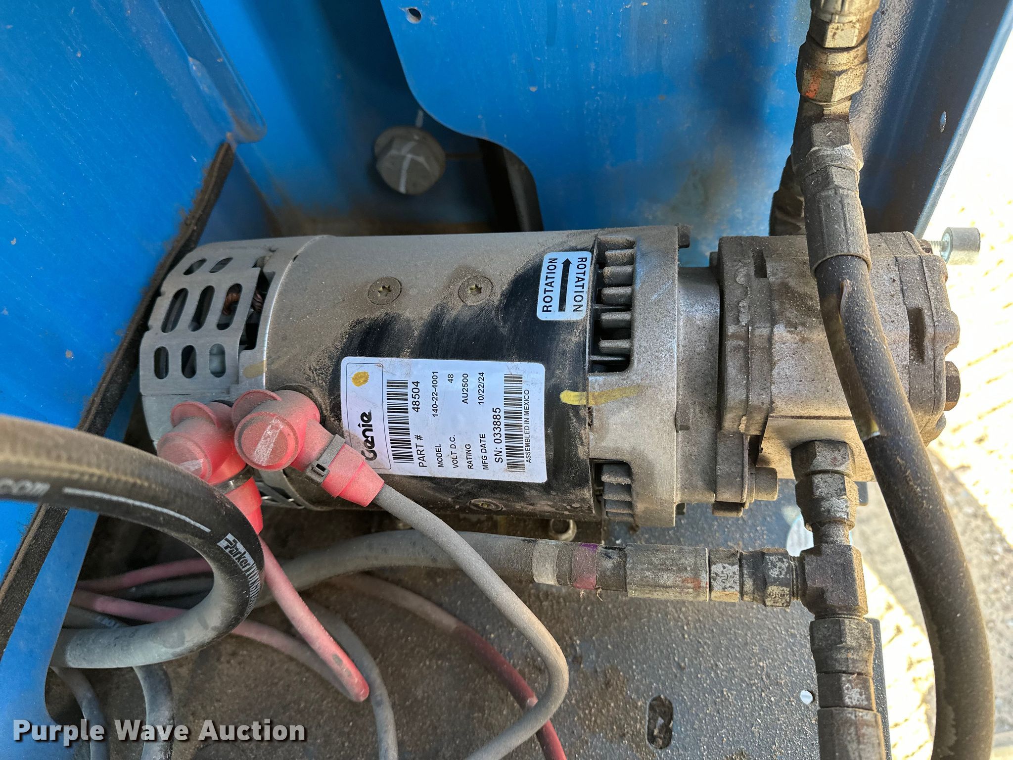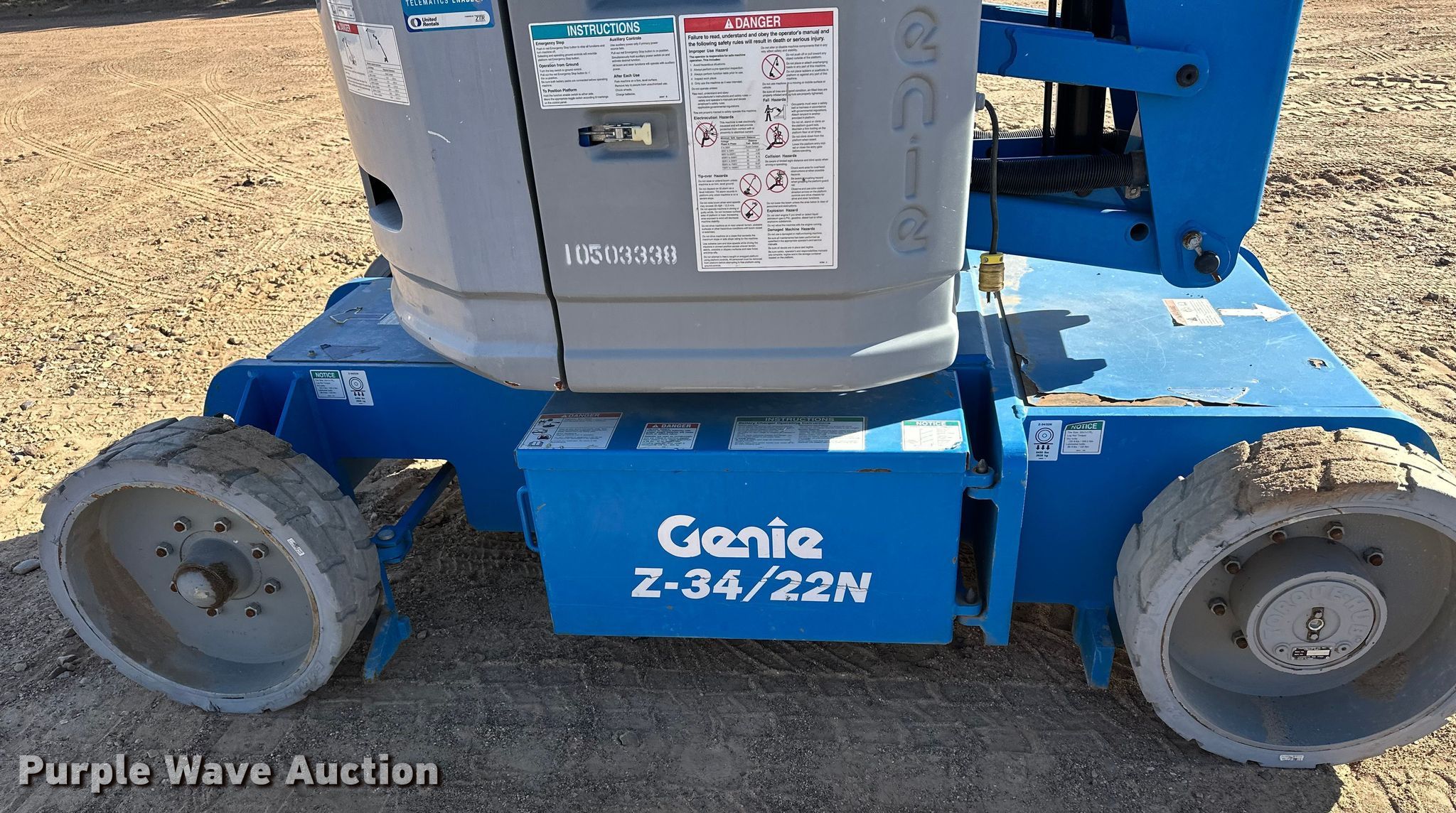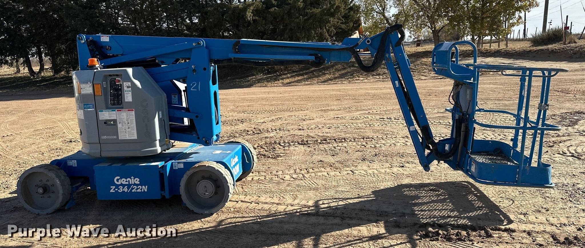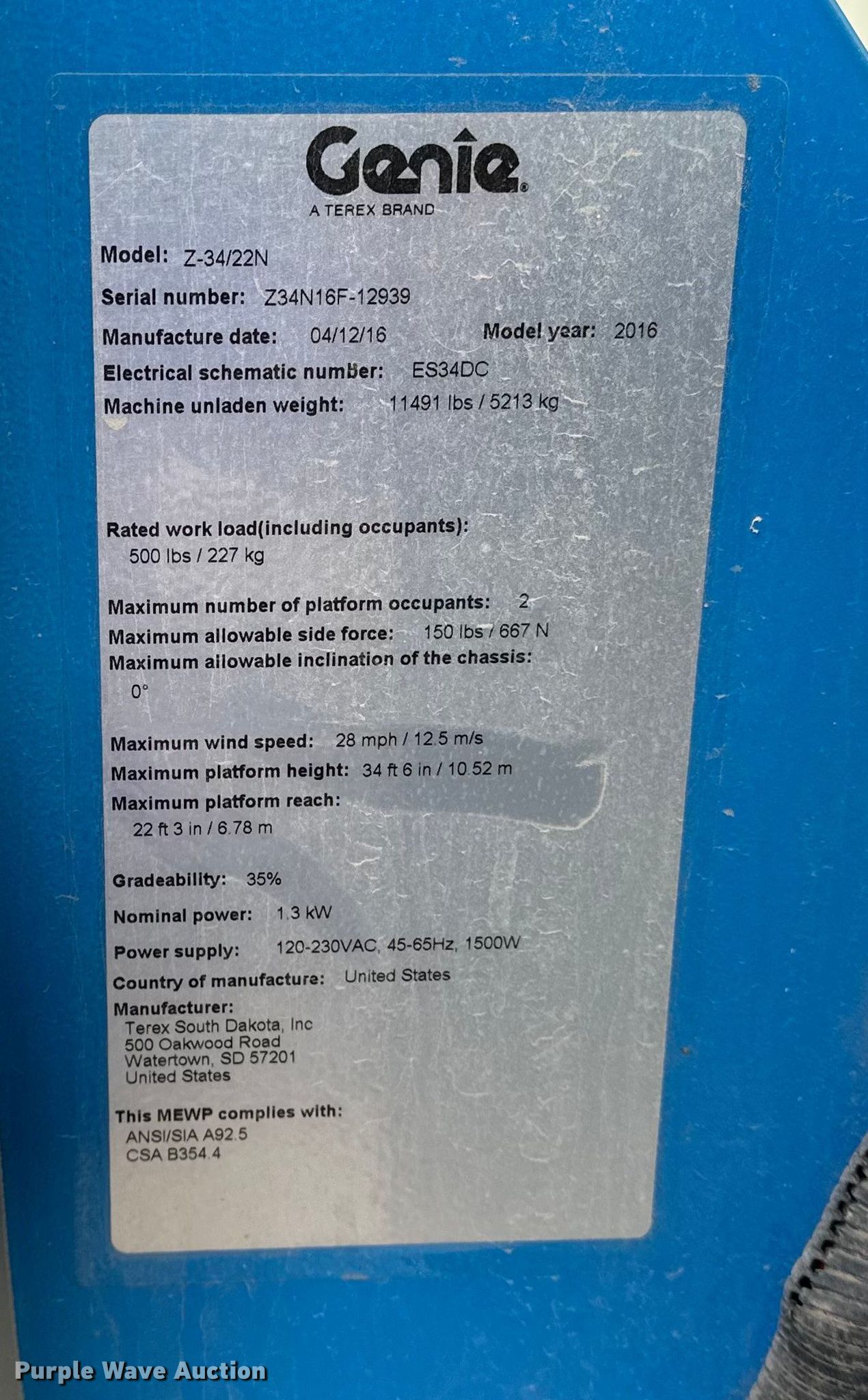 2016 Genie Z-34/22N boom lift. Hours: 566 on meter, Serial: Z34N16G-12939, Unit #: 21. Electric Motor Genie 140-22-4001 Serial: 033885, Volts: 48. Features Boom type: Articulating, Telescopic, Maximum lift capacity: 500 lbs, Maximum reach length: 22' 3", Maximum lift height: 34' 6", Hydraulic extendable jib, Platform: 28" L x 55" W, AC power outlet, Controls: Platform, Ground, Platform rotation: Hydraulic. Tires Tire size: 22x7, Solid. Notes Drive hubs disengaged, Unknown operating condition. Harvey & Son Electric. Liberal, KS 67901