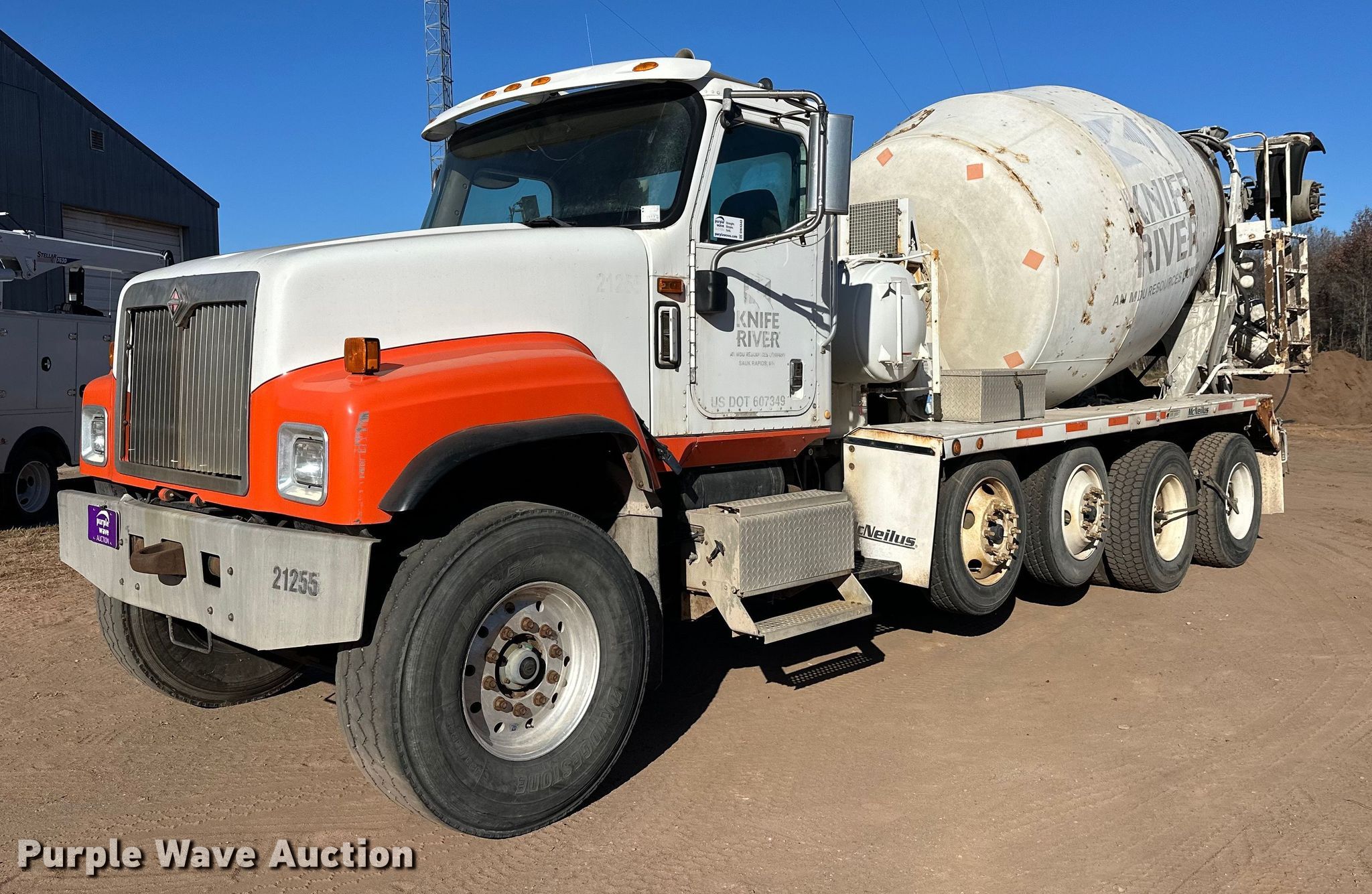 2006 International 5500i ready mix truck. Miles: 365,825 on odometer, Hours: 28,215 on meter, VIN: 1HTXLAHT76J256569, Unit #: 21255. Engine Cummins ISM, Displacement: 10.8L, Cylinders: 6, Fuel type: Diesel. Transmission Eaton Fuller 9LL, Manual, Speed: 11. Chassis Axles: 5, Pusher axle Steerable, Tag axle Steerable, Differential lock: Inter-axle, Suspension: Spring over walking beam, Brakes: Air, PTO, GVWR: 80,000 lbs FAWR: 20,000 lbs, RAWR: 23,000 lbs, Lift axle GAWR: 11,020 lbs. Interior AC, Heat, Heated mirrors, Cruise control. Features Mixer McNeilus, Capacity: 150 cu.yd., Discharge: Rear, In-cab controls, Rear drum controls, Chute Extensions: 3, Chute type: Steel.. Tires Front: 425/65R22.5, Rear: 11R22.5, Lift axle: 255/70R22.5. Notes Tires missing. Minnesota title. Title distribution may be delayed up to 14 days from verification of funds. Knife River. Harris, MN 55032