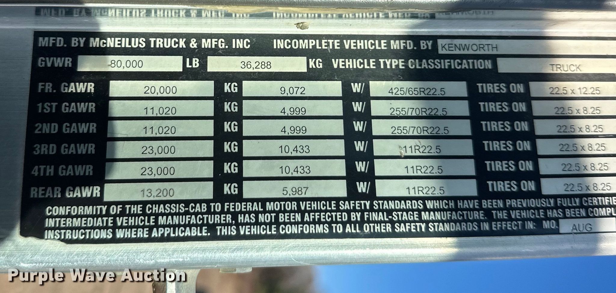 2006 Kenworth W900 ready mix truck. Miles: 313,210 on odometer, Hours: 1,499 on meter, VIN: 1NKWL00X86R121036, Unit #: 21183. Engine Cummins ISM, Displacement: 10.8L, Cylinders: 6, Fuel type: Diesel. Transmission Allison, Automatic. Chassis Axles: 5, Pusher axle Steerable, Tag axle Steerable, Differential lock: Full, Suspension: Spring over walking beam, Brakes: Air, PTO, GVWR: 80,000 lbs FAWR: 20,000 lbs, RAWR: 23,000 lbs, Lift axle GAWR: 11,020 lbs. Interior AC, Heat, Heated mirrors, Cruise control, Backup camera. Features Mixer McNeilus, Capacity: 11 cu.yd., Discharge: Rear, In-cab controls, Rear drum controls, Chute Chute type: Steel.. Tires Front: 425/65R22.5, Rear: 11R22.5, Lift axle: 245/70R22.5. Notes Dash warning indicator: Check engine, Windshield chipped or cracked, Non-operational mixer. Minnesota title. Title distribution may be delayed up to 14 days from verification of funds. Knife River. Little Falls, MN 56345