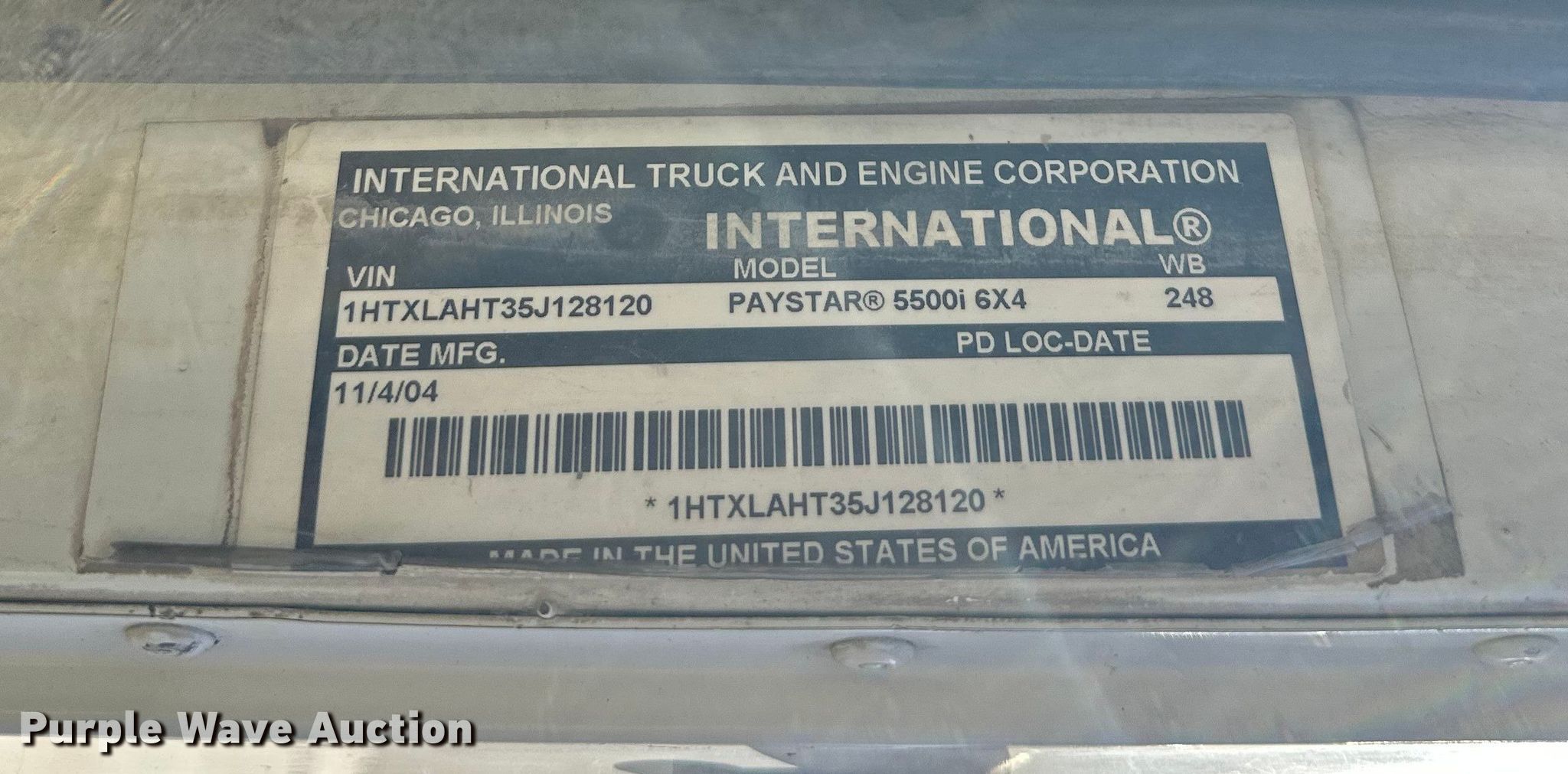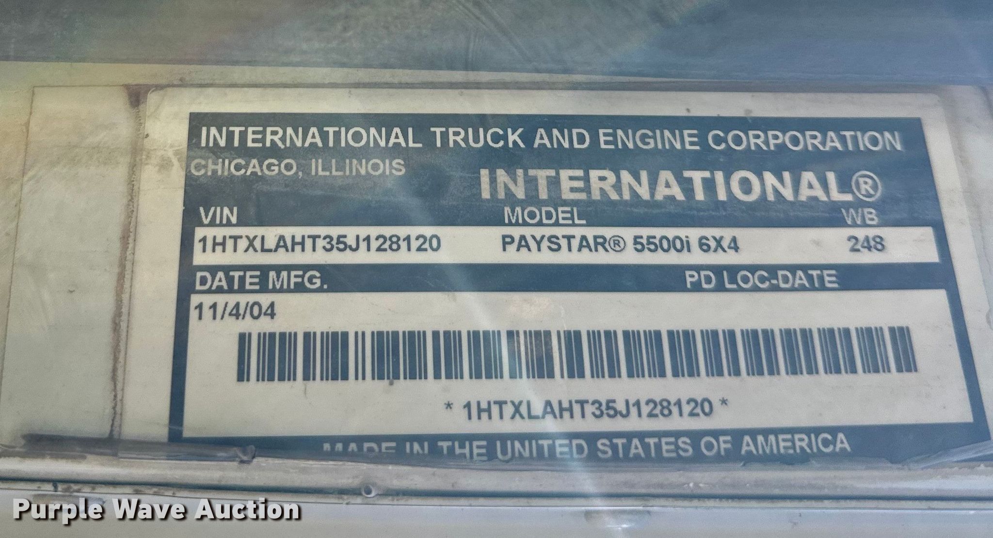 2005 International 5500i ready mix truck. Miles: 256,371 on odometer, Hours: 24,530 on meter, VIN: 1HTXLAHT35J128120. Engine Cummins ISM 320V, Displacement: 10.8L, Cylinders: 6, Fuel type: Diesel. Transmission Eaton Fuller 9LL, Manual, Speed: 11. Chassis Axles: 5, Pusher axle Steerable, Tag axle Steerable, Differential lock: Inter-axle, Suspension: Spring over walking beam, Brakes: Air, PTO, GVWR: 80,000 lbs FAWR: 20,000 lbs, RAWR: 23,000 lbs, Lift axle GAWR: 11,020 lbs, Wheelbase: 248". Interior AC, Heat, Heated mirrors, Cruise control. Features Mixer McNeilus, Serial: 72902-24219, Capacity: 11 cu.yd., Discharge: Rear, In-cab controls, Rear drum controls, Water tank capacity: 150 gallons, Chute Extensions: 3, Chute type: Steel.. Tires Front: 425/65R22.5, Rear: 11R22.5, Lift axle: 255/70R22.5. Notes Dash warning indicator: ABS. Minnesota title. Title distribution may be delayed up to 14 days from verification of funds. Knife River. Little Falls, MN 56345