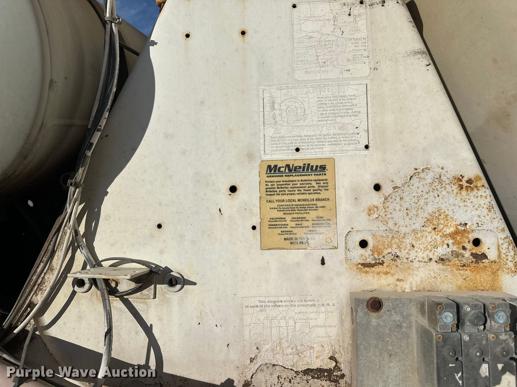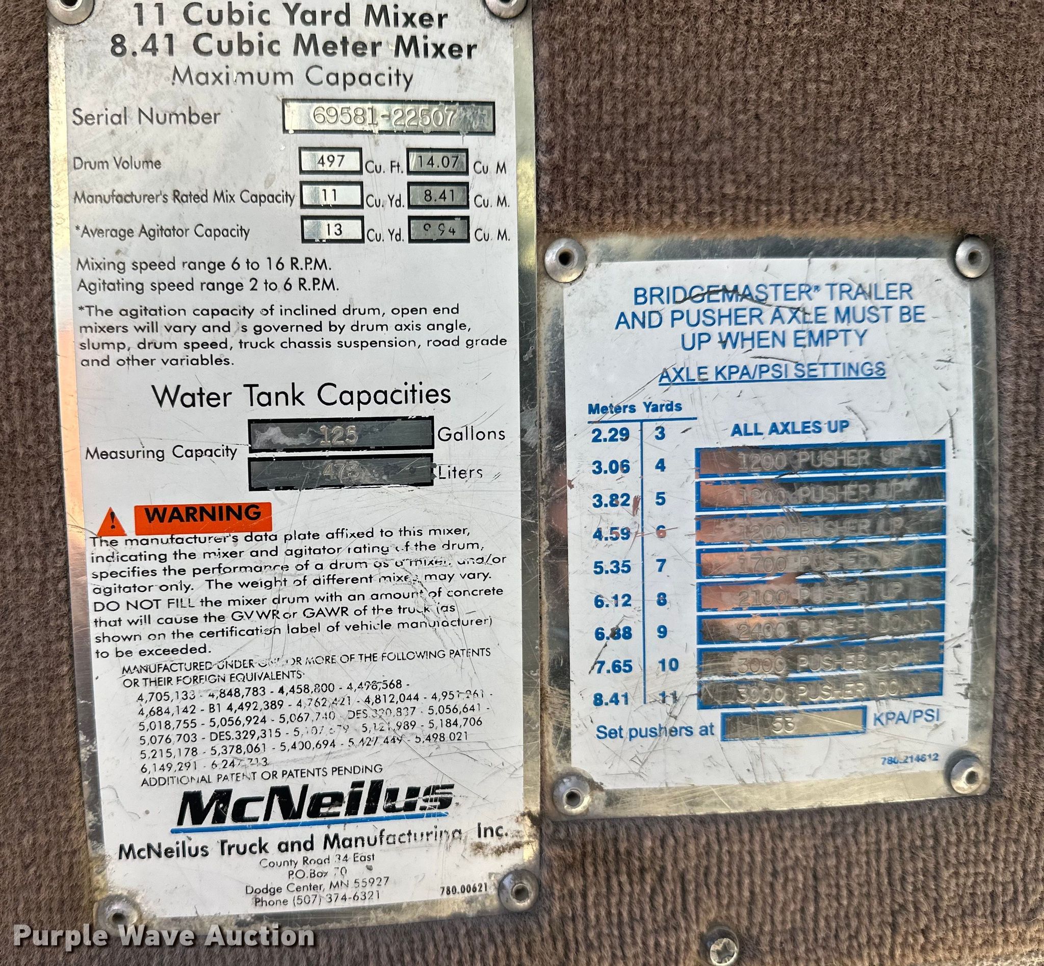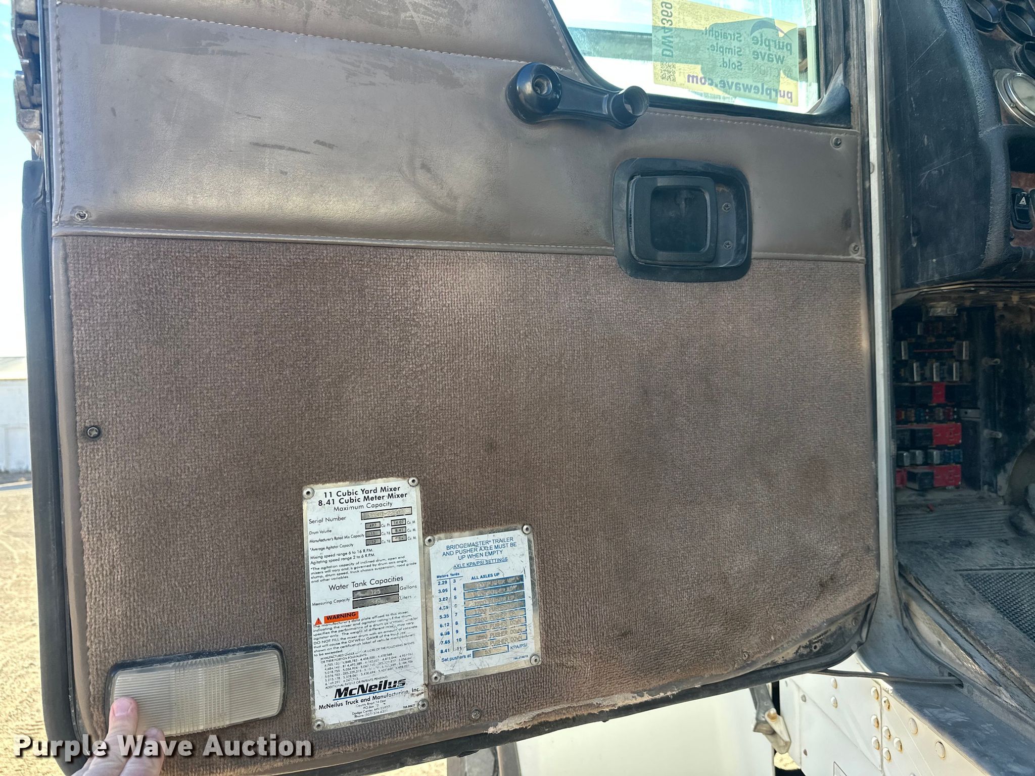 2005 Kenworth W900 ready mix truck. Miles: 252,025 on odometer, Hours: 38 on meter, VIN: 1NKWL0EX55R075057. Engine Cummins ISM, Displacement: 11.0L, Cylinders: 6, Fuel type: Diesel, HP: 280.00. Transmission Allison, Automatic. Chassis Axles: 4, Pusher axle Steerable, Tag axle Steerable, Differential lock: Full, Suspension: Spring over walking beam, Brakes: Air, PTO, GVWR: 80,000 lbs FAWR: 20,000 lbs, RAWR: 23,000 lbs, Lift axle GAWR: 8,900 lbs. Interior AC, Heat, Heated mirrors, Cruise control, Backup camera. Features Mixer Mcnelius, Serial: 69581-22507, Capacity: 11 cu.yd., Discharge: Rear, In-cab controls, Rear drum controls, Water tank capacity: 125 gallons, Chute Extensions: 3, Chute type: Aluminum.. Tires Front: 425/65R22.5, Rear: 11R22.5, Lift axle: 215/75R17.5. Notes Dash warning indicator: Check engine, ABS. Minnesota title. Title distribution may be delayed up to 14 days from verification of funds. NBR Inc.. Braham, MN 55006