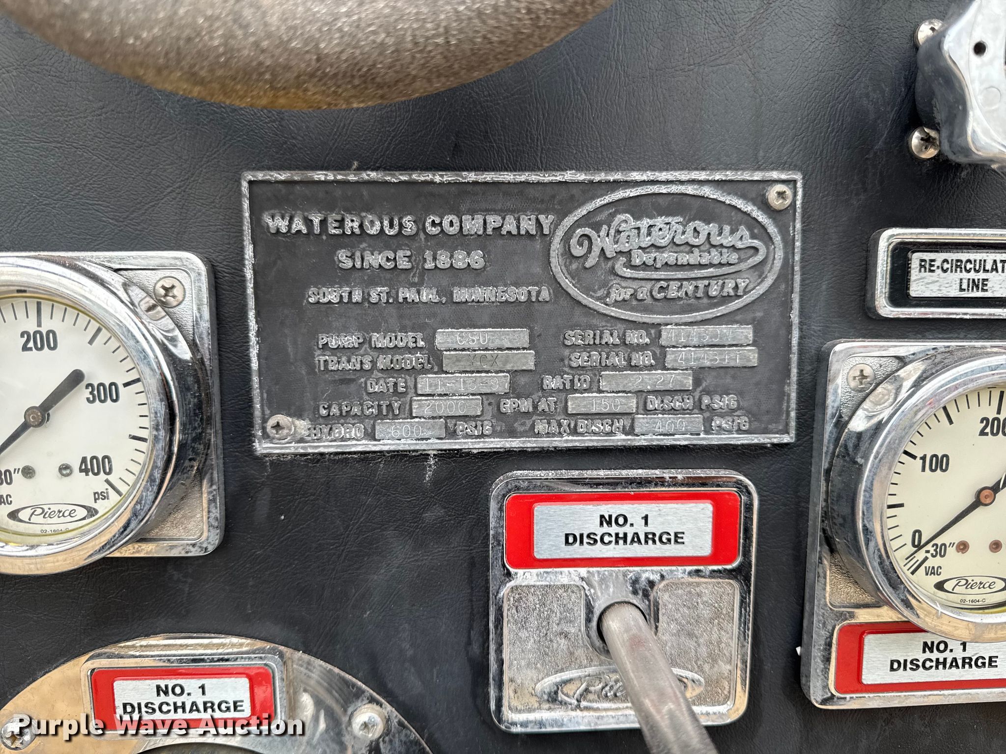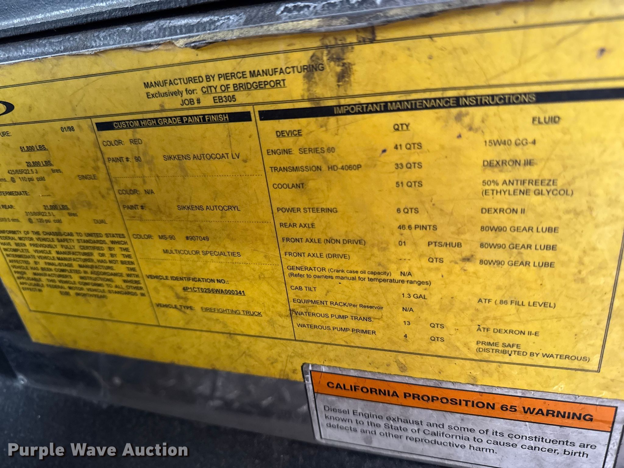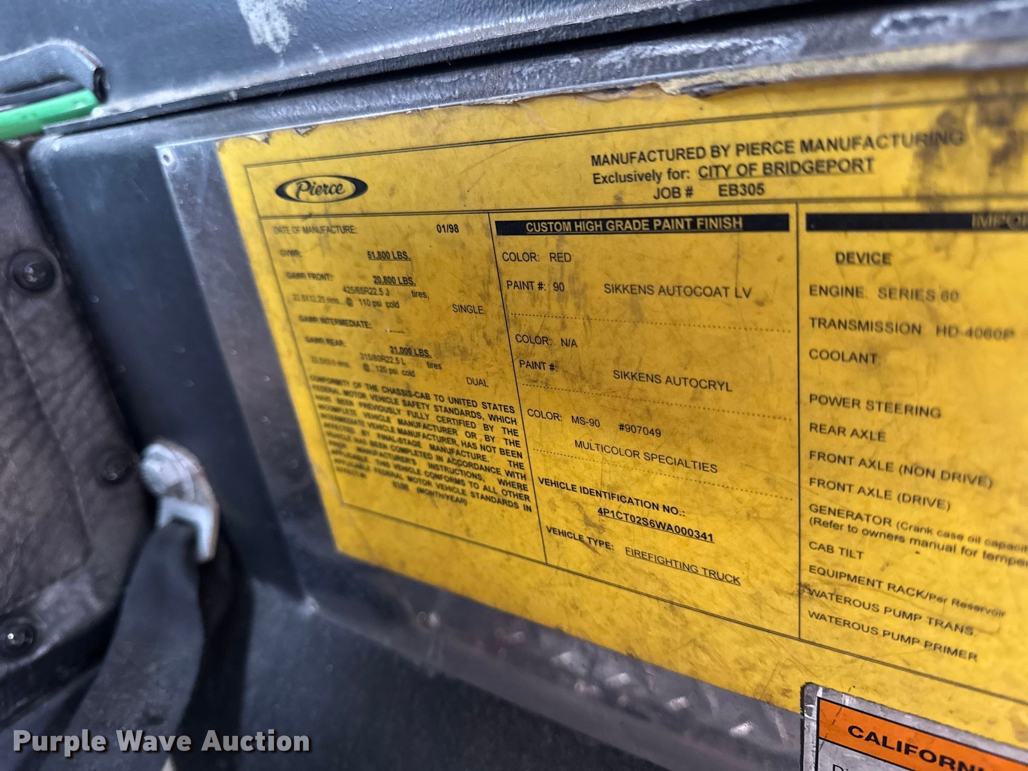 1998 Pierce Tilt Cab fire truck. Miles: Unknown, Hours: 13,635 on meter, VIN: 4P1CT02S6WA000341. Engine Detroit Diesel S60, Displacement: 12.7L, Cylinders: 6, Fuel type: Diesel. Transmission Allsion, Automatic. Chassis Axles: Single, Suspension: Spring, Brakes: Air, GVWR: 51,800 lbs. Interior AC, Heat. Features Fire truck body Pierce, Elevated deck gun, Pump 2,000 gpm, Ground ladder. Tires Front: 425/65R22.5, Rear: 315/80R22.5. Notes Non-operational odometer. Wisconsin title. Mileage has not been verified. Exempt will be written in the odometer disclosure on the title. Title distribution may be delayed up to 14 days from verification of funds. Specialty Truck. Bonduel, WI 54107