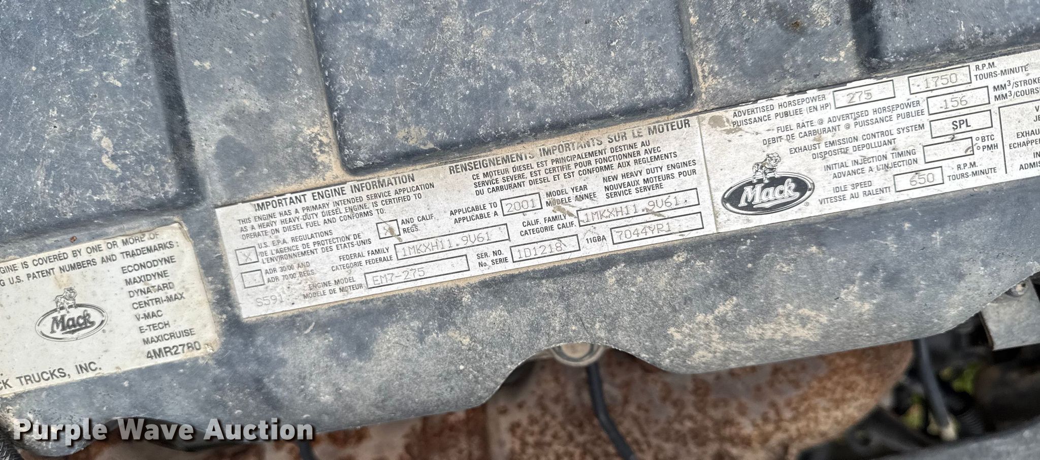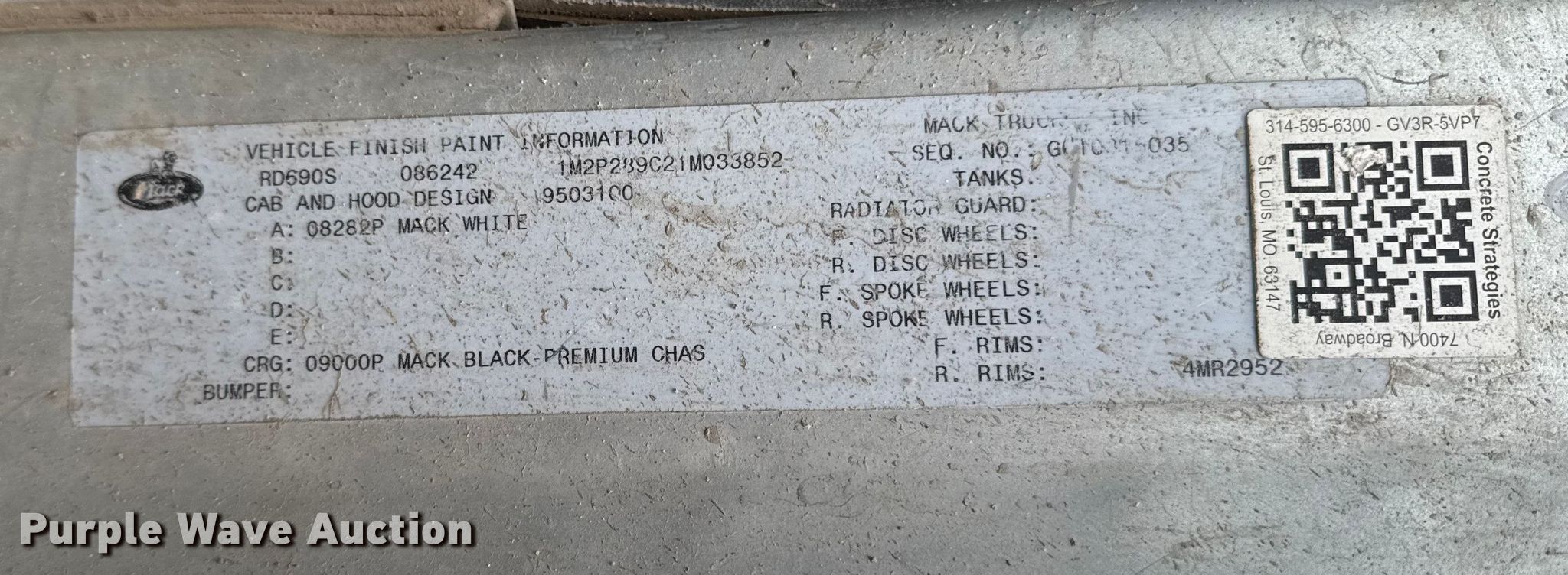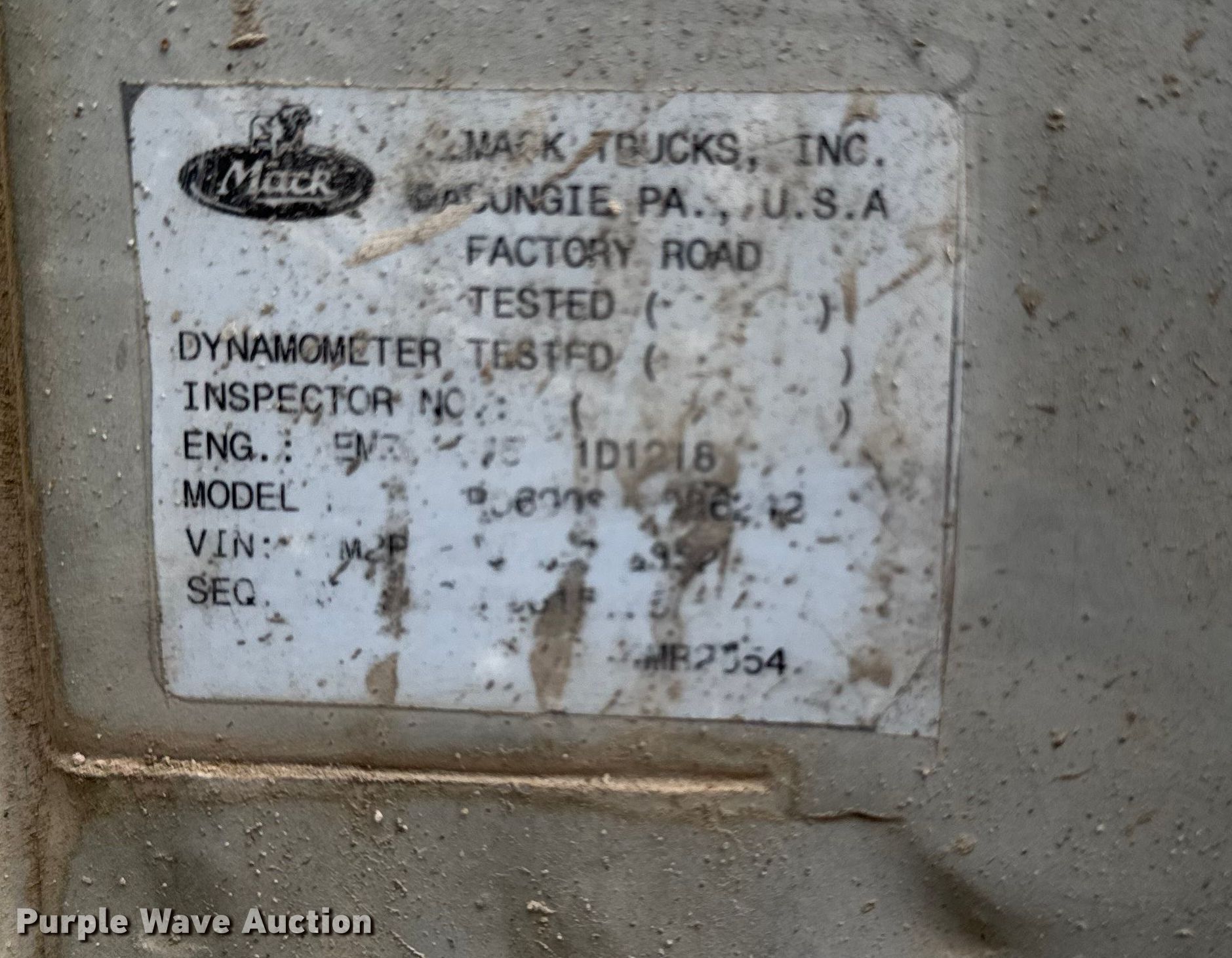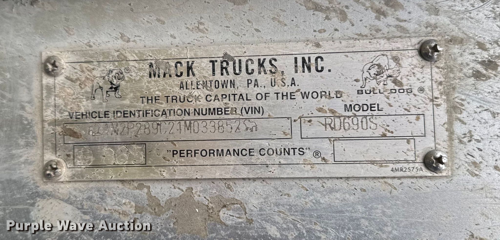 2001 Mack RD690S ready mix truck. Miles: 59,997 on odometer, Hours: 11,011 on meter, VIN: 1M2P289C21M033852. Engine Mack EM7-275, Serial: 1D1218, Displacement: 12.0L, Cylinders: 6, Fuel type: Diesel, HP: 275. Transmission Mack Maxitorque T2070, Manual, Speed: 7. Chassis Axles: Triple, Tag axle, Suspension: Camelback, Brakes: Air, PTO, Front mount PTO. Interior AC, Heat, Cruise control. Features Mixer Discharge: Rear, In-cab controls, Rear drum controls, Chute Chute type: Steel.. Tires Front: 385/65R22.5, Rear: 11R22.5, Lift axle: 296/75R22.5. Notes Unknown operating condition of mixer, Unknown operating condition of PTO, disconnected, Non-operational drivers side door. Kansas title. Seller is a Wisconsin licensed motor vehicle dealer. The buyer may be required to pay sales tax and/or registration fees to the dealer prior to taking possession. Buyers may be required to provide identification to the licensed dealer to comply with state laws. Title will be assigned and distributed by the dealer. Please contact the seller for distribution questions. Specialty Truck. Bonduel, WI 54107