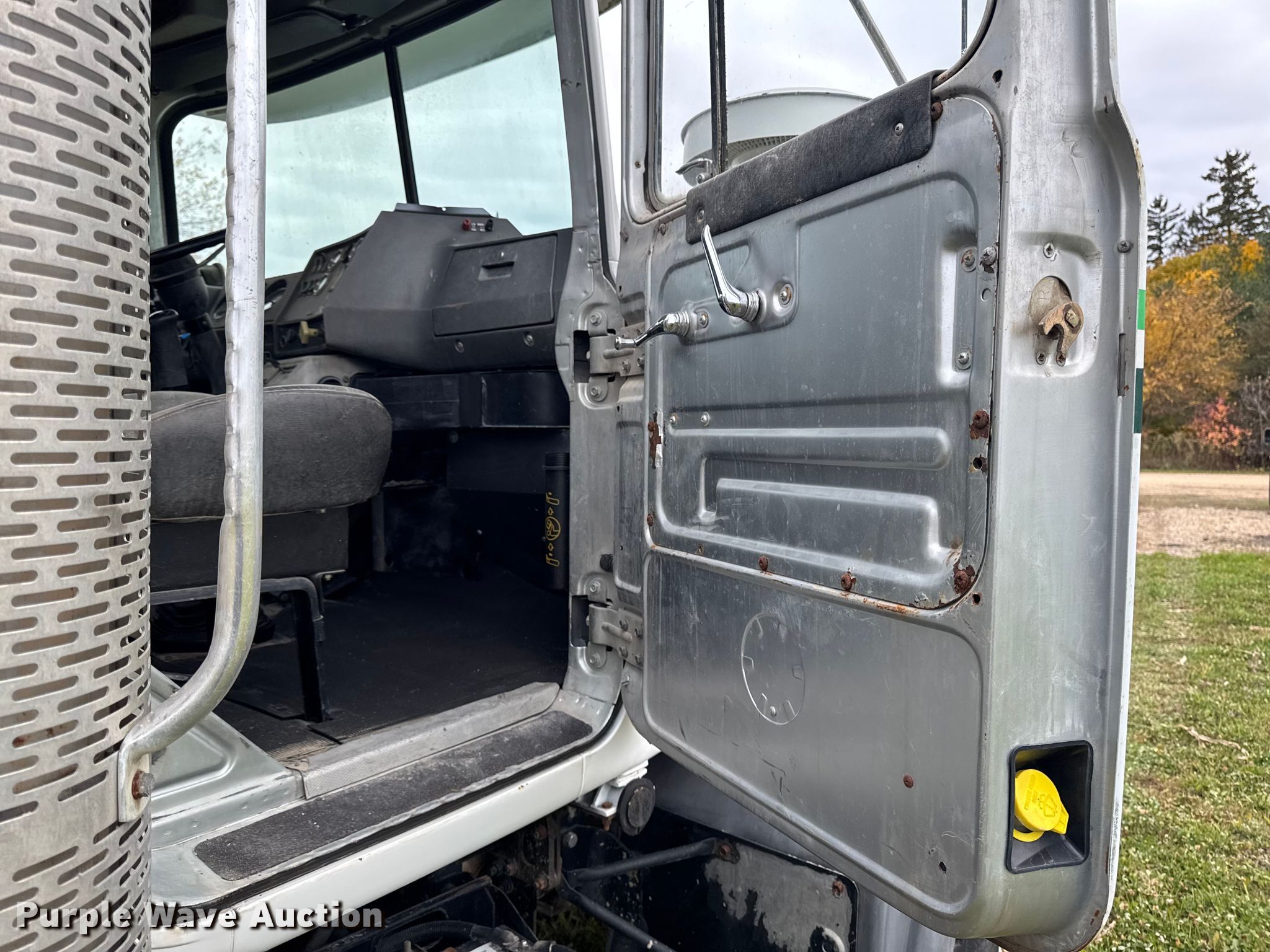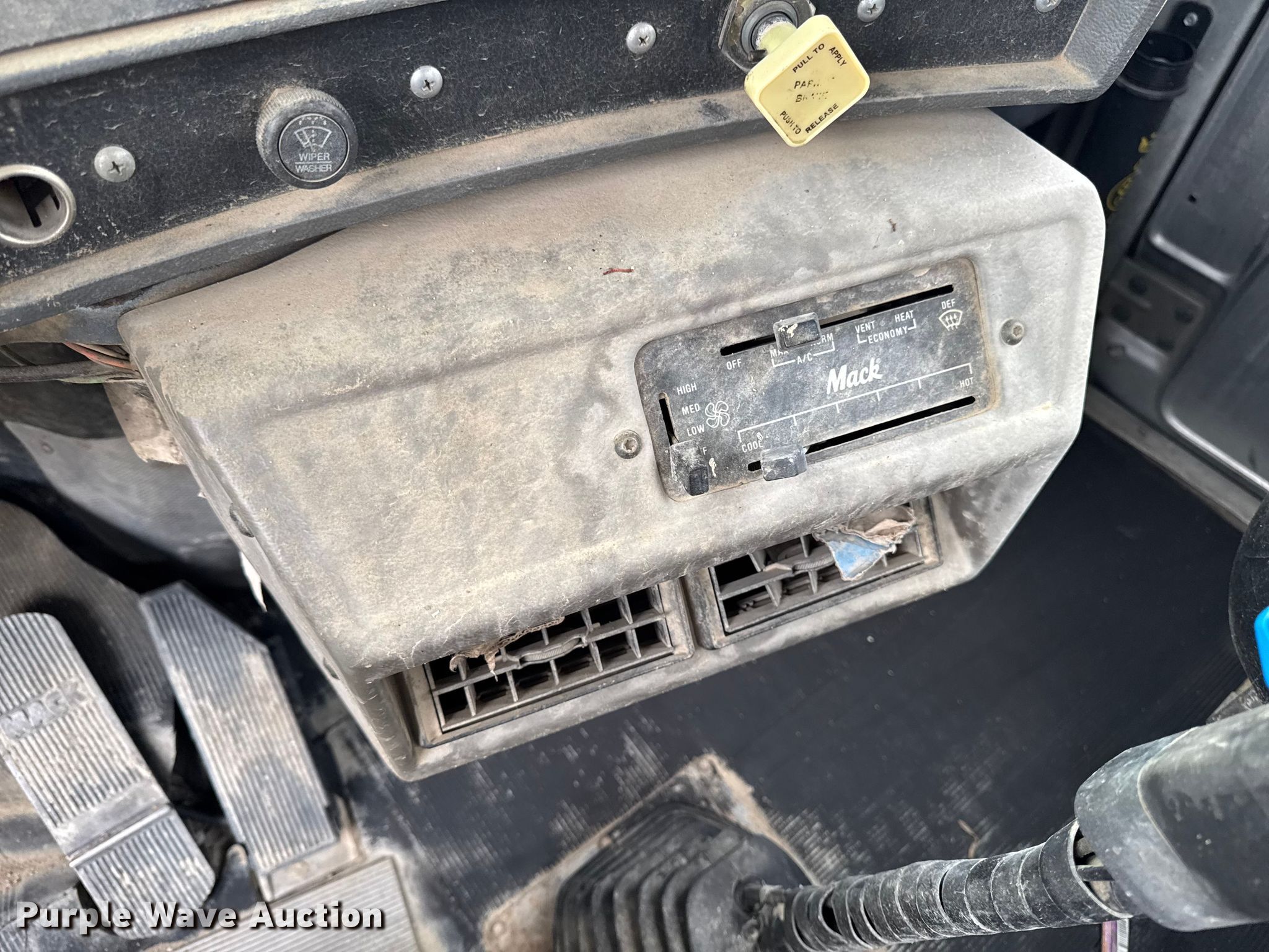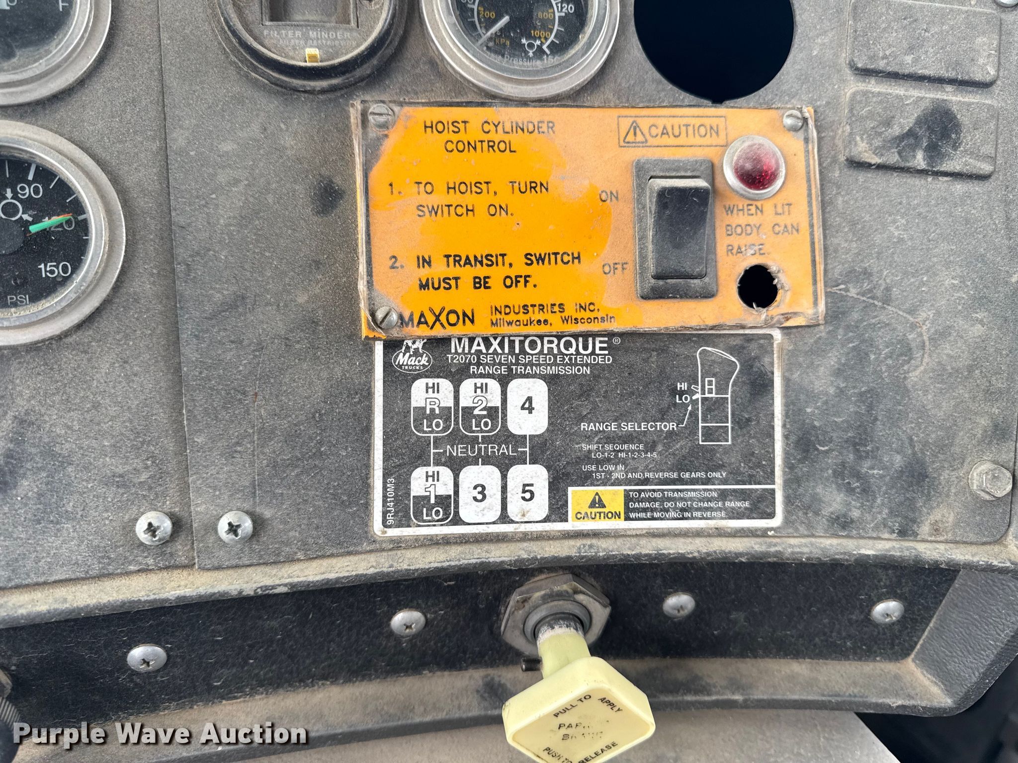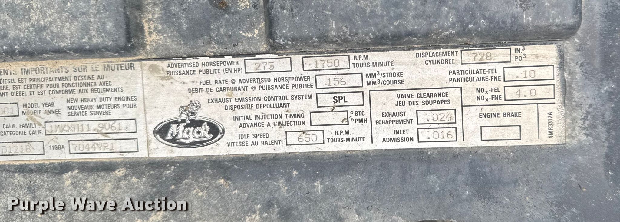 2001 Mack RD690S ready mix truck. Miles: 59,997 on odometer, Hours: 11,011 on meter, VIN: 1M2P289C21M033852. Engine Mack EM7-275, Serial: 1D1218, Displacement: 12.0L, Cylinders: 6, Fuel type: Diesel, HP: 275. Transmission Mack Maxitorque T2070, Manual, Speed: 7. Chassis Axles: Triple, Tag axle, Suspension: Camelback, Brakes: Air, PTO, Front mount PTO. Interior AC, Heat, Cruise control. Features Mixer Discharge: Rear, In-cab controls, Rear drum controls, Chute Chute type: Steel.. Tires Front: 385/65R22.5, Rear: 11R22.5, Lift axle: 296/75R22.5. Notes Unknown operating condition of mixer, Unknown operating condition of PTO, disconnected, Non-operational drivers side door. Kansas title. Seller is a Wisconsin licensed motor vehicle dealer. The buyer may be required to pay sales tax and/or registration fees to the dealer prior to taking possession. Buyers may be required to provide identification to the licensed dealer to comply with state laws. Title will be assigned and distributed by the dealer. Please contact the seller for distribution questions. Specialty Truck. Bonduel, WI 54107