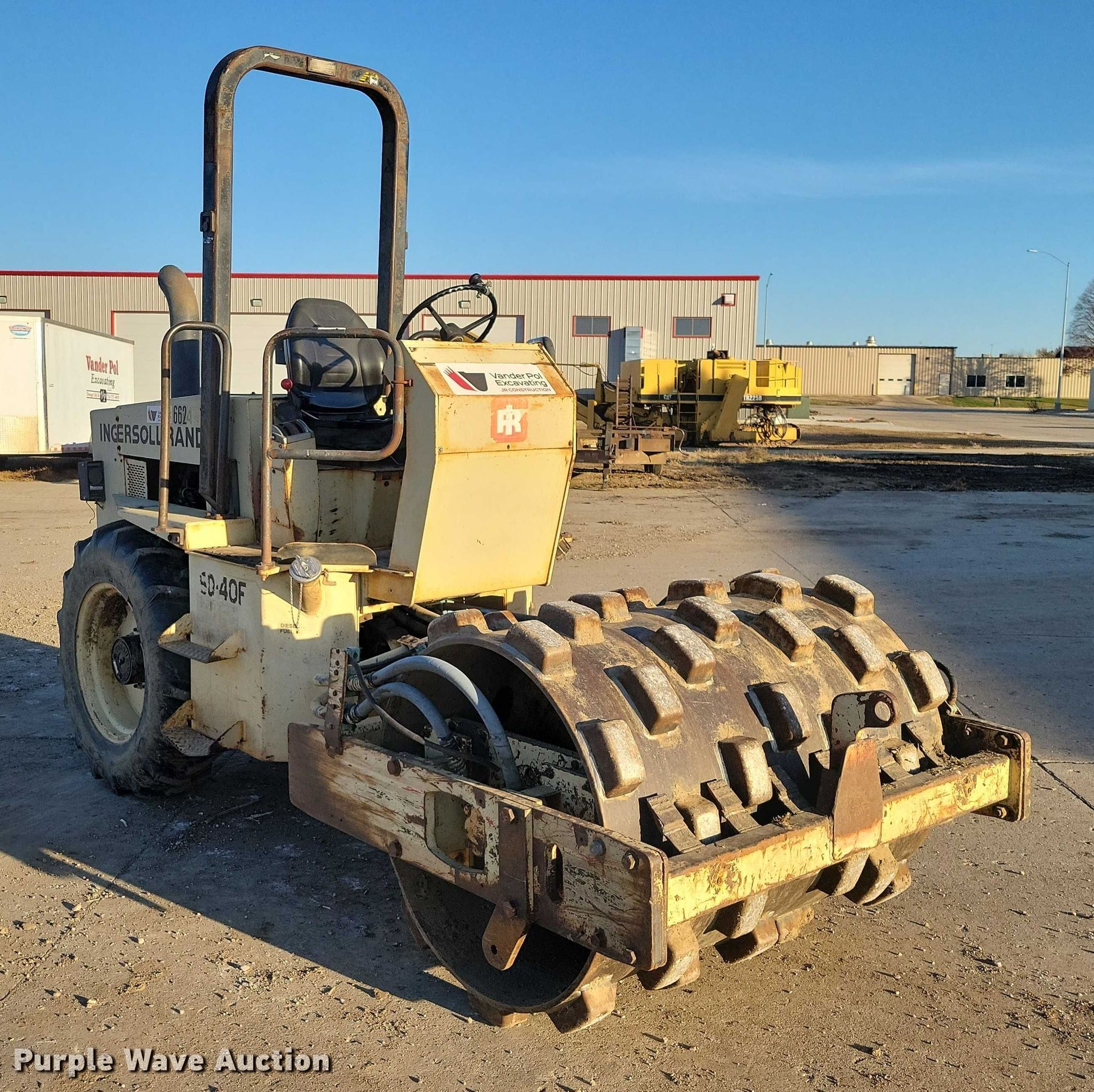 Ingersoll Rand SD-40F single drum vibratory roller. Engine. Cylinders: 4, Fuel type: Diesel. Transmission Hydrostatic. Operators station OROPS. Features Drum Drum type: Padfoot, Vibratory system: Single, Width: 56", Diameter: 39", Drum scrapers. Tires Size: 12.4-24. VanderPol Excavating LLC. Orange City, IA 51041