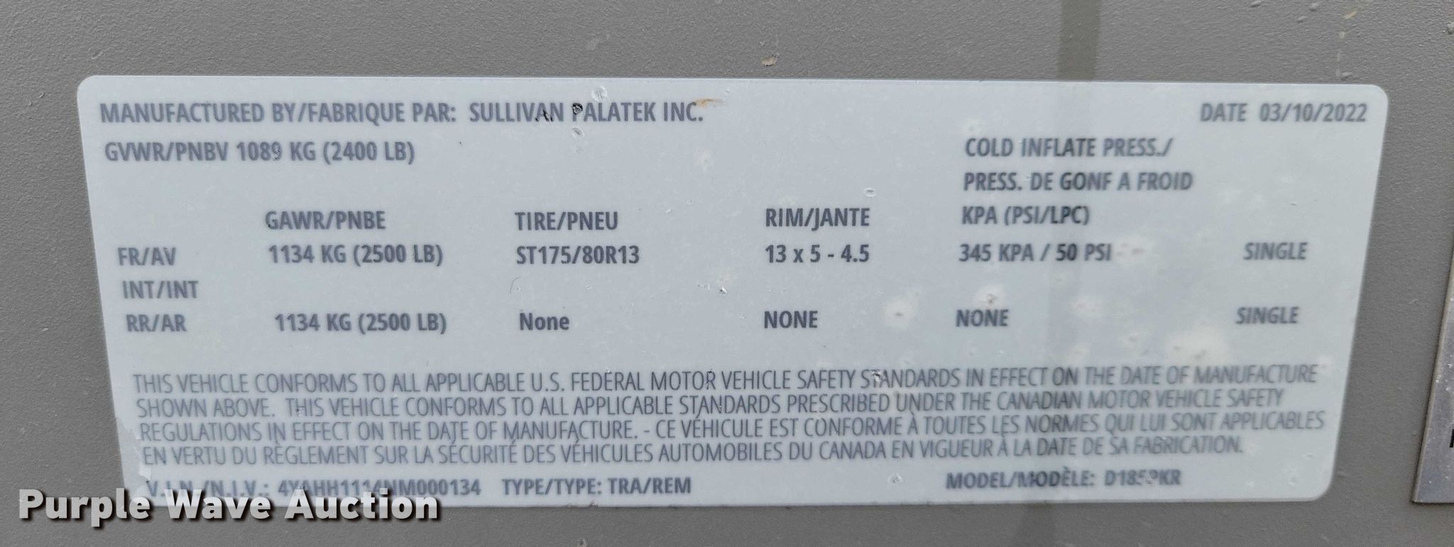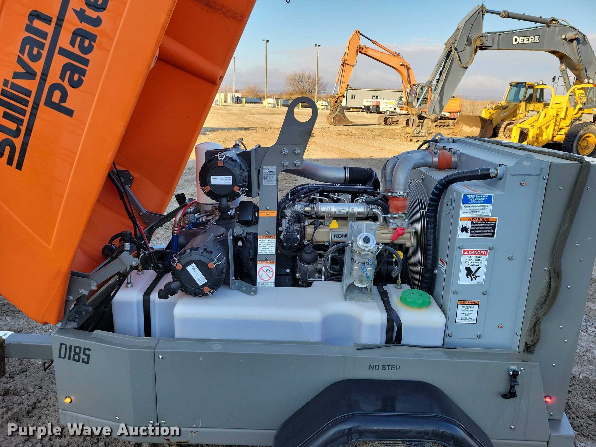 2022 Sullivan Palatek D185PKR air compressor. Hours: 165.9 on meter, VIN: 4YAHH1114NM000134, Serial: 22CP002439. Engine Kohler, Displacement: 1.861L, Cylinders: 3, Fuel type: Diesel. Features Generator Electric start, Fuel tank, Air compressor CFM: 185, PSI: 125. Trailer Ball hitch size: 2", Suspension: Spring, Axles: Single, Tire size: ST175/80R13, GVWR: 2,500 lbs, GAWR: 2,500 lbs. Nebraska title. Title distribution may be delayed up to 14 days from verification of funds. Neuvirth Construction. Crescent, IA 51526