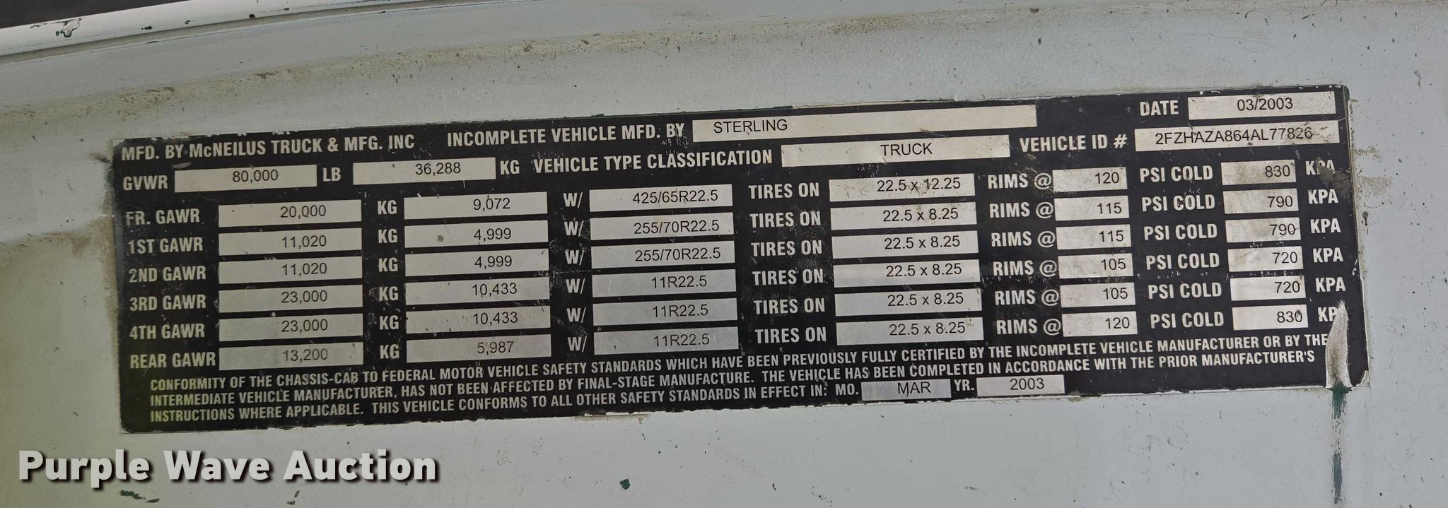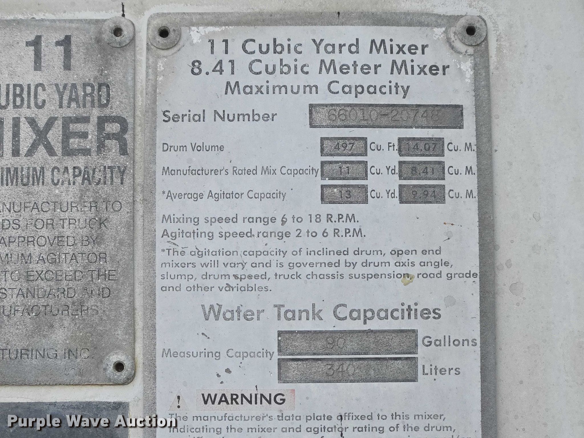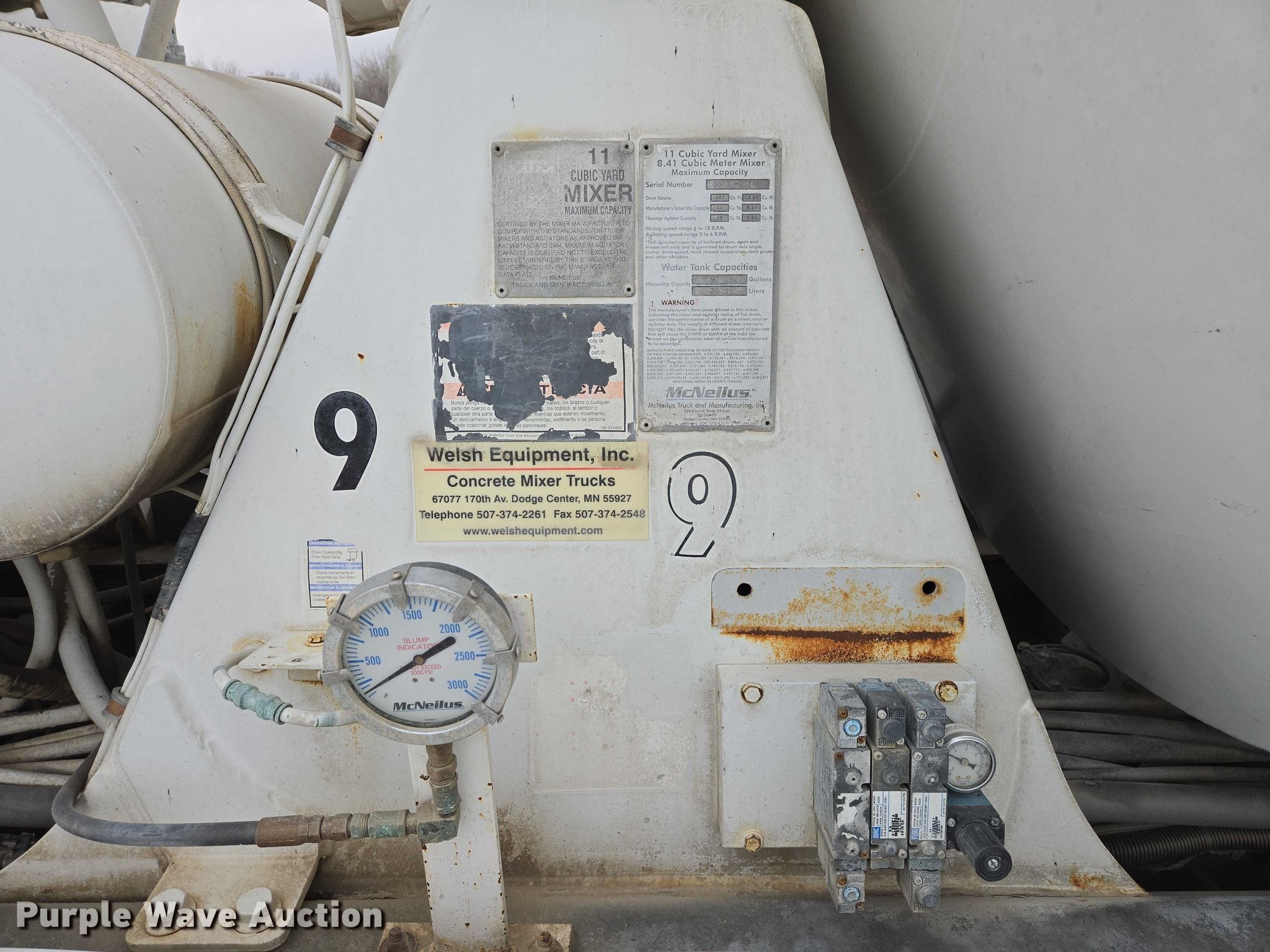 2004 Sterling L9500 ready mix truck. Miles: 246,183 on odometer, VIN: 2FZHAZA864AL77826, Unit #: 9. Engine Cummins ISM, Displacement: 10.8L, Cylinders: 6, Fuel type: Diesel, HP: 280. Transmission Eaton Fuller 9LL, Manual, Speed: 11. Chassis Axles: 5, Pusher axle Steerable, Tag axle Steerable, Differential lock: Full, Suspension: Spring over walking beam, Brakes: Air, PTO. Interior Heat, Heated mirrors, Cruise control. Features Mixer McNeilus, Serial: 66010-20748, Capacity: 11 cu.yd., Discharge: Rear, In-cab controls, Rear drum controls, Water tank capacity: 90 gallons, Chute Extensions: 3, Chute type: Steel.. Tires Front: 425/65R22.5, Rear: 11R24.5, Pusher axles : 255/70R22.5, Tag axle: 11R22.5. Notes Hopper issues, does not go up or down, Non-operational pusher axles switch, Non-operational AC, Two-way radio will be removed prior to auction date. South Dakota title. Title distribution may be delayed up to 14 days from verification of funds. Buffalo Ridge Concrete. 1004 4th Street Southeast. Watertown, SD 57201