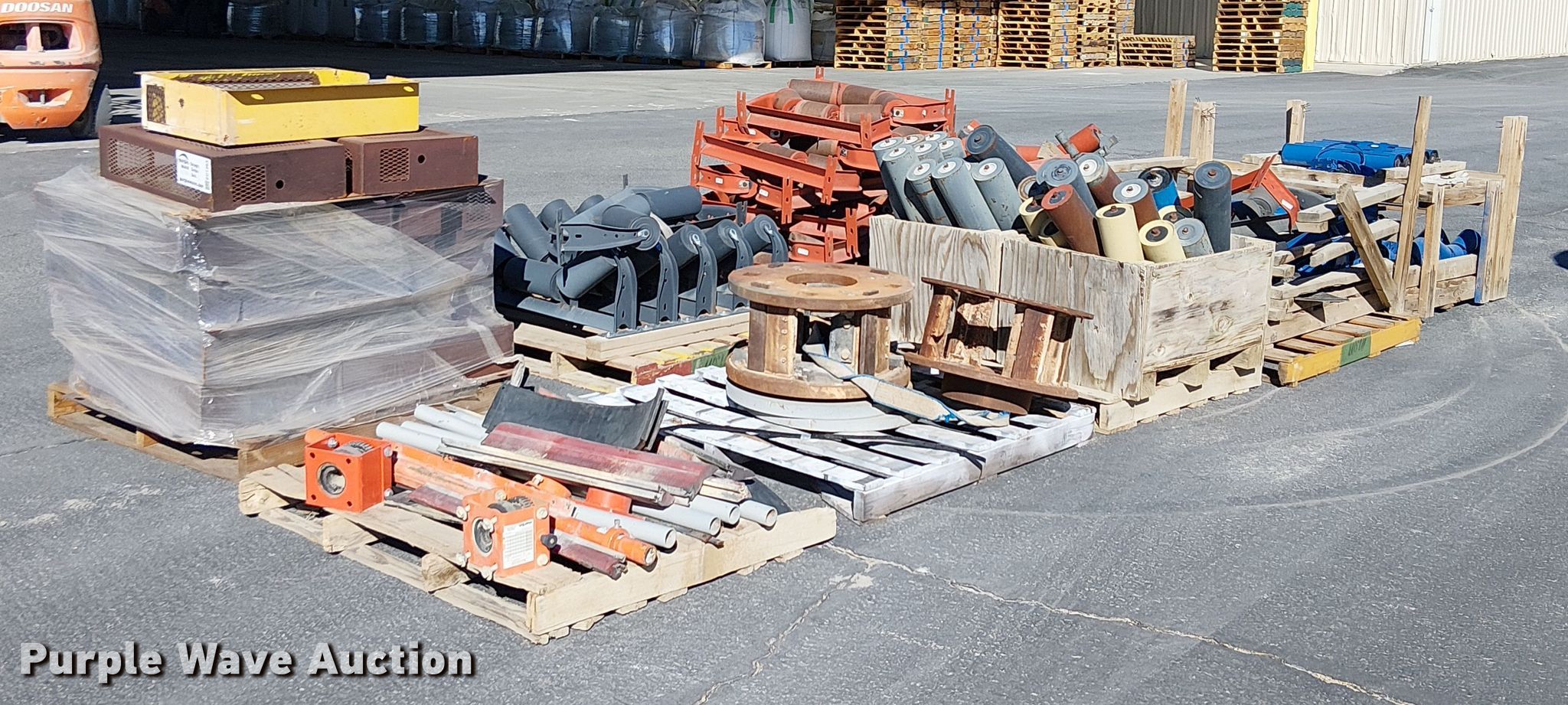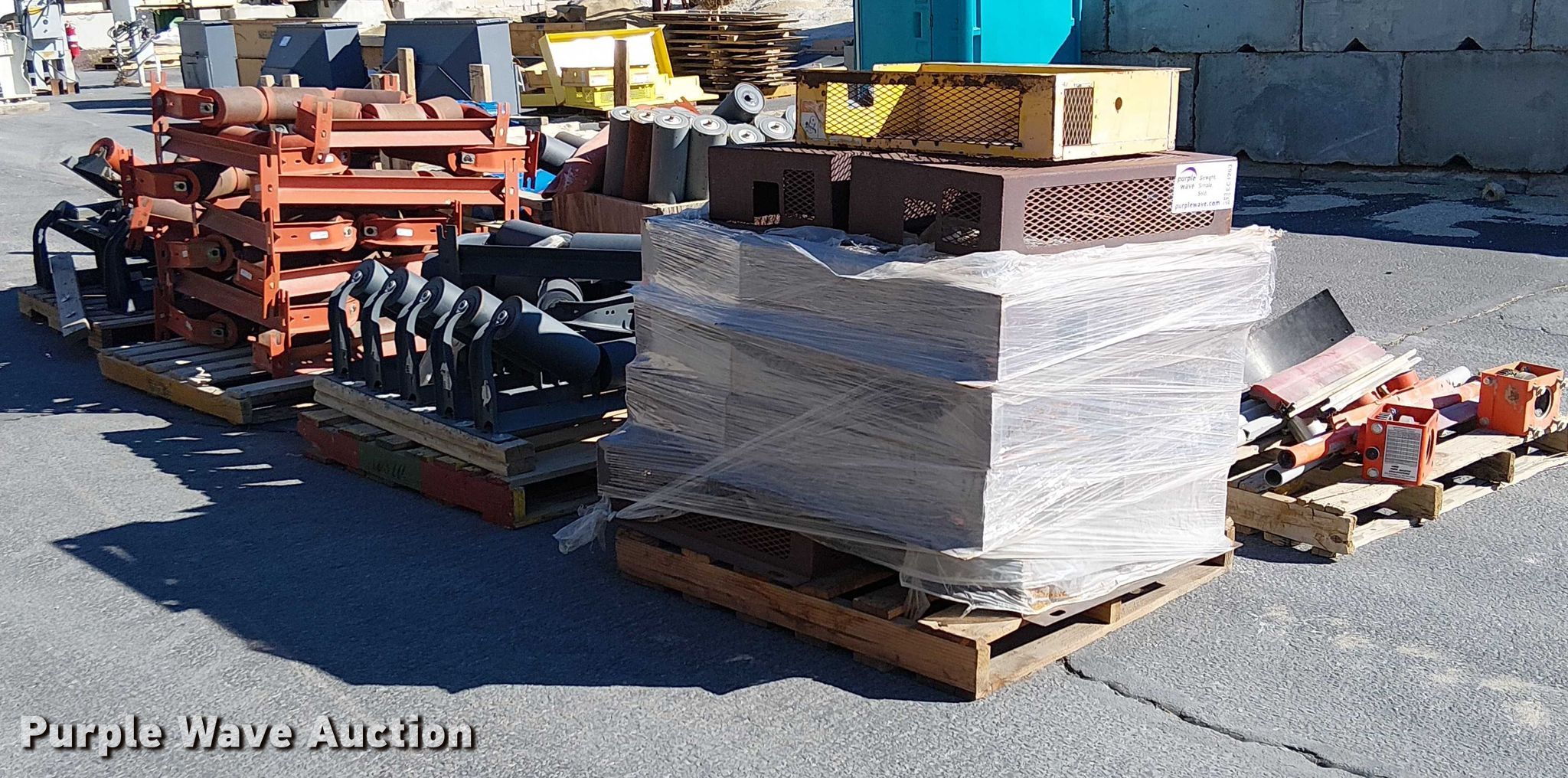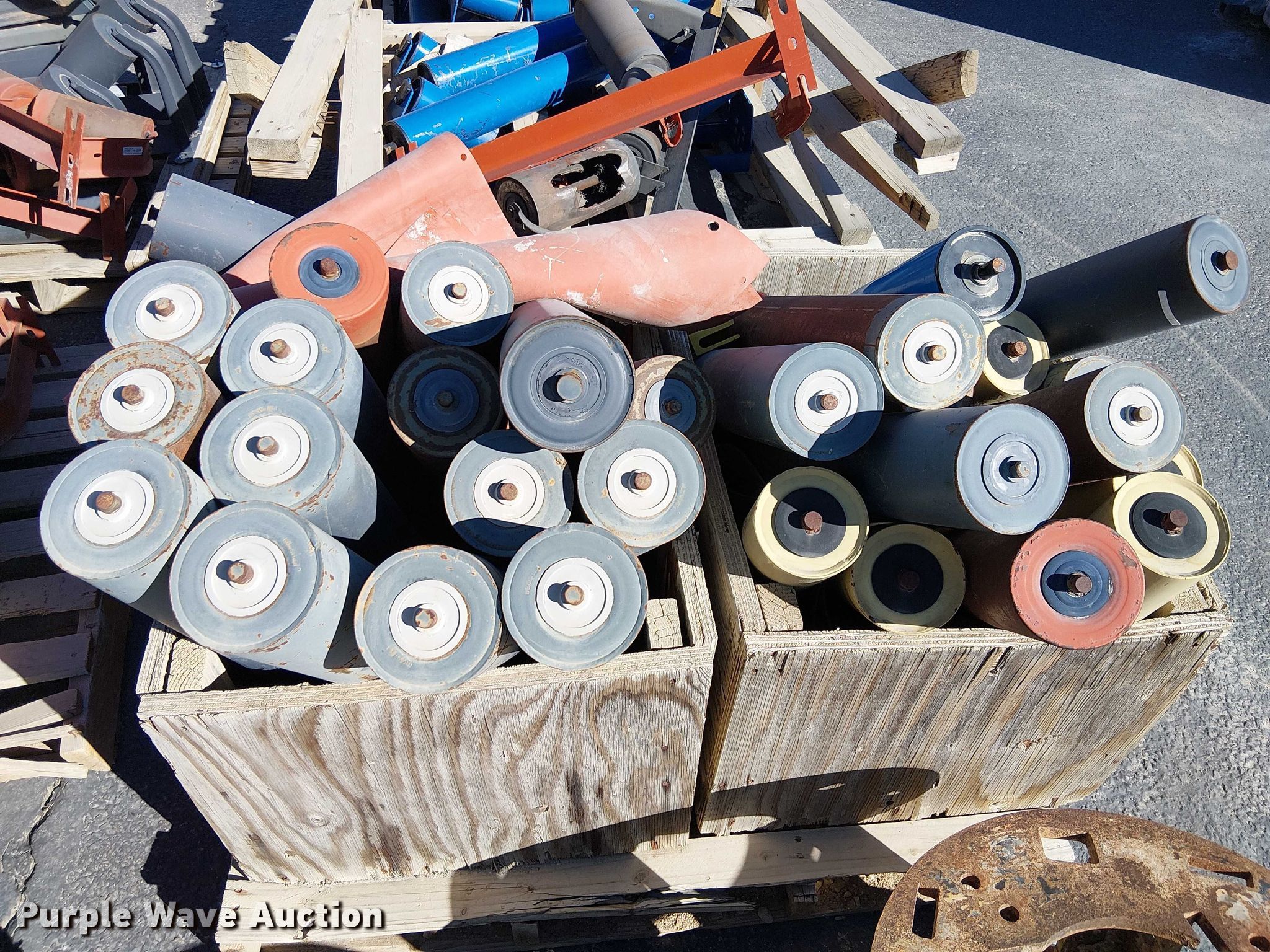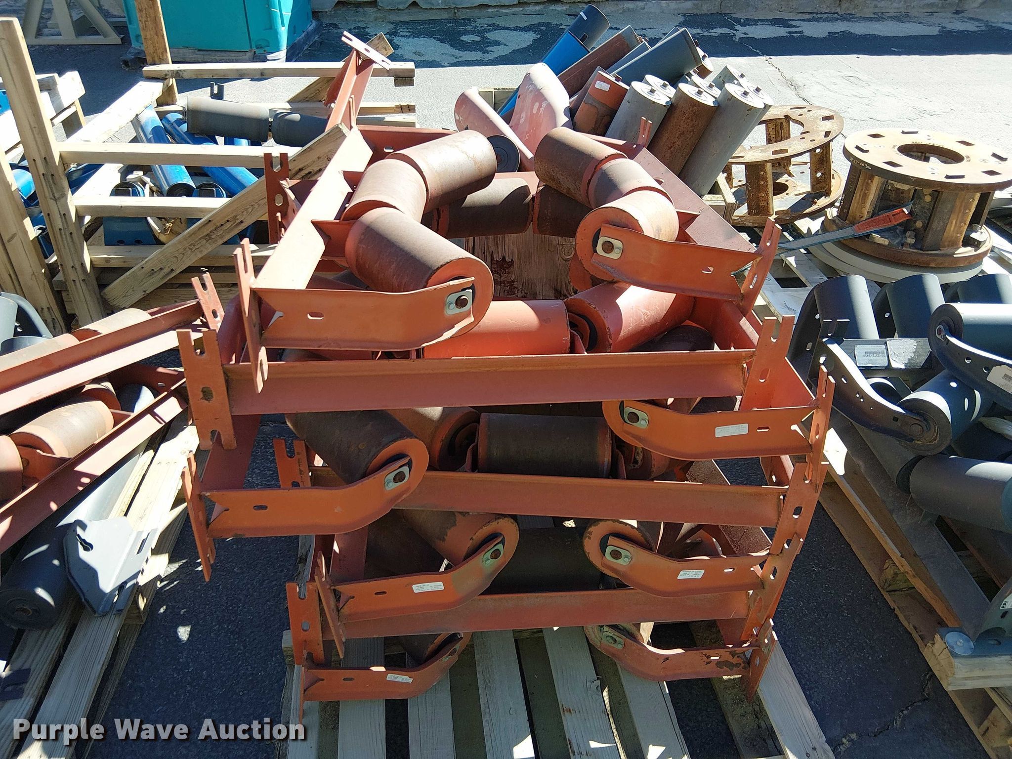 Purple Wave is selling a used Conveyor in California. This item is a (10) pallets of conveyor rollers and parts with the following: Rollers, Some unused, Cone crusher parts, Roller frames