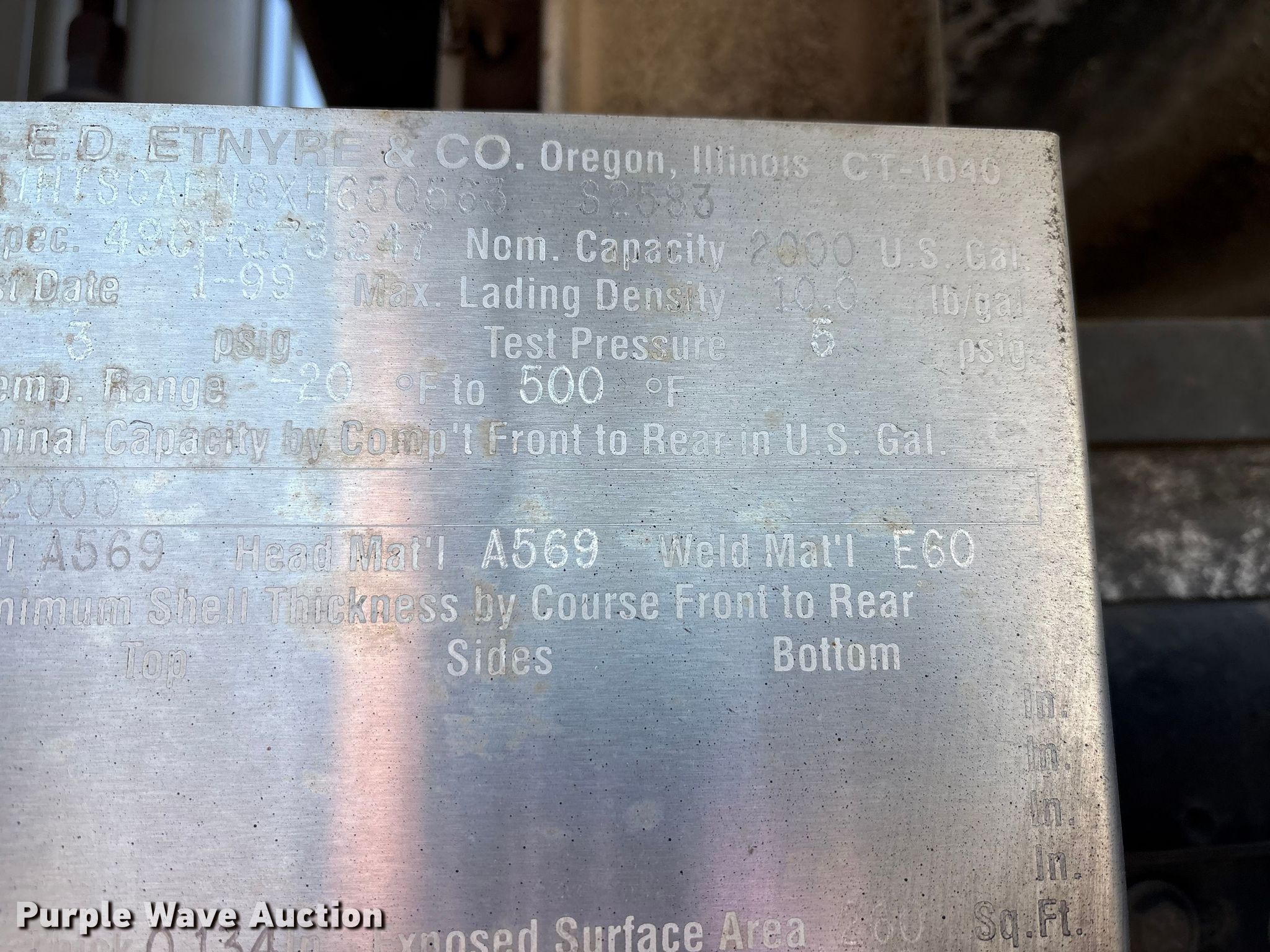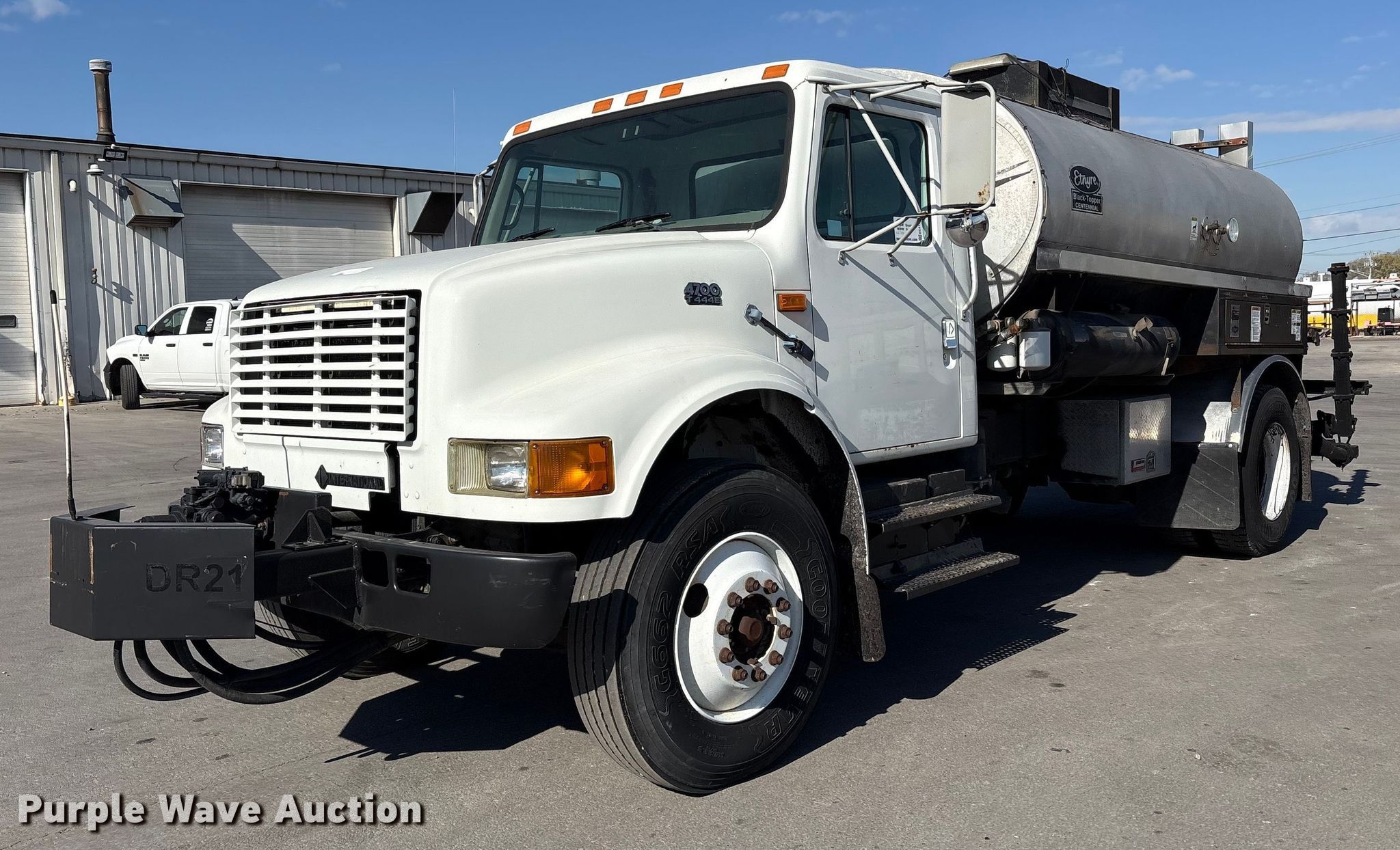 1999 International 4700 tack distributor truck. Miles: 109,917 on odometer, VIN: 1HTSCABN8XH650563. Engine International T444, Displacement: 7.28L, Cylinders: 8, Fuel type: Diesel. Transmission Spicer, Manual, Speed: 5, plus 2. Chassis Axles: Single, Suspension: Spring, Brakes: Air, GVWR: 33,000 lbs. Interior AC, Heat, Cruise control. Features Bed Tank bed, Etnyre Black Topper Centennial, Serial: S2583, Length: 12', Capacity: 2,000 gallons, Burner: LPG, In-cab controls, Spray boom Width: 15', Folding.. Tires Size: 11R22.5. Tanks have not been cleaned, possible residue. Unknown amount or type of contents in tanks. Indiana title. Title distribution may be delayed up to 30 days from verification of funds. Fort Wayne, IN 46809