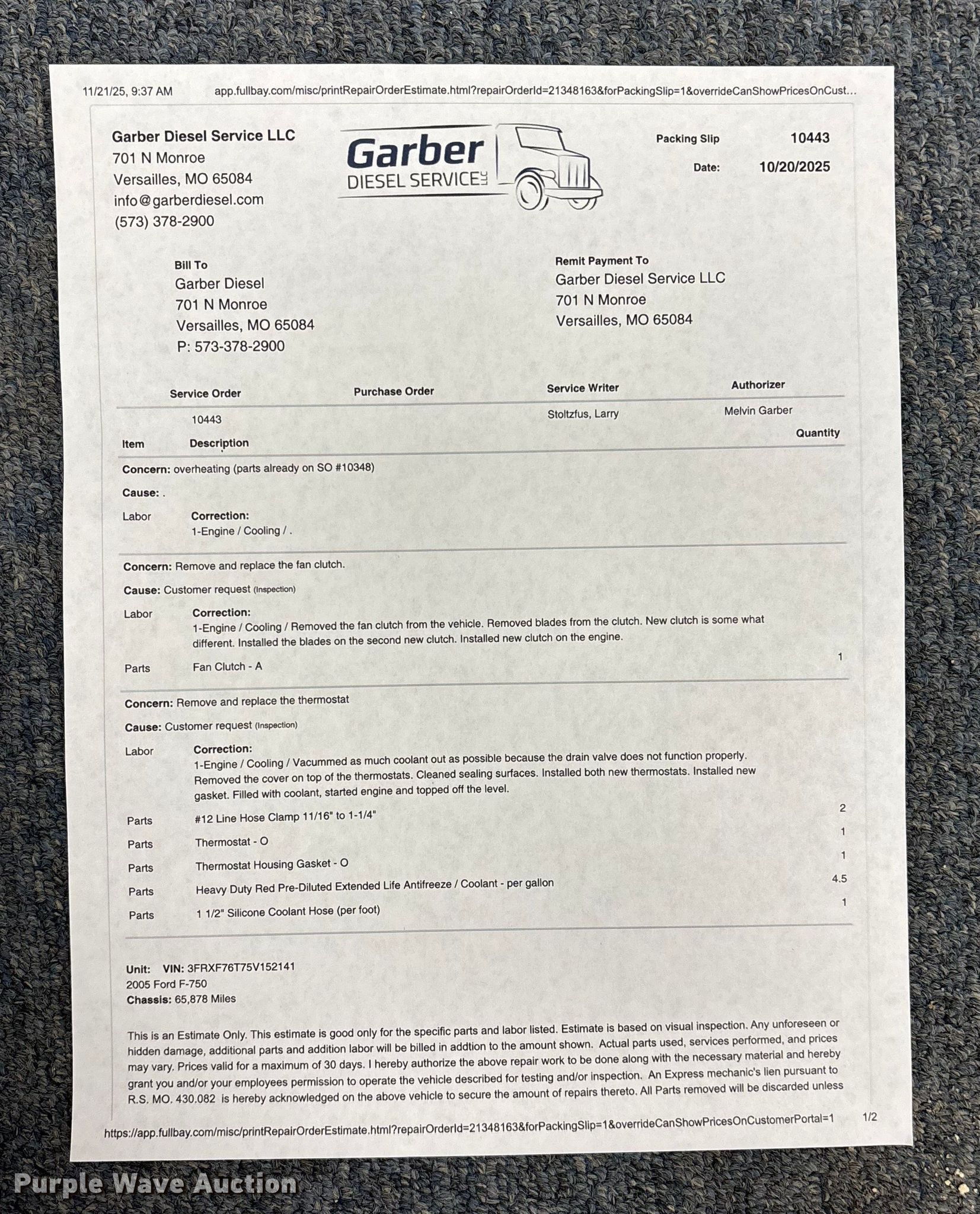 2005 Ford F750 Super Duty XL dump truck for sale in Versailles, Missouri. Item ED2405 will sell on December 18th, 2025.