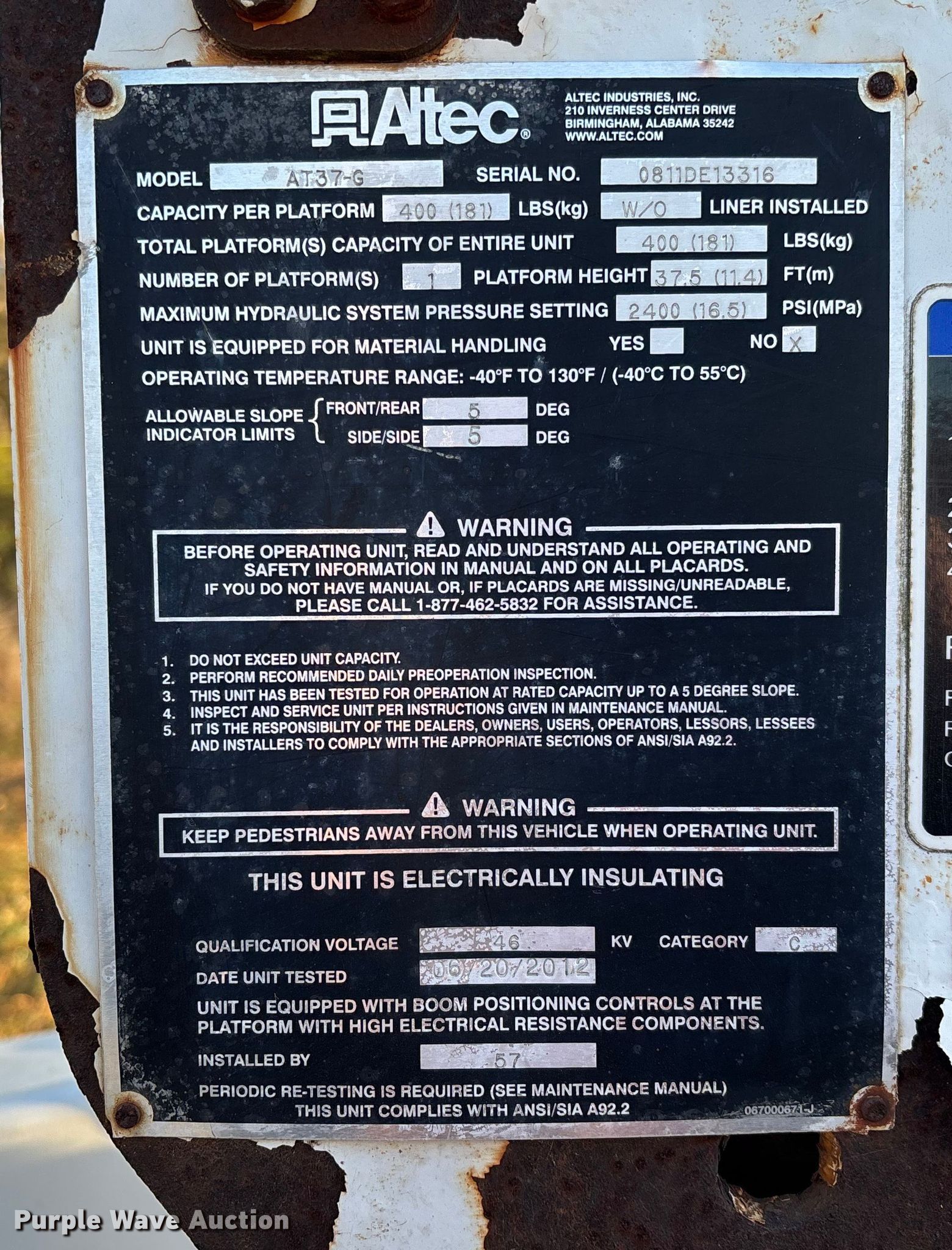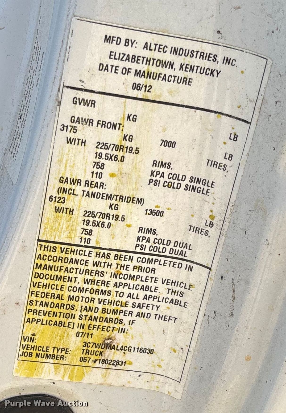 2012 Dodge Ram 5500 bucket truck. Miles: 271,154 on odometer, Hours: 15,935 on meter, VIN: 3C7WDMAL4CG116030. Engine Cummins, Displacement: 6.7L, Cylinders: 8, Fuel type: Diesel. Transmission Automatic. Chassis Axles: Single, Suspension: Spring, Brakes: Hydraulic, PTO, GVWR: 18,750 lbs, Wheelbase: 146". Interior AC, Heat, Cruise control, Auxiliary controls, Brake controller. Features Bed Utility bed, Altec, Serial: 18022831, Length: 9', Width: 7' 10", Boom 2012 Altec AT37-G, Serial: 0811DE13316, Mast height: 37.5', Maximum lift capacity: 400 lbs, Boom type: Articulating, Telescopic, Man basket, Boom controls Ground, Platform/ basket.. Tires Size: 245/70R19.5. Notes Dash warning indicator: Check engine, Windshield chipped or cracked, PTO leak, Hydraulic leak, Man basket damaged, Brake controller damaged. Arkansas title. Title distribution may be delayed up to 14 days from verification of funds. D&H Contracting, Inc. Imboden, AR 72434