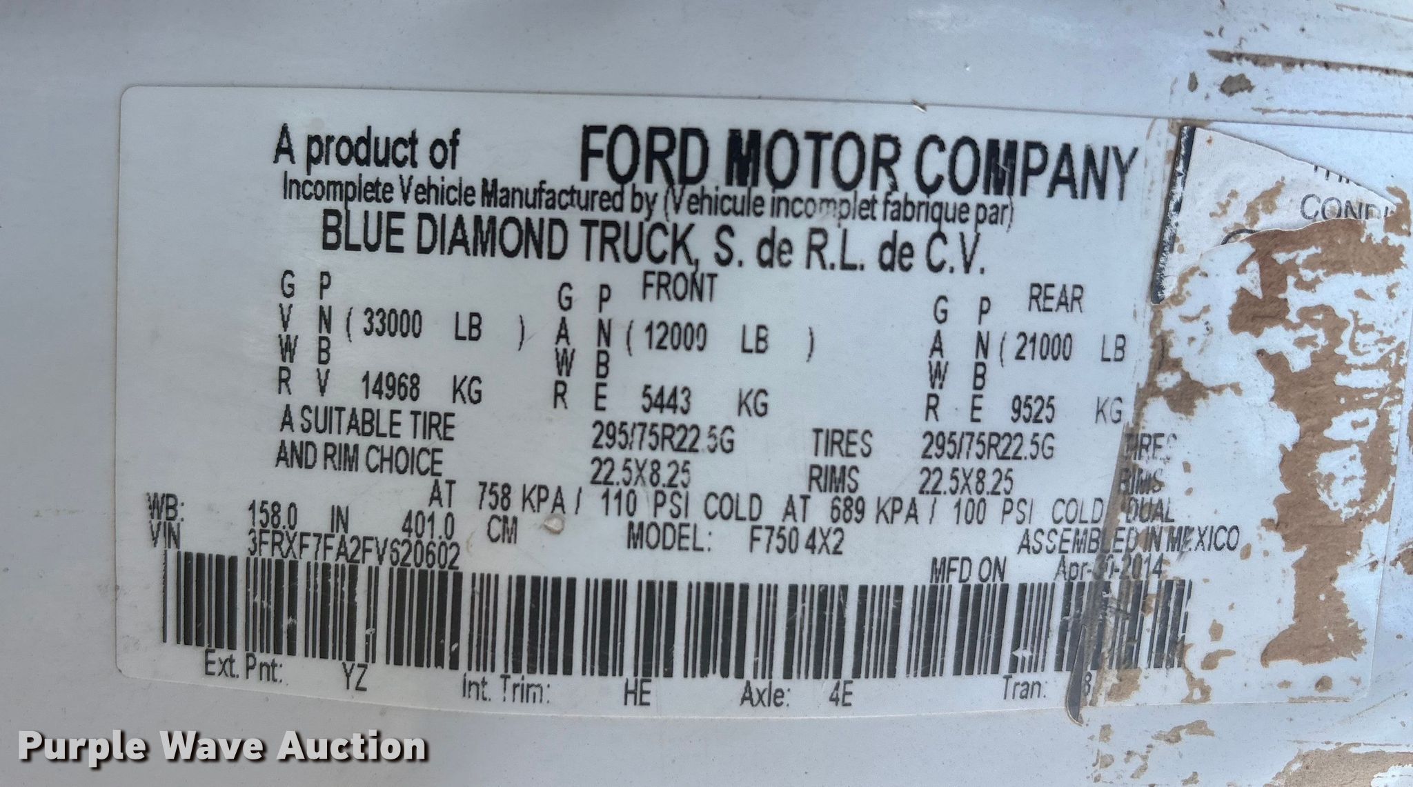 2015 Ford F750 water truck. Miles: 11,535 on odometer, VIN: 3FRXF7FA2FV620602, Unit #: 11652. Engine Cummins, Displacement: 6.7L, Cylinders: 6, Fuel type: Diesel, HP: 200. Transmission Manual, Speed: 6. Chassis Axles: Single, Suspension: Spring, Brakes: Air, PTO, GVWR: 33,000 lbs. Interior AC, Heat, Cruise control. Features Bed Tank bed, Length: 107", Width: 8', Spray bar: Front, Rear, Side discharge, Hose reel, Top fill, Rear outlet: 2". Tires Size: 11R22.5, Brand: Uniroyal. Notes Dash warning indicator: Check engine. Oklahoma title. Title distribution may be delayed up to 30 days from verification of funds. Okie Rents - Open inspection December 20 and 26, 2025. 5280 State Highway 7. Davis, OK 73030