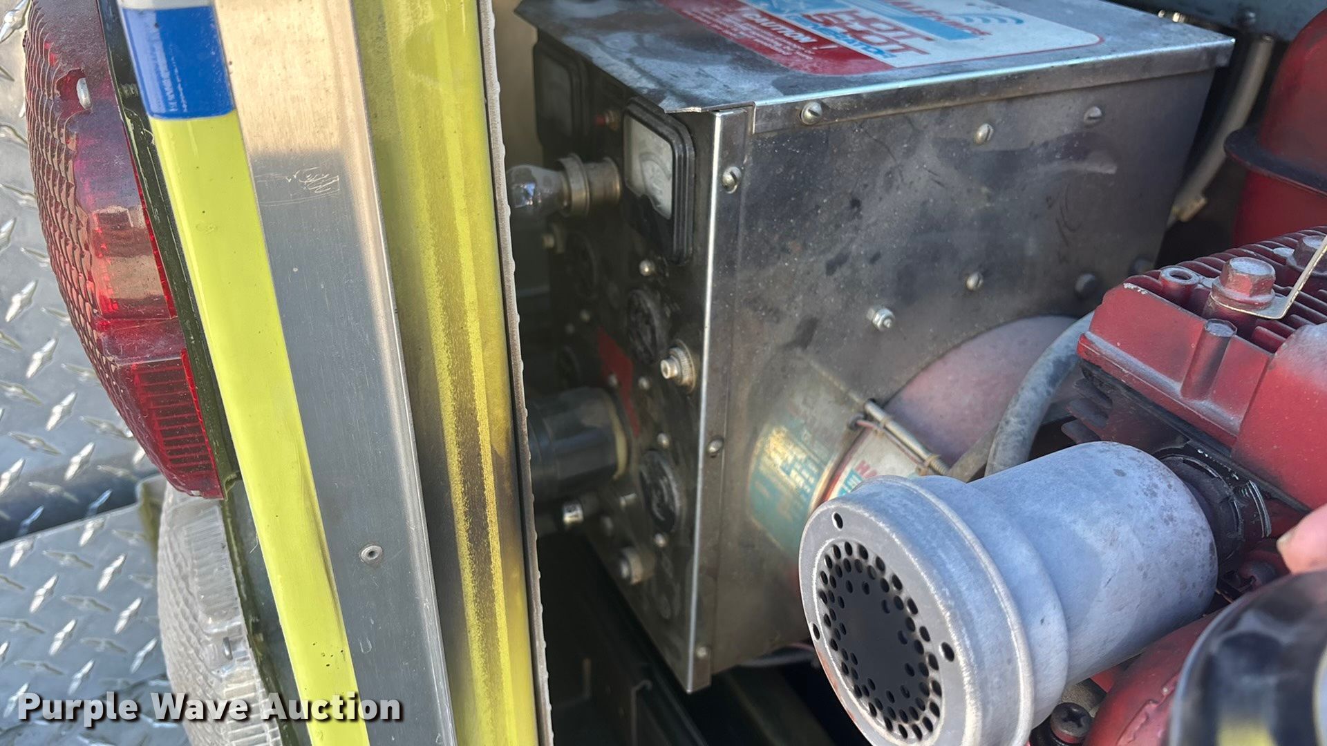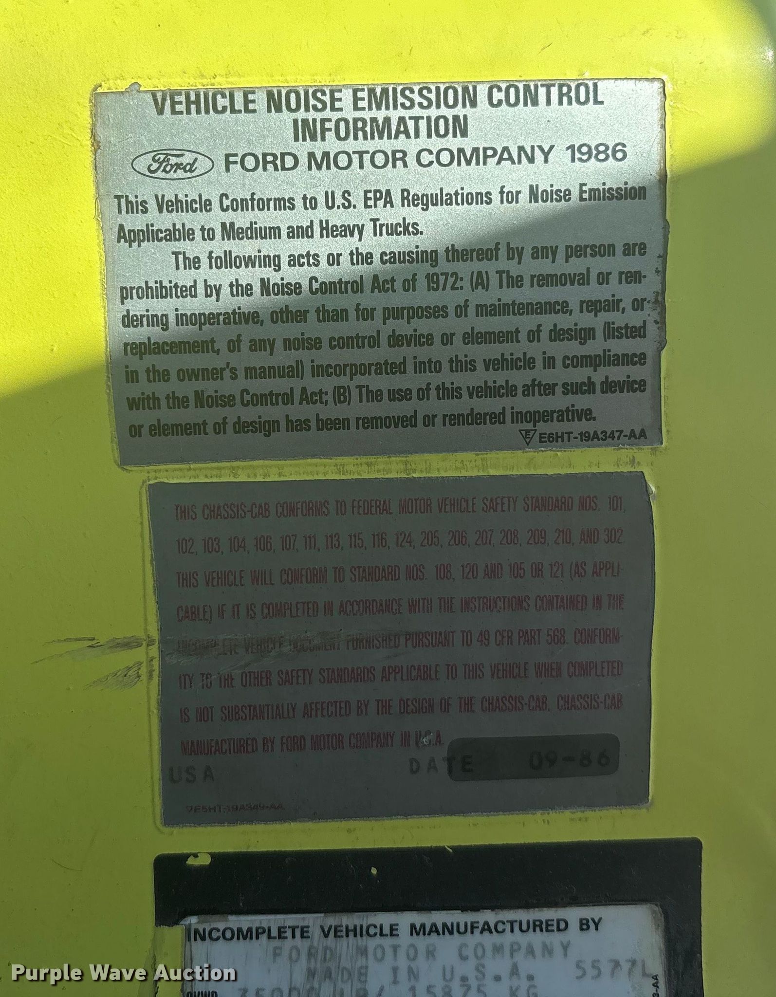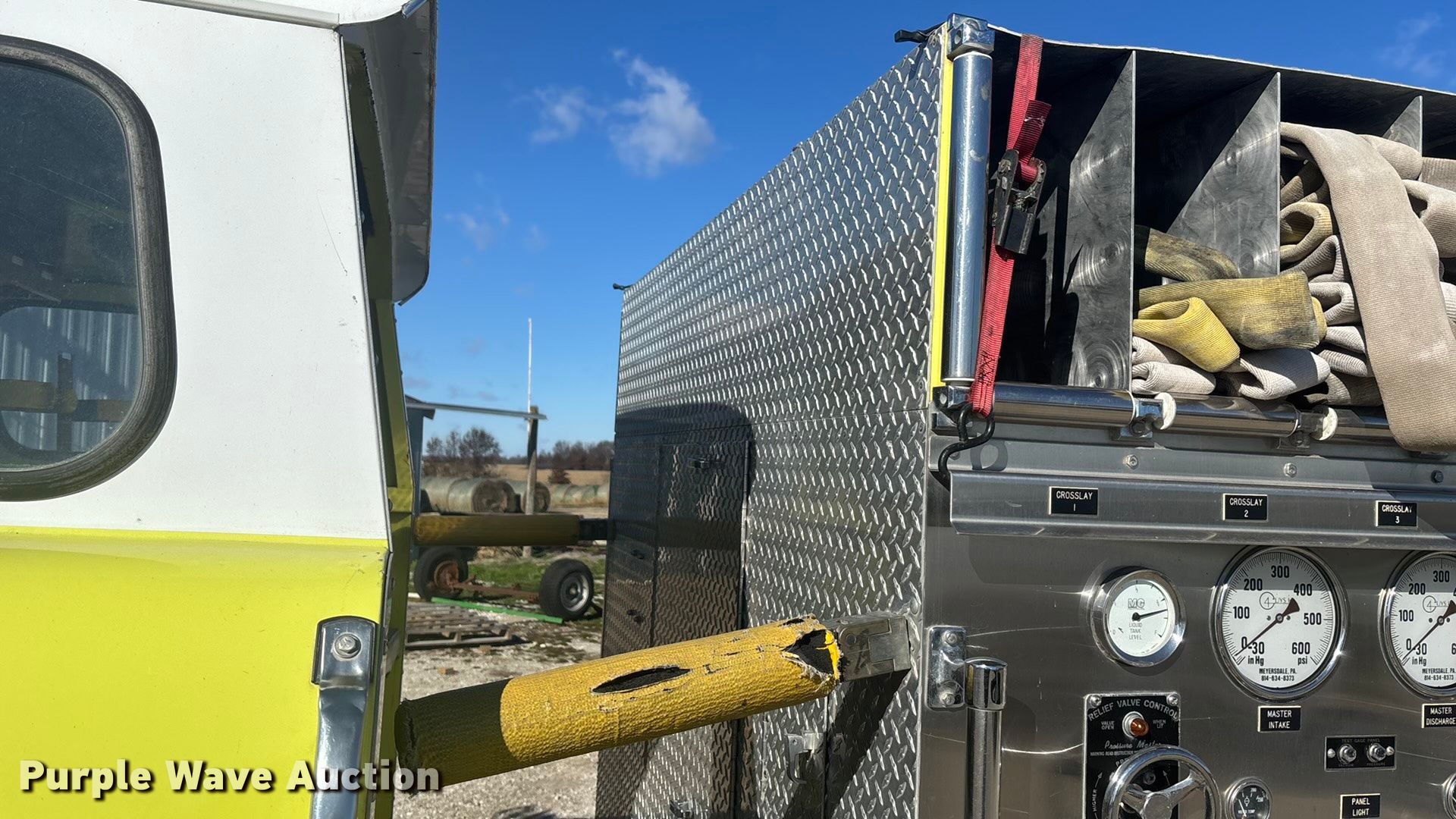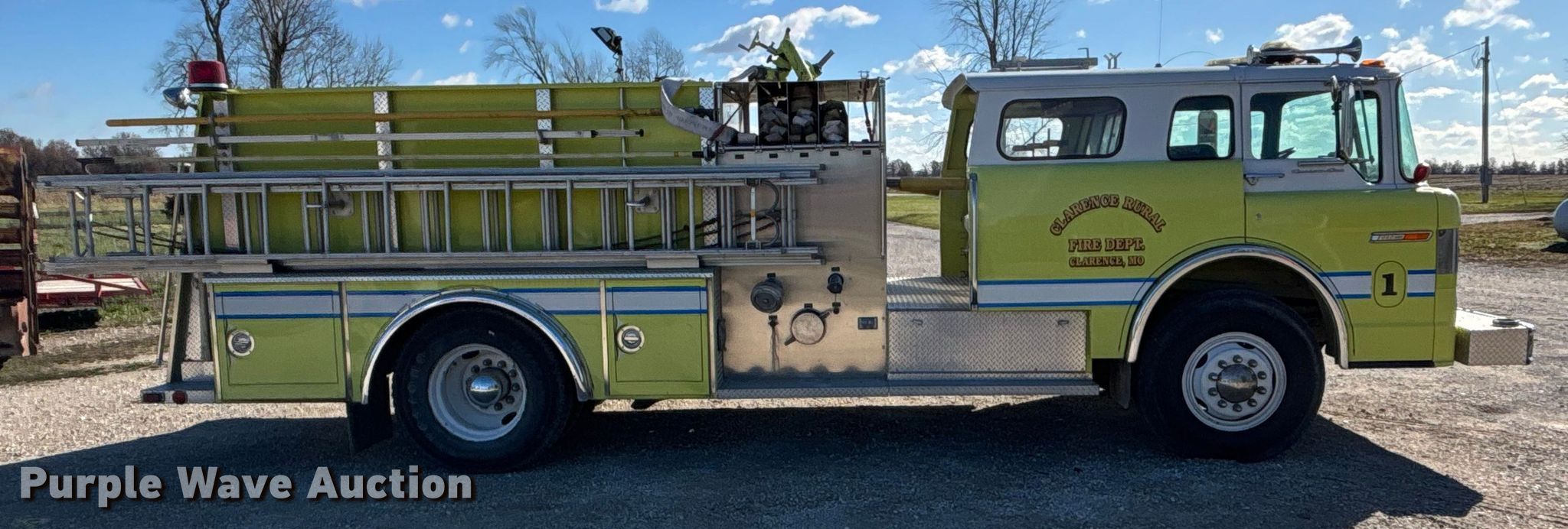 1986 Ford C8000 fire truck. Miles: 23,445 on odometer, VIN: 1FDYD80U7GVA58687. Engine Cylinders: 8, Fuel type: Diesel. Transmission Manual, Speed: 5. Chassis Axles: Single, Suspension: Spring, Brakes: Air, GVWR: 35,000 lbs, Wheelbase: 175". Interior Heat, Cruise control. Features Fire truck body 4 Guys, Elevated deck gun, Tank Capacity: 750 gallons, Pump 1,250 gpm, Generator Briggs & Stratton, Fuel type: Gas, kW: 3.5, PA/ siren controls. Tires Front: 11 R20, Rear: 11 R22.5. Notes Jump start required during on-site data collection. Missouri municipality owned asset. No title will be provided. Transfer of ownership documentation will be a notarized bill of sale in accordance with MSR 301.260. Bidders are responsible for verifying if this is sufficient to obtain title in their jurisdiction prior to bidding. Transfer of ownership documentation will be a bill of sale. Clarence, MO Rural Fire Department. Clarence, MO 63437