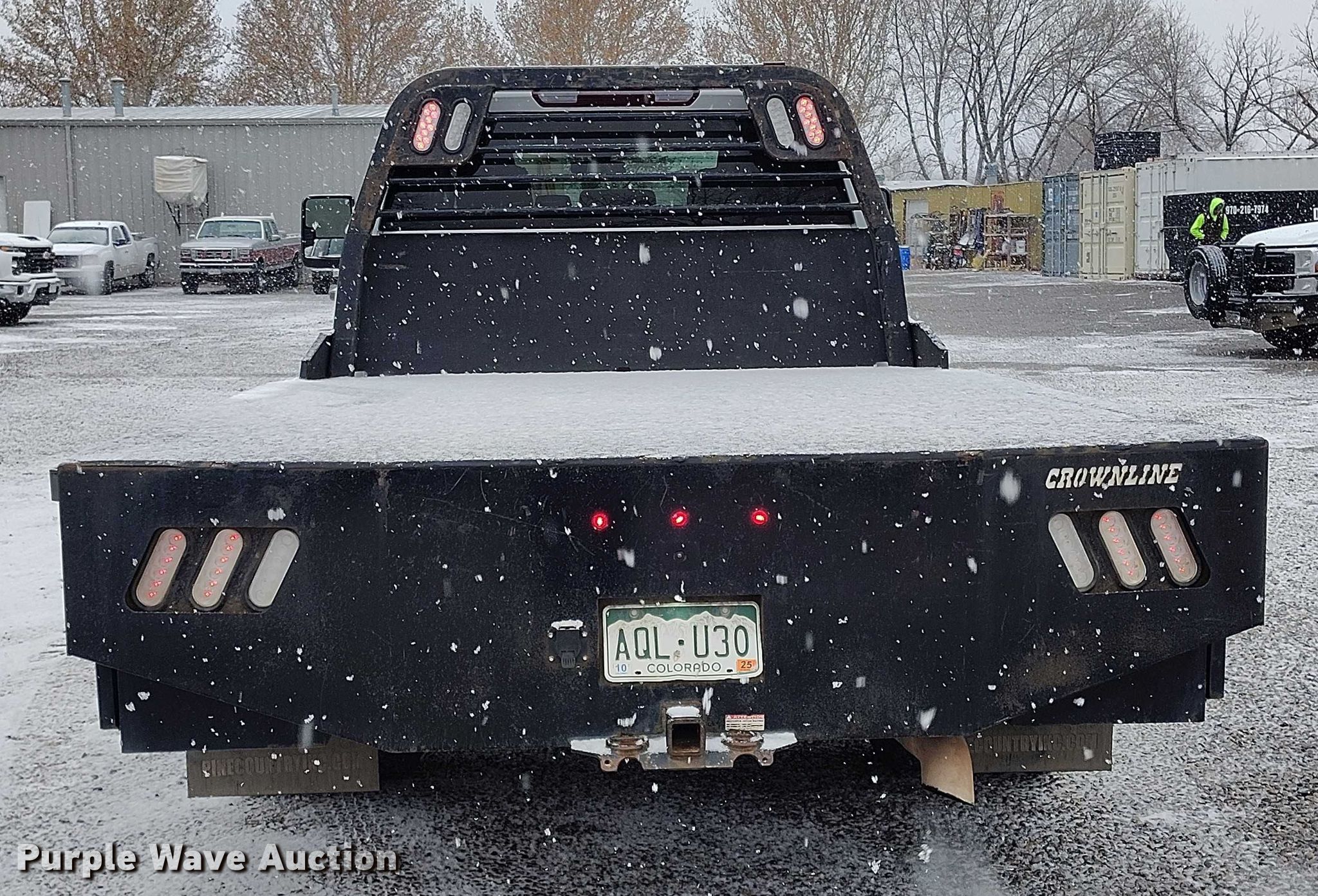 2022 GMC Sierra 3500HD Crew Cab flatbed pickup truck. Miles: 105,550 on odometer, Hours: 3,075 on meter, VIN: 1GD49SEY3NF234523. Engine Displacement: 6.6L, Cylinders: 8, Fuel type: Diesel. Transmission Automatic, Four wheel drive. Interior AC, Heat, Power windows, Power locks, Cruise control, Backup camera, Auxiliary controls, Brake controller. Features Bed Flatbed, Crownline, Length: 9' 10", Width: 98", Hitch: Gooseneck. Tires Size: 235/80R17. Notes Dash warning indicator: Check engine, TPMS. Colorado title. Title distribution may be delayed up to 14 days from verification of funds. FCI Constructors, Inc.. Grand Junction, CO 81504