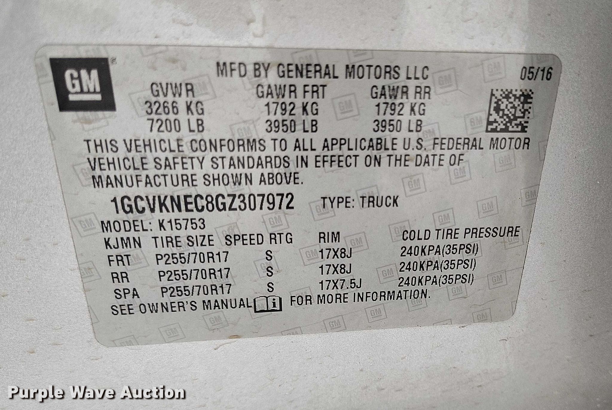 2016 Chevrolet Silverado 1500 Crew Cab pickup truck. Miles: 221,191 on odometer, Hours: 7,543 on meter, VIN: 1GCVKNEC8GZ307972. Engine Displacement: 5.3L, Cylinders: 8, Fuel type: Gas. Transmission Automatic, Four wheel drive. Interior AC, Heat, Heated mirrors, Power windows, Power locks, Cruise control, Backup camera. Tires Size: 265/70R17. Notes Dash warning indicator: TPMS. Colorado title. Title distribution may be delayed up to 14 days from verification of funds. Millstone Weber, LLC. Denver, CO 80249