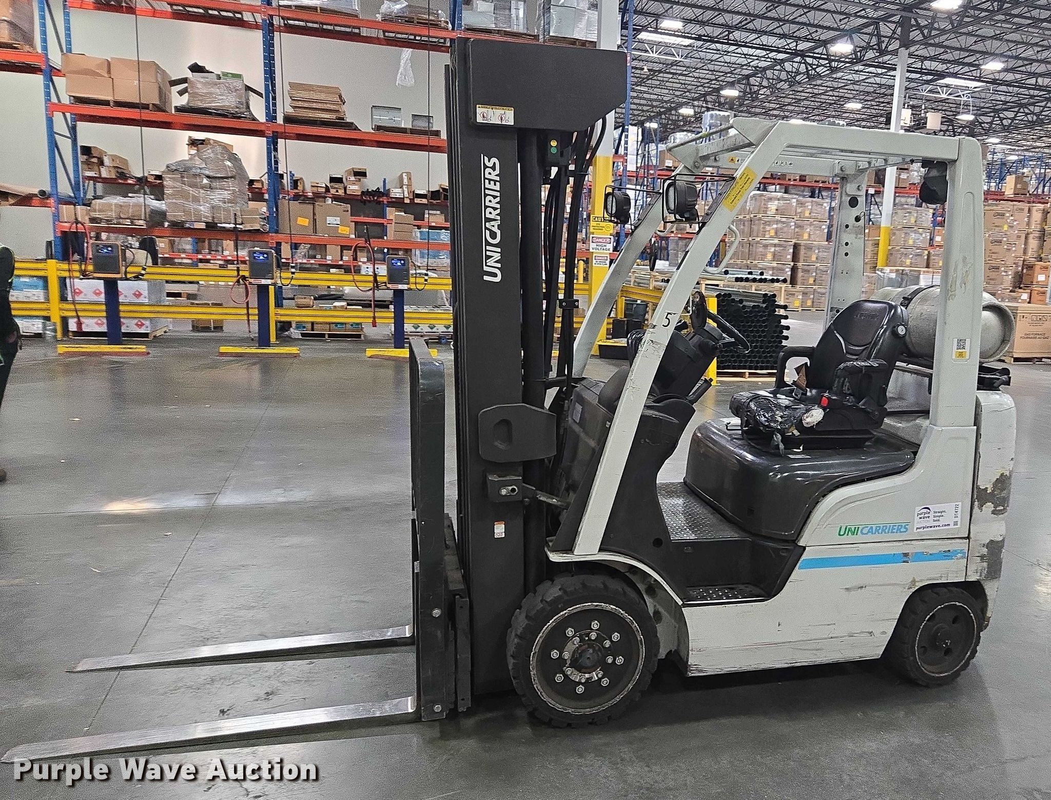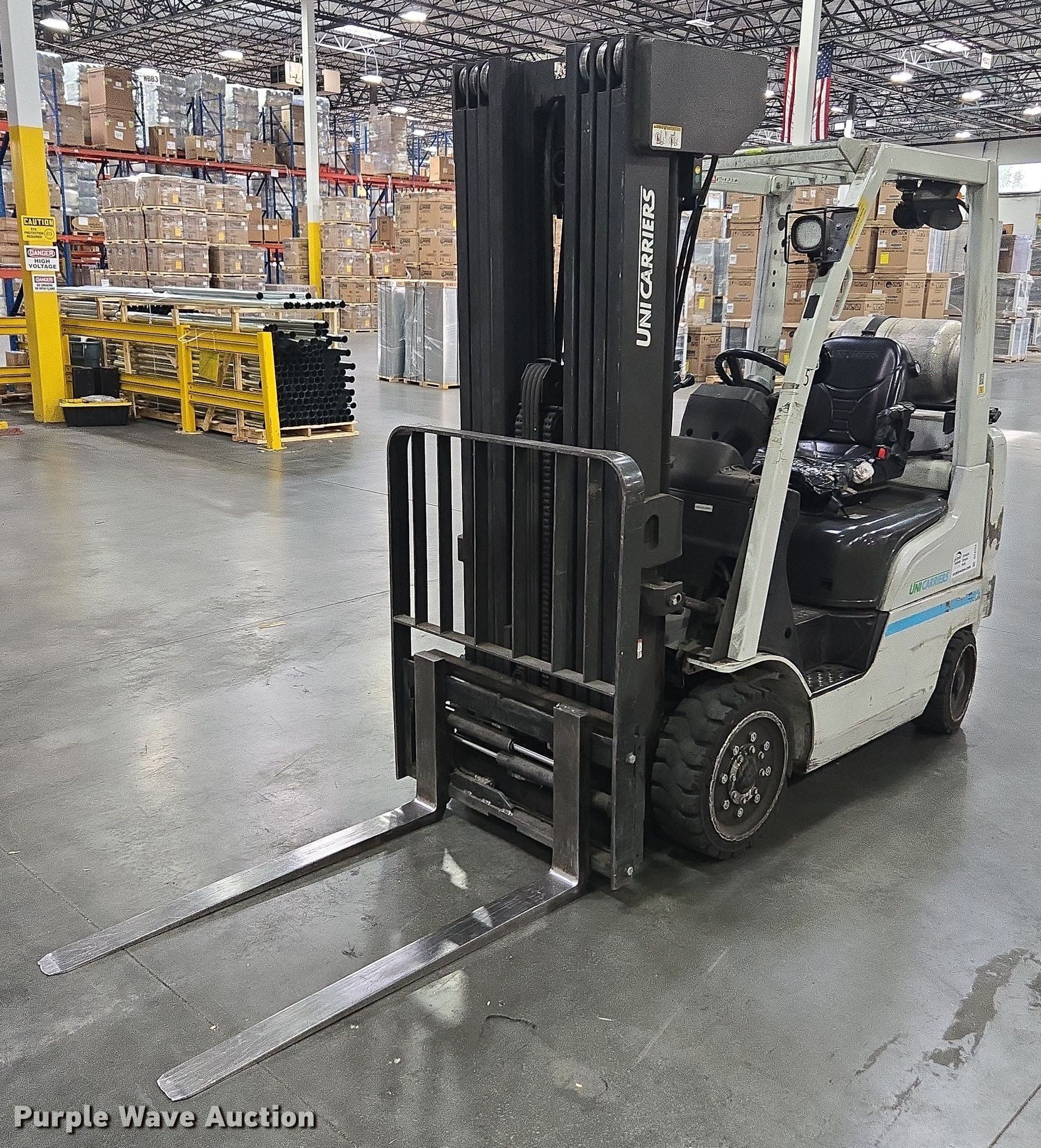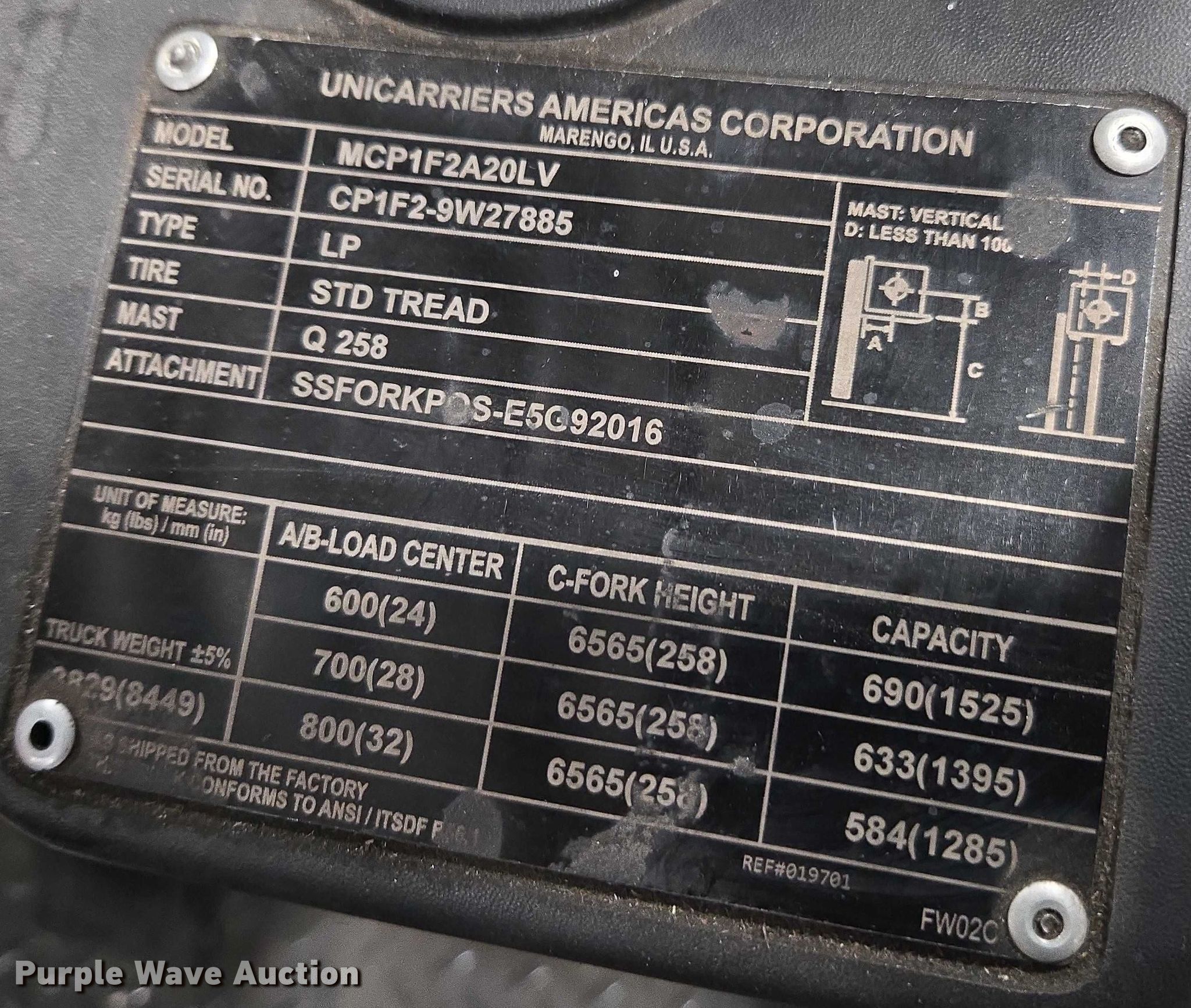 2018 UniCarriers CSF40 forklift. Hours: 7,436 on meter, Serial: CP1F2-9W27885, Unit #: SFS2669. Engine GCT GK21, Displacement: 2.1L, Cylinders: 4, Fuel type: LPG LP bottle: Not included. Transmission Automatic. Operators station OROPS. Features Maximum lift capacity: 1,525 lbs, Maximum lift height: 258", Collapsed mast height: 88", Mast stages: 4, Side shift, Mast tilt, Fork positioner, Fork length: 48". Tires Front: 21x7x15, Rear: Unknown, Solid. Notes Warning indicator: Master warning. Ferguson. Union City, GA 30291