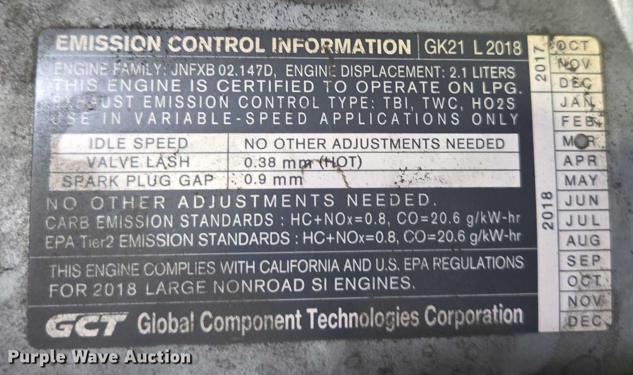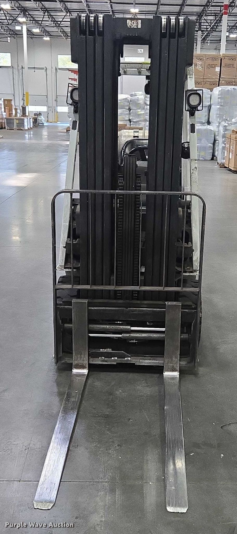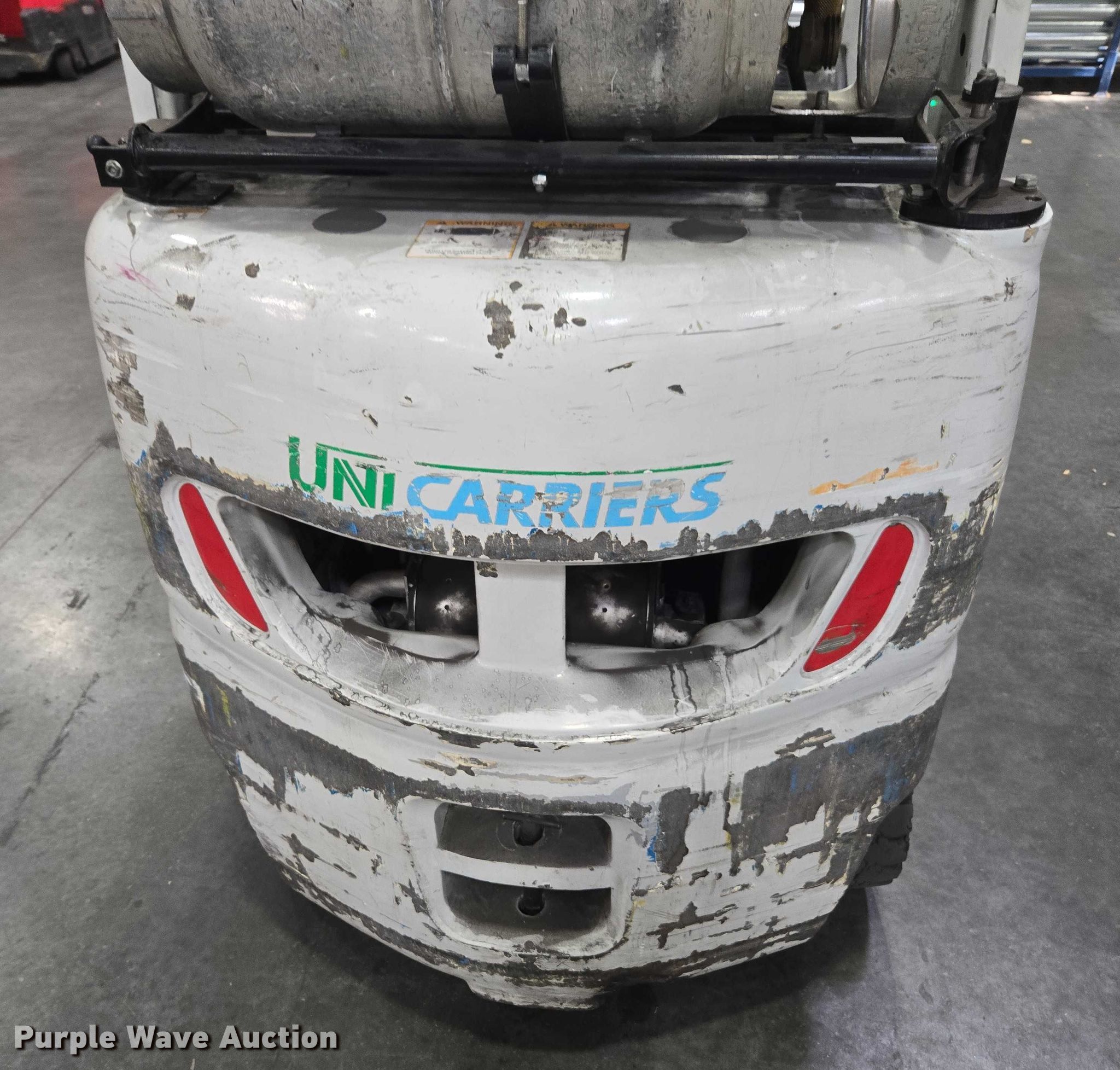 2018 UniCarriers CSF40 forklift. Hours: 7,436 on meter, Serial: CP1F2-9W27885, Unit #: SFS2669. Engine GCT GK21, Displacement: 2.1L, Cylinders: 4, Fuel type: LPG LP bottle: Not included. Transmission Automatic. Operators station OROPS. Features Maximum lift capacity: 1,525 lbs, Maximum lift height: 258", Collapsed mast height: 88", Mast stages: 4, Side shift, Mast tilt, Fork positioner, Fork length: 48". Tires Front: 21x7x15, Rear: Unknown, Solid. Notes Warning indicator: Master warning. Ferguson. Union City, GA 30291