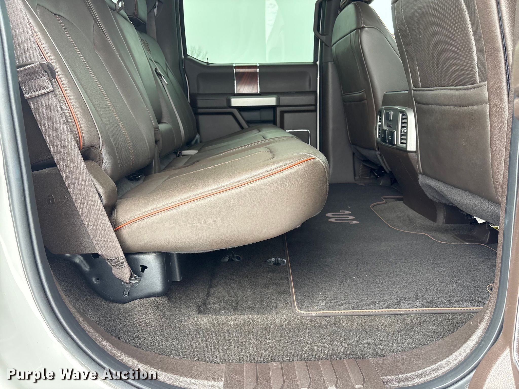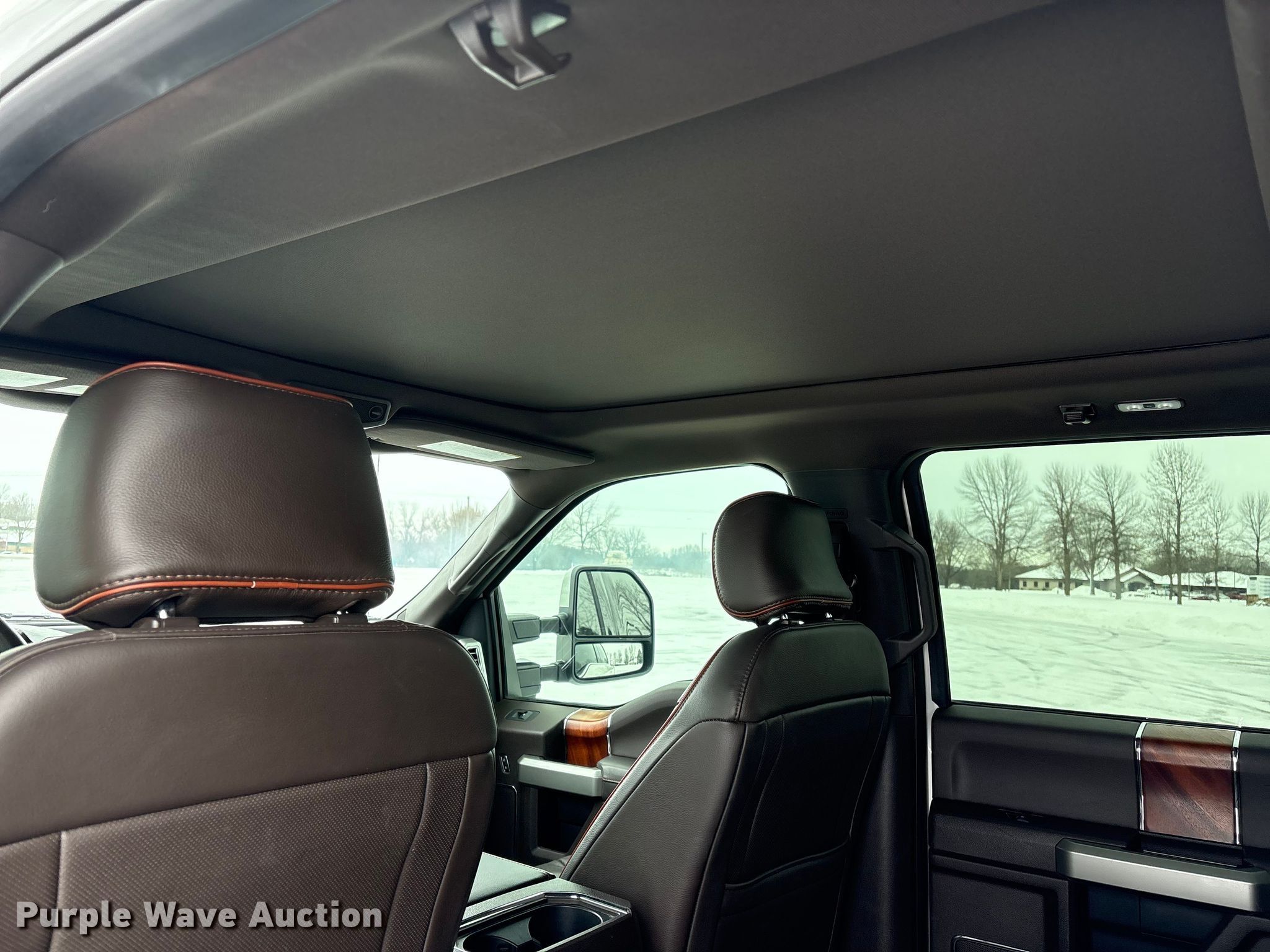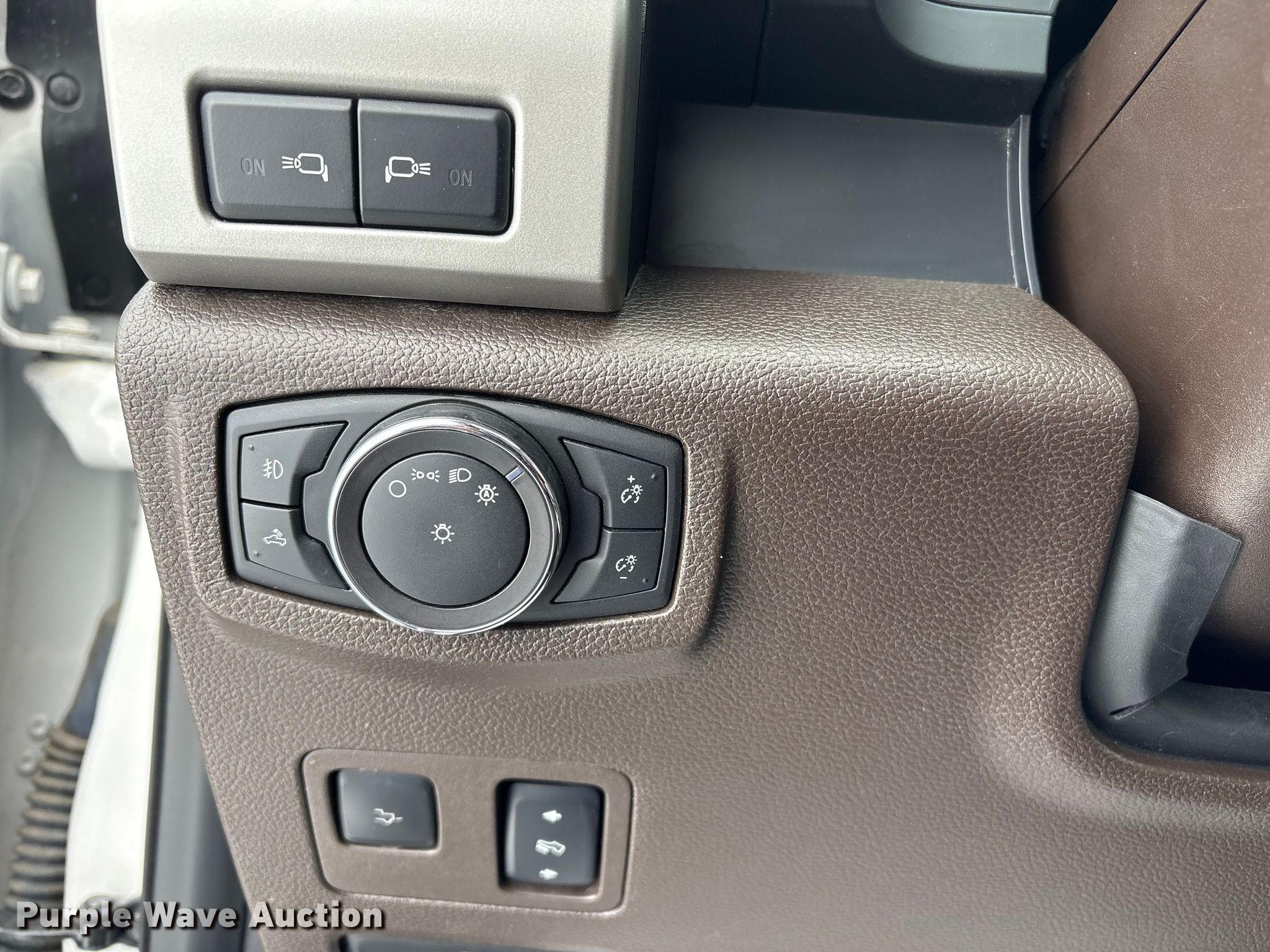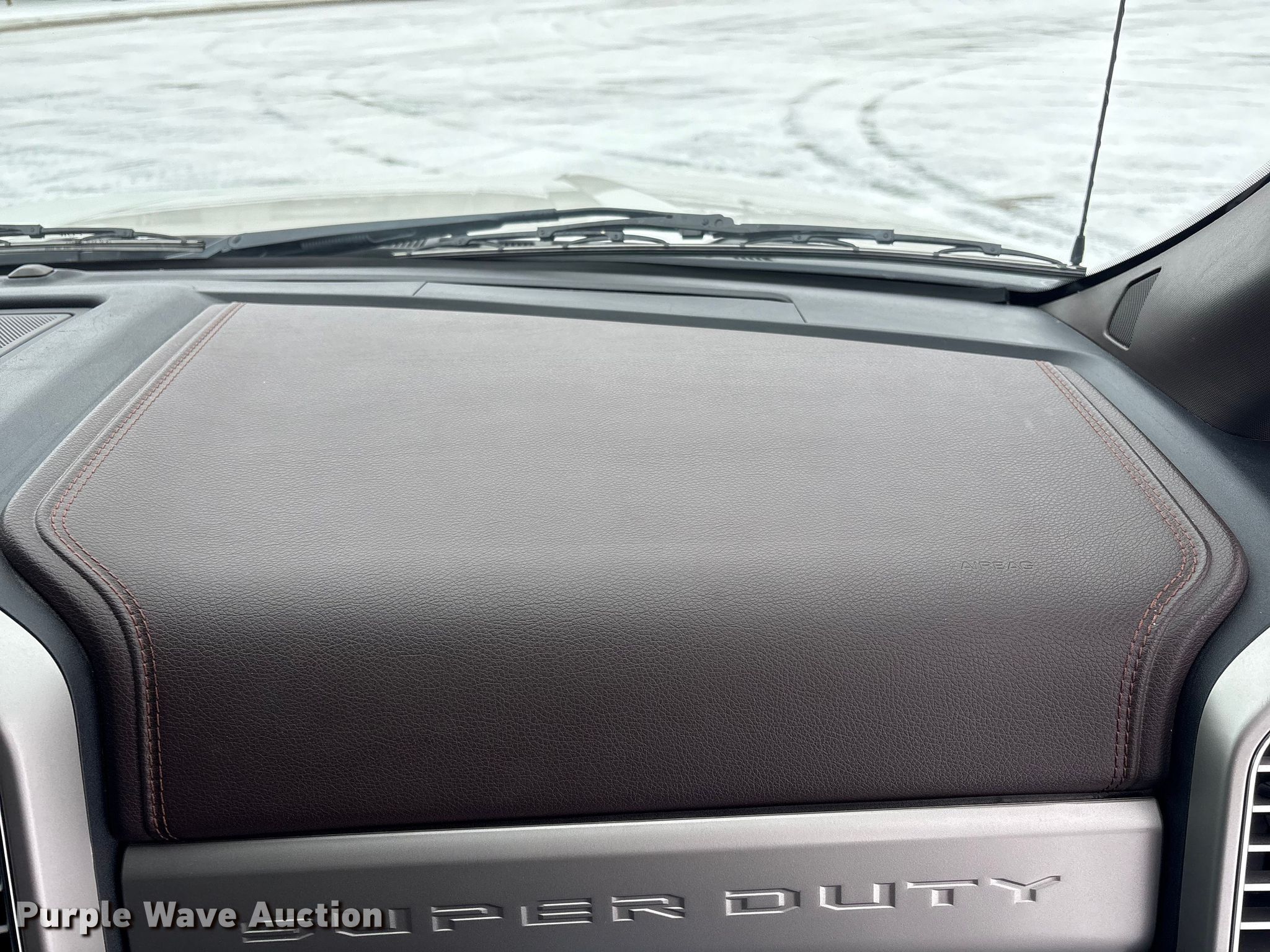 2017 Ford F250 King Ranch Crew Cab pickup truck. Miles: 29,380 on odometer, Hours: 934 on meter, VIN: 1FT7W2BT4HEF24380. Engine Displacement: 6.7L, Cylinders: 8, Fuel type: Diesel. Transmission Automatic, Four wheel drive. Interior AC, Heat, Seat: Heated, Cooled, Power driver, Power passenger, Heated mirrors, Power windows, Power locks, Cruise control, Backup camera, Auxiliary controls, Brake controller, Sunroof, Powered sunroof. Tires Size: 275/65R20. Notes Hail damage. Minnesota title. Title distribution may be delayed up to 14 days from verification of funds. Willmar, MN 56201