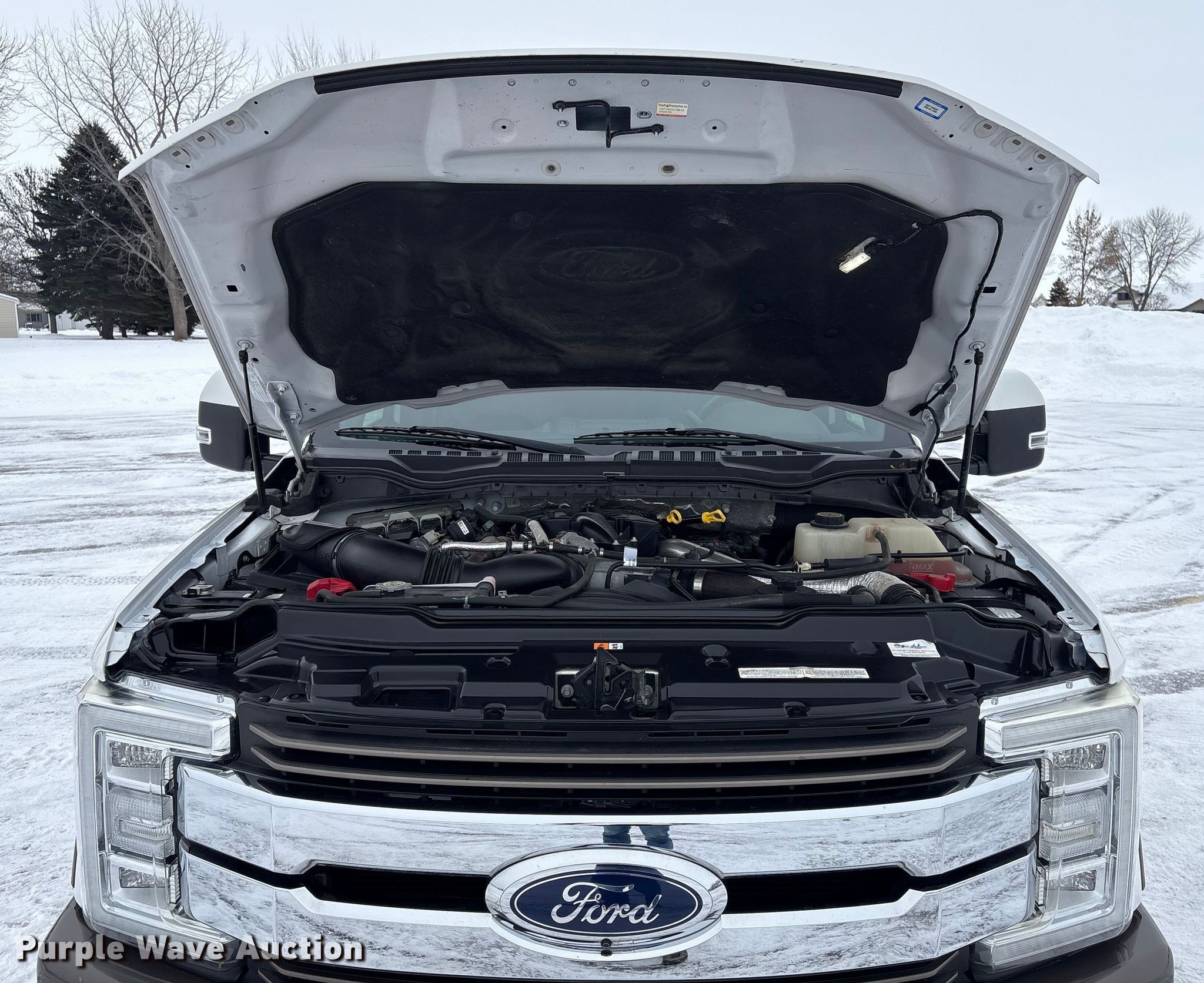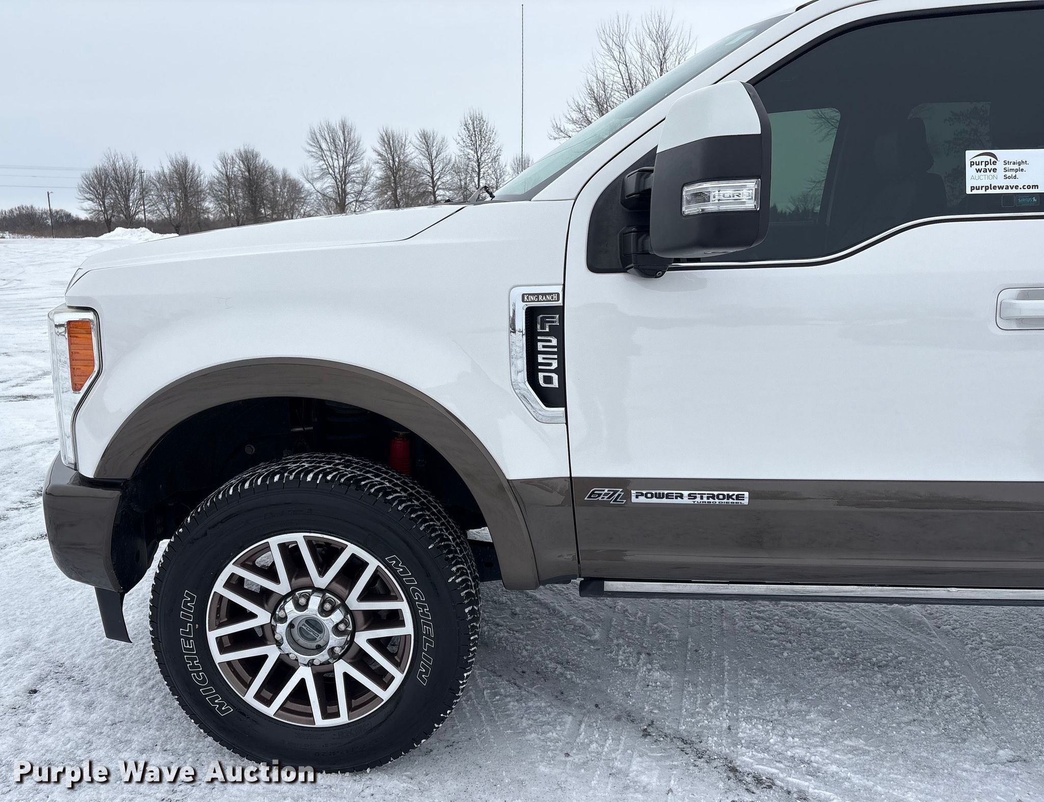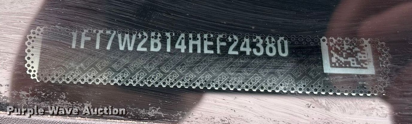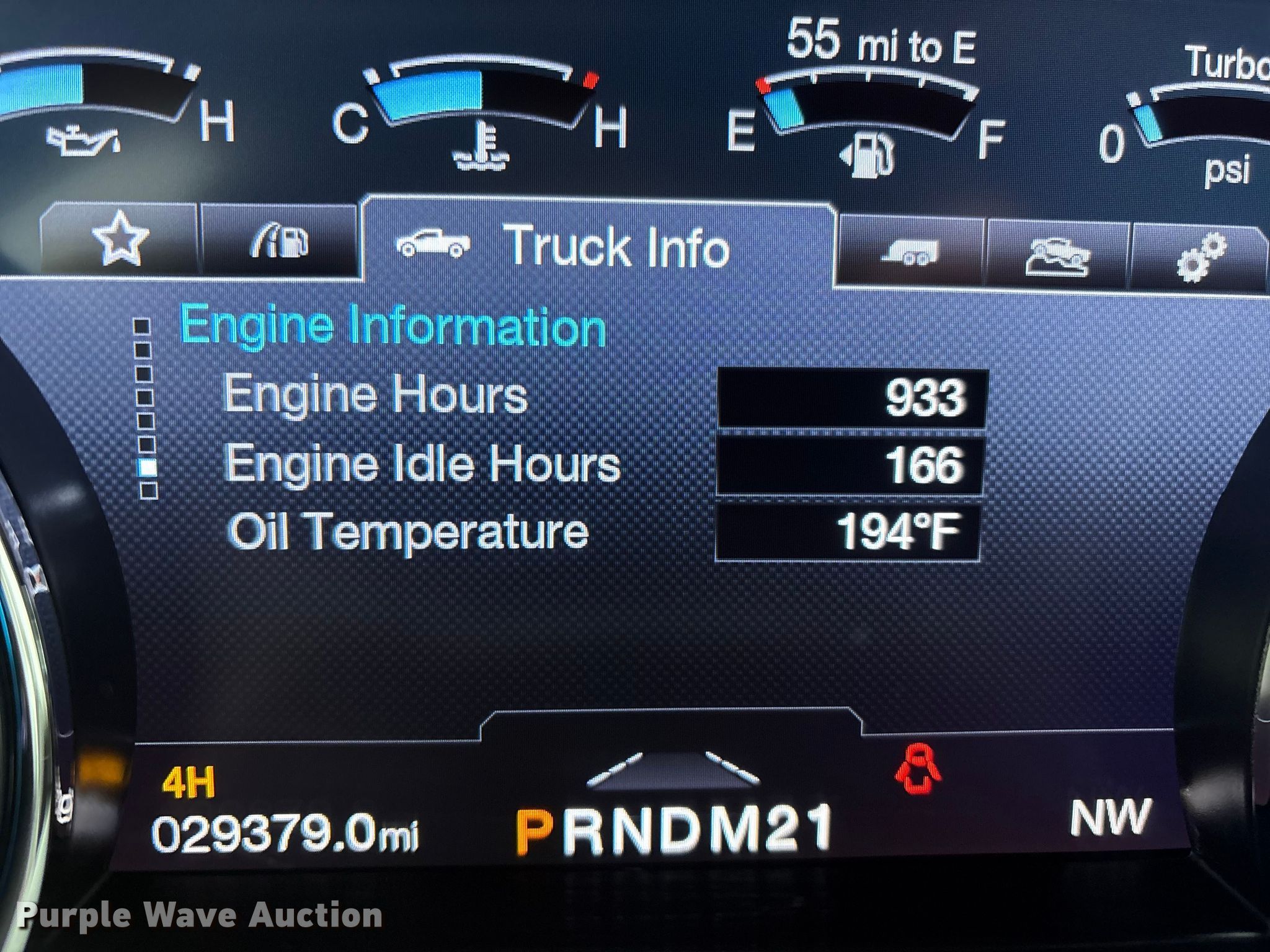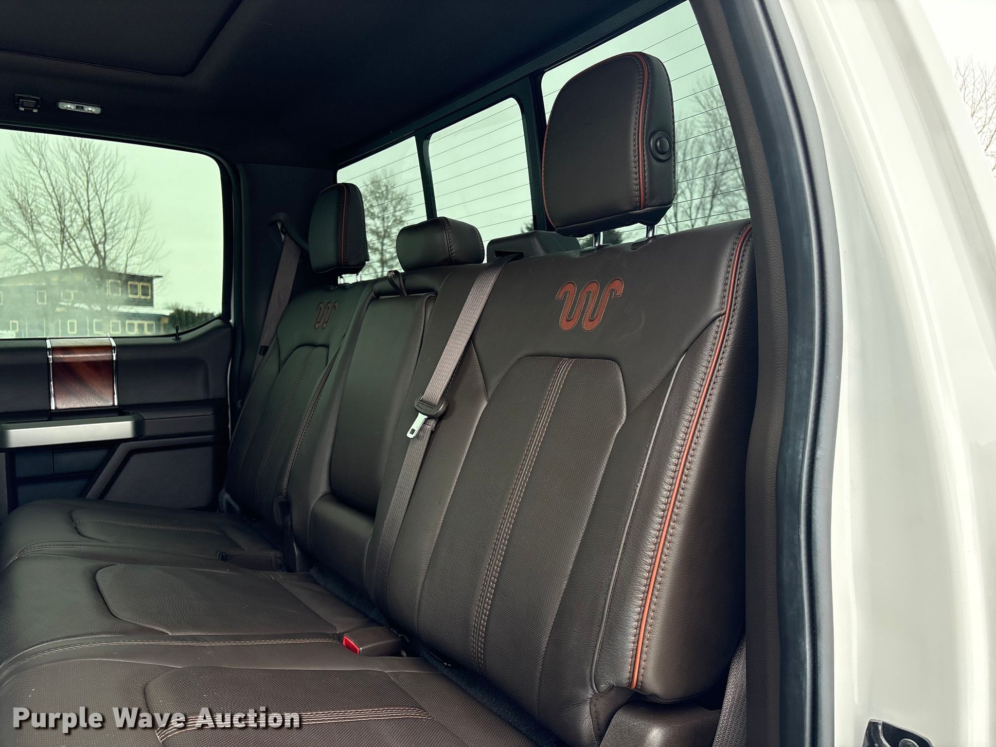 2017 Ford F250 King Ranch Crew Cab pickup truck. Miles: 29,380 on odometer, Hours: 934 on meter, VIN: 1FT7W2BT4HEF24380. Engine Displacement: 6.7L, Cylinders: 8, Fuel type: Diesel. Transmission Automatic, Four wheel drive. Interior AC, Heat, Seat: Heated, Cooled, Power driver, Power passenger, Heated mirrors, Power windows, Power locks, Cruise control, Backup camera, Auxiliary controls, Brake controller, Sunroof, Powered sunroof. Tires Size: 275/65R20. Notes Hail damage. Minnesota title. Title distribution may be delayed up to 14 days from verification of funds. Willmar, MN 56201