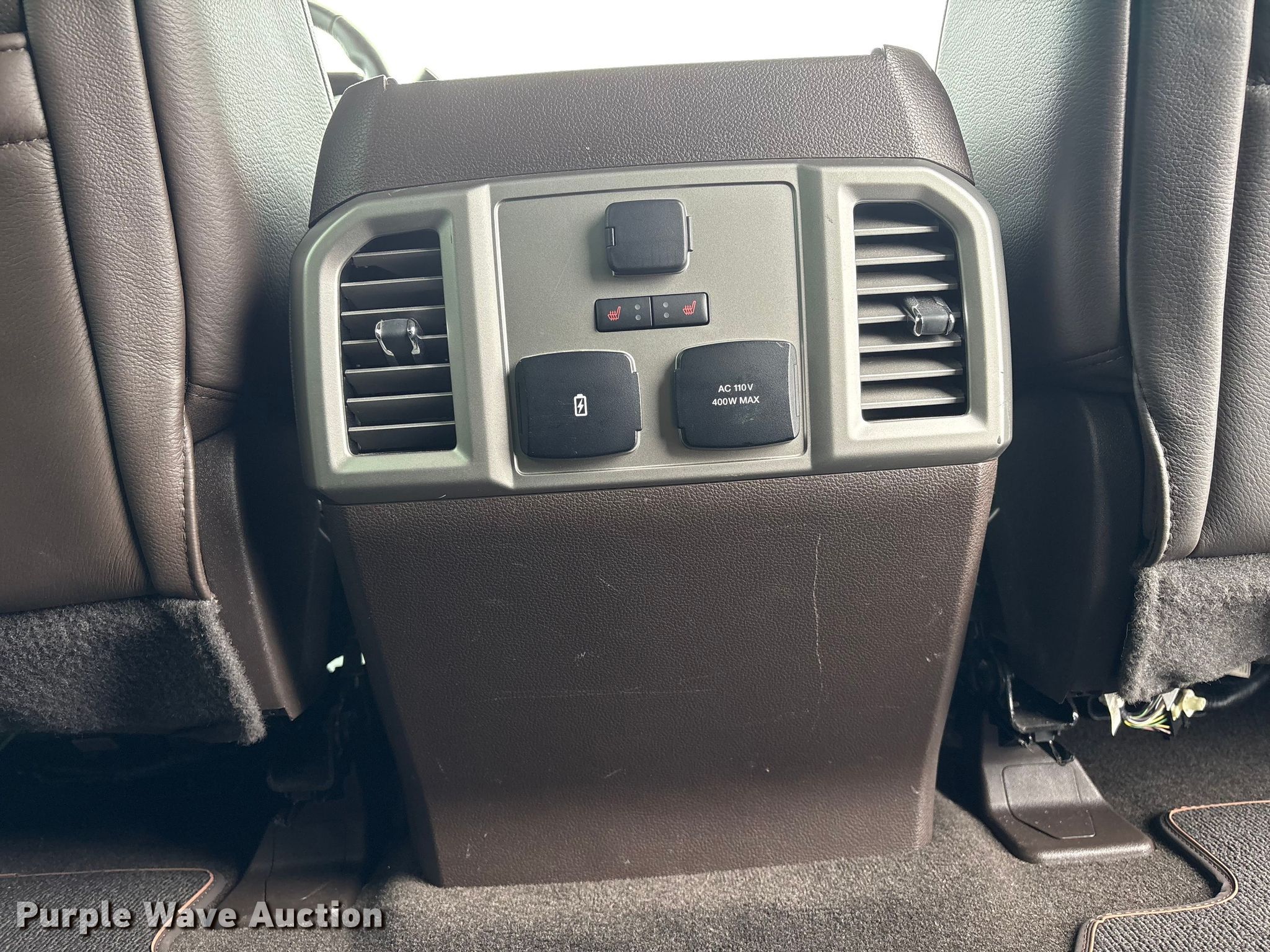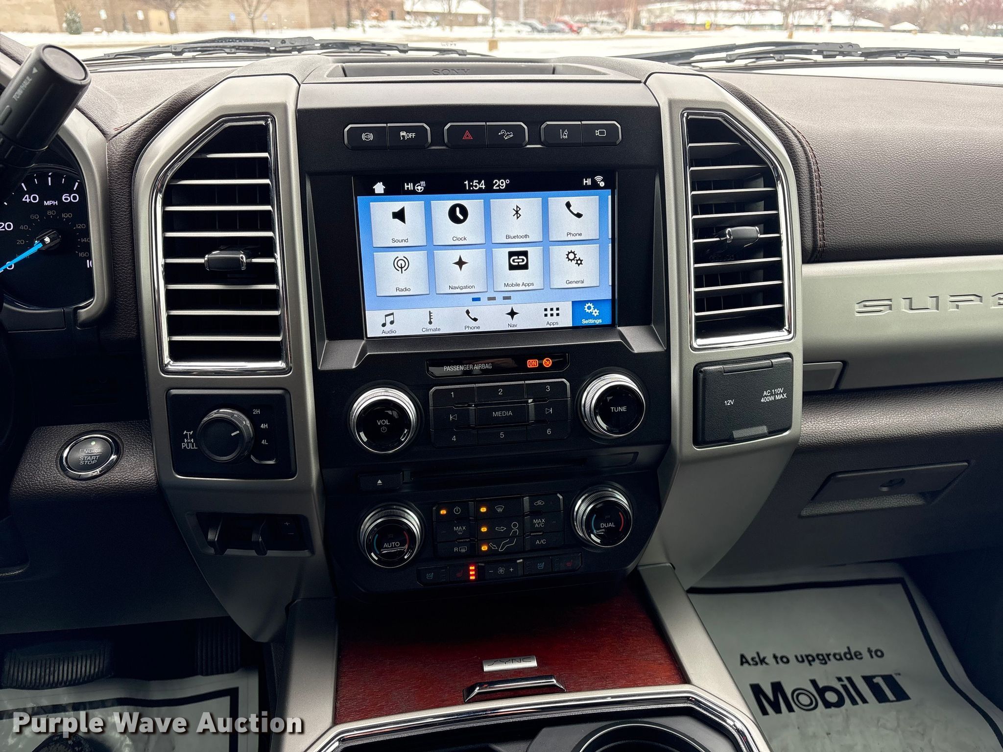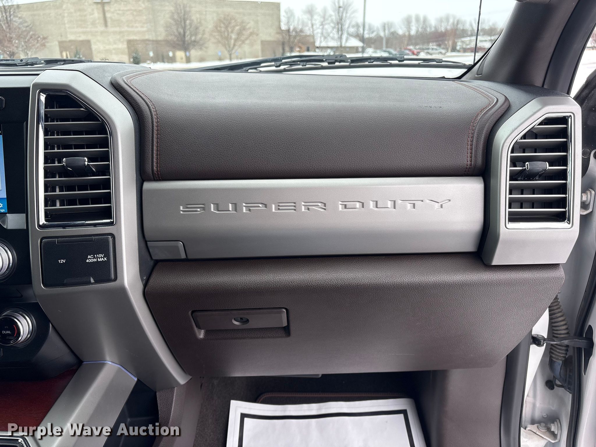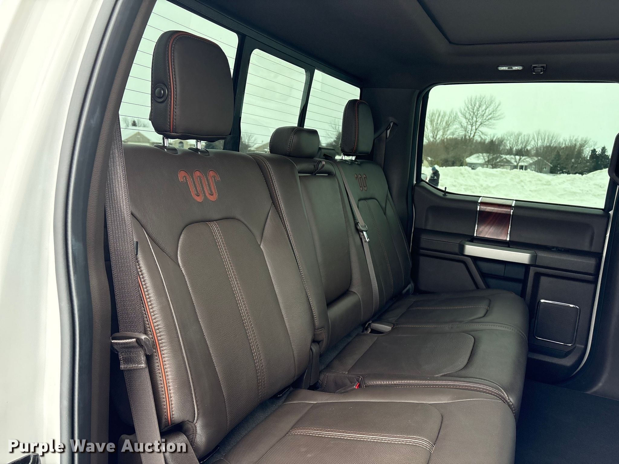 2017 Ford F250 King Ranch Crew Cab pickup truck. Miles: 29,380 on odometer, Hours: 934 on meter, VIN: 1FT7W2BT4HEF24380. Engine Displacement: 6.7L, Cylinders: 8, Fuel type: Diesel. Transmission Automatic, Four wheel drive. Interior AC, Heat, Seat: Heated, Cooled, Power driver, Power passenger, Heated mirrors, Power windows, Power locks, Cruise control, Backup camera, Auxiliary controls, Brake controller, Sunroof, Powered sunroof. Tires Size: 275/65R20. Notes Hail damage. Minnesota title. Title distribution may be delayed up to 14 days from verification of funds. Willmar, MN 56201