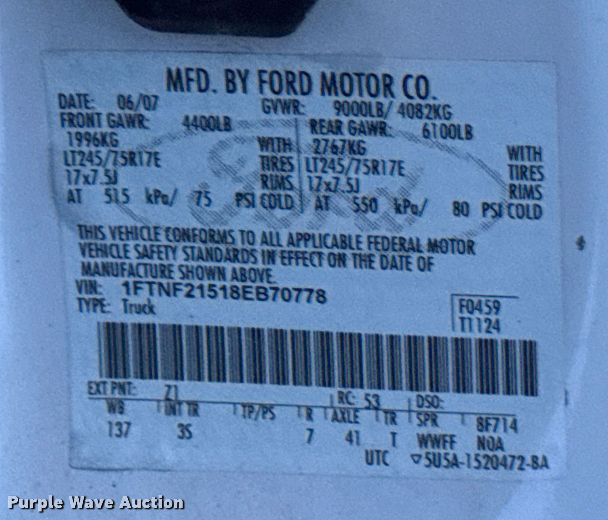2008 Ford F250 Super Duty XL utility bed pickup truck. Miles: 127,412 on odometer, VIN: 1FTNF21518EB70778. Engine Displacement: 5.4L, Cylinders: 8, Fuel type: Gas. Transmission Automatic, Four wheel drive. Interior AC, Heat, Brake controller. Features Bed Utility bed, Omaha, Length: 96', Width: 79". Tires Size: 245/70R17. Notes Contents not included, Jump start required during on-site data collection. Wisconsin title. Title distribution may be delayed up to 30 days from verification of funds. Brightspeed. Berlin, WI 54923
