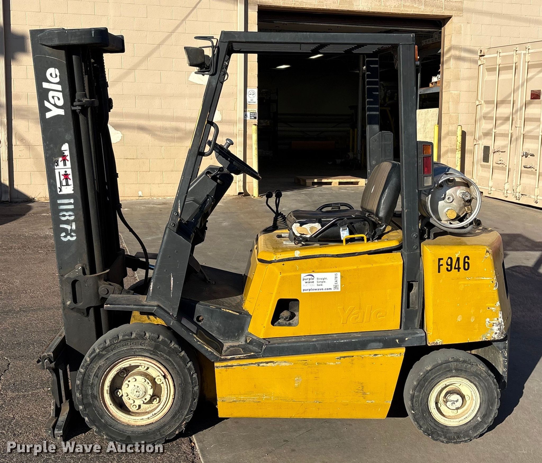 Purple Wave is selling a used Warehouse Forklift in Oklahoma. This item is a Yale GTP050TGNUAE084 forklift with the following: Hours: 5,222 on meter, Serial: E177B21605V, Unit #: F946
