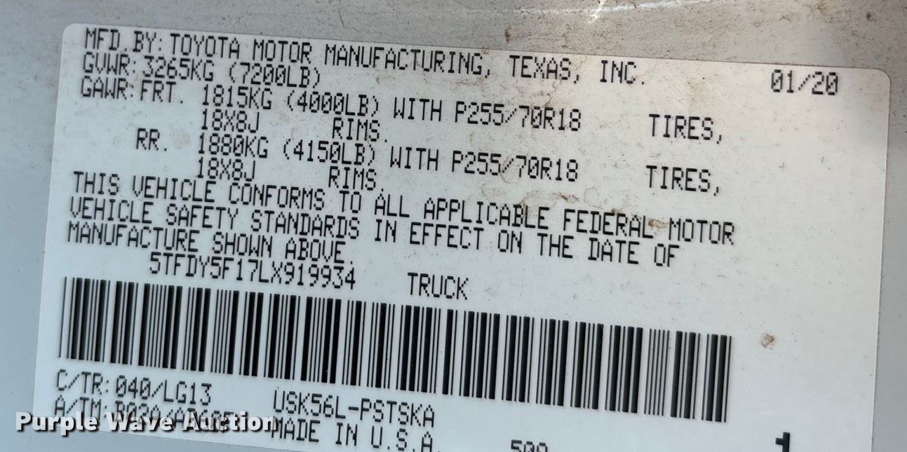 Purple Wave is selling a used 1/2 Ton Pickup or Van in Oklahoma. This item is a 2020 Toyota Tundra CrewMax pickup truck with the following: Miles: 187,149 on odometer, VIN: 5TFDY5F17LX919934, Unit #: 588
