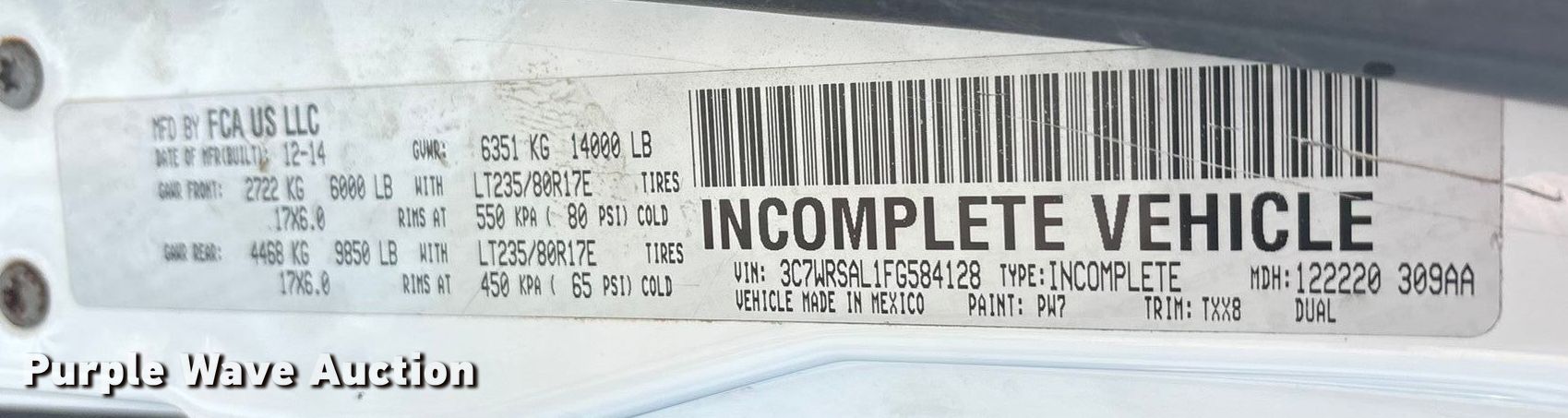 Purple Wave is selling a used 3/4 or 1 Ton Pickup or Van in Oklahoma. This item is a 2015 RAM 3500 utility bed pickup truck with the following: Miles: 241,579 on odometer, VIN: 3C7WRSAL1FG584128