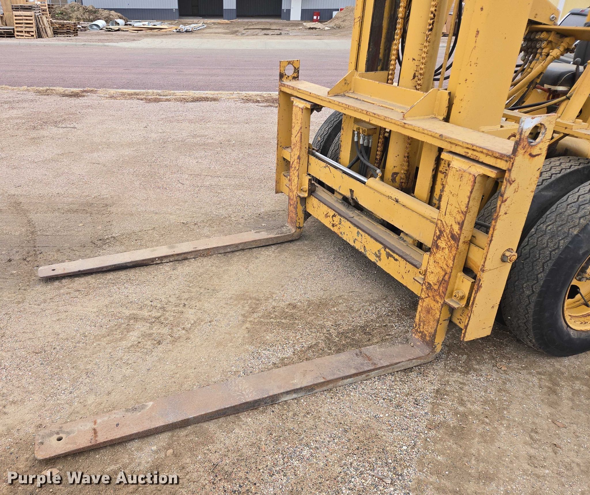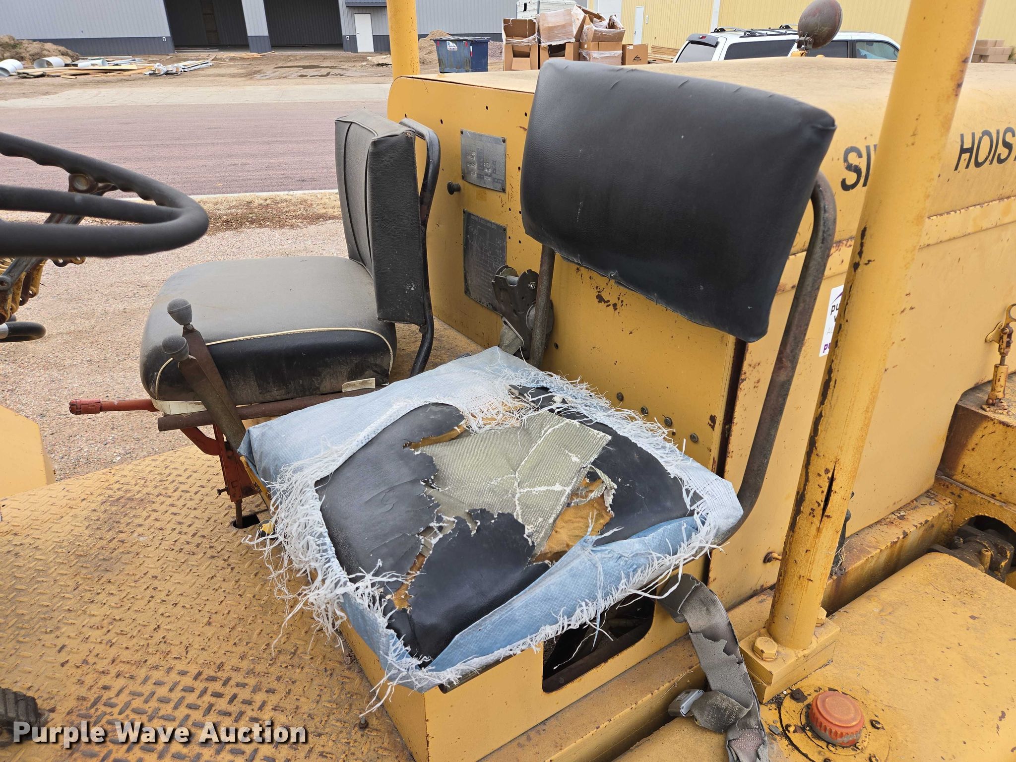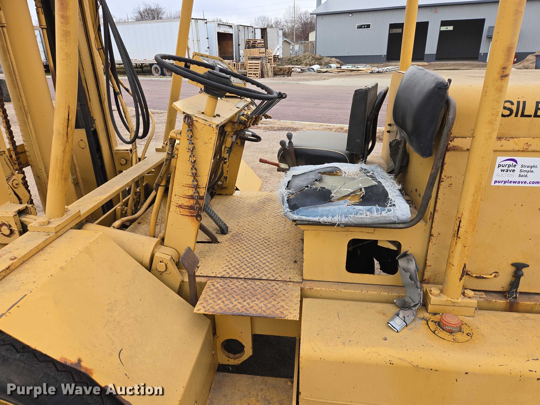 Silent Hoist FK 7.5 forklift. Hours: 93 on meter, Serial: 105. Engine Cylinders: 6, Fuel type: Gas. Transmission Powershift, 2F - 2R. Operators station OROPS. Features Maximum lift capacity: 9,330 lbs, Collapsed mast height: 93", Mast stages: 3, Side shift, Mast tilt, Fork positioner, Fork length: 72". Tires Front: 7.50-20, Rear: 7.00-15. Notes Right side tilt cylinder hydraulic leak. Carl Niehoff. Mitchell, SD 57301