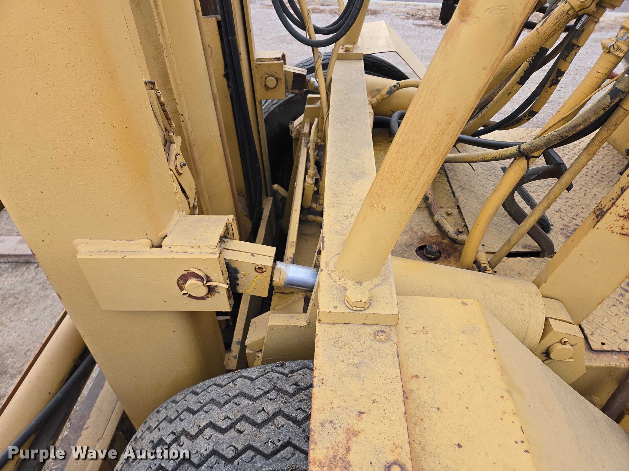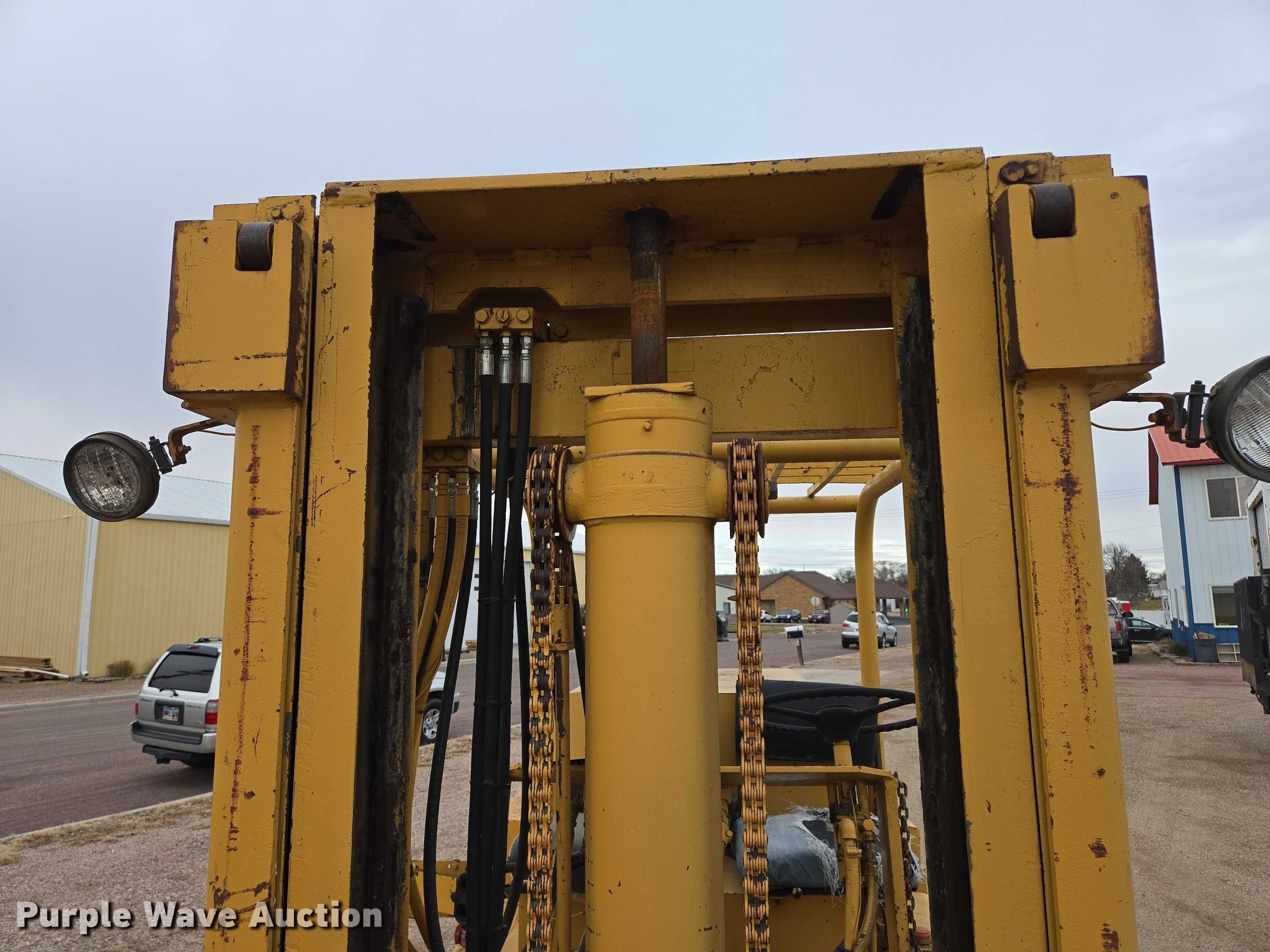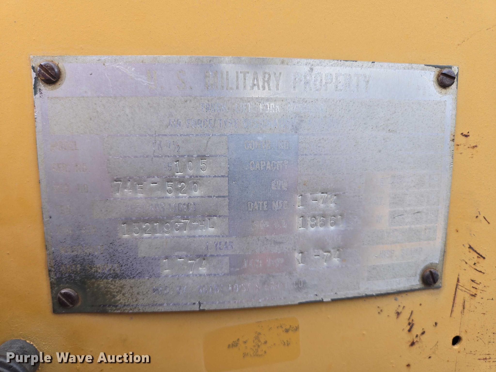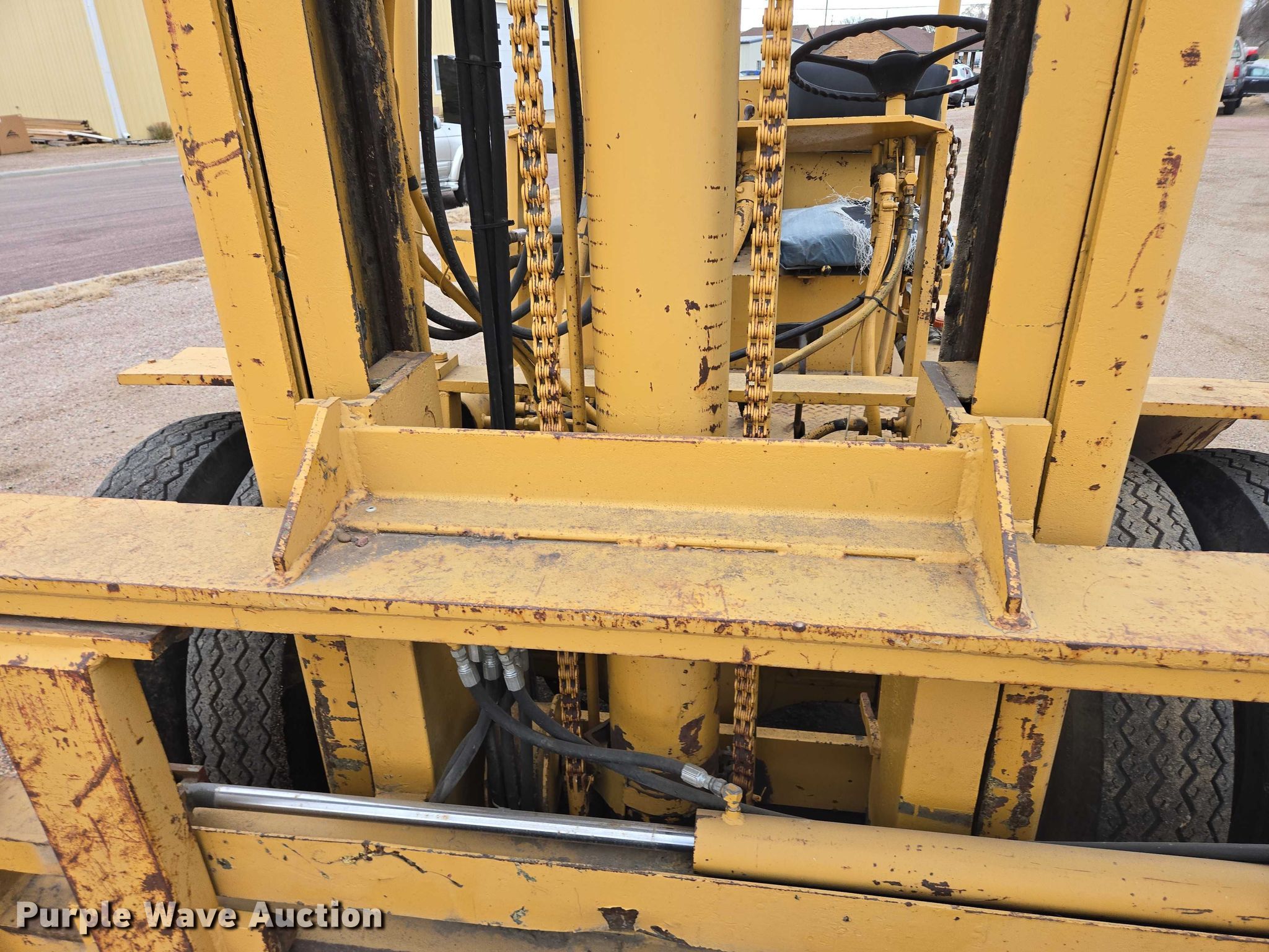 Silent Hoist FK 7.5 forklift. Hours: 93 on meter, Serial: 105. Engine Cylinders: 6, Fuel type: Gas. Transmission Powershift, 2F - 2R. Operators station OROPS. Features Maximum lift capacity: 9,330 lbs, Collapsed mast height: 93", Mast stages: 3, Side shift, Mast tilt, Fork positioner, Fork length: 72". Tires Front: 7.50-20, Rear: 7.00-15. Notes Right side tilt cylinder hydraulic leak. Carl Niehoff. Mitchell, SD 57301