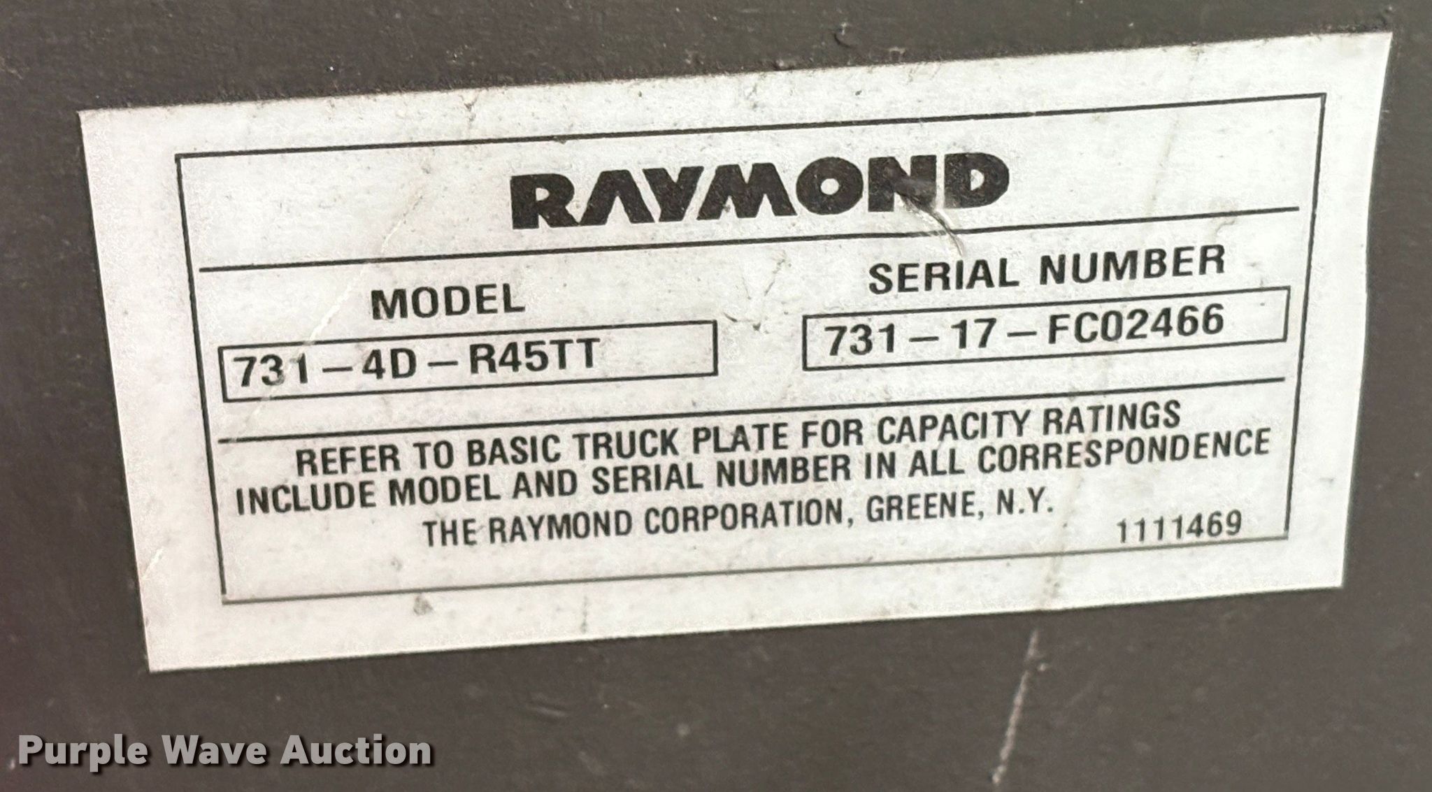 2017 Raymond 7310 reach truck. Hours: Unknown, Serial: 731-17-FC02466, Unit #: SFS2689. Electric Motor Volts: 36, Phase: Three. Transmission Electric drive. Operators station OROPS. Features Maximum lift capacity: 4,500 lbs, Maximum lift height: 226", Collapsed mast height: 97", Mast stages: 3, Reach / retract, Fork length: 42". Tires Solid, Non-marking. Notes Non-operational unit, Unknown operating condition. Ferguson. Hayward, CA 94544