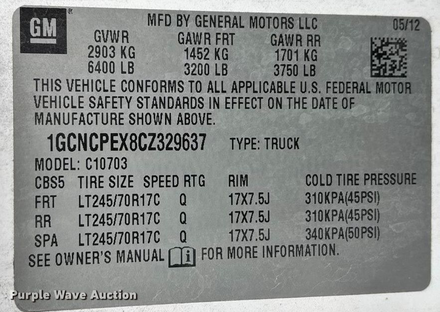 2012 Chevrolet Silverado 1500 pickup truck. Miles: 200,075 on odometer, VIN: 1GCNCPEX8CZ329637, Unit #: 1023540. Engine Displacement: 4.3L, Cylinders: 6, Fuel type: Gas. Transmission Automatic. Interior AC, Heat, Cruise control. Tires Size: LT245/70R17. Notes Contents not included, Dash warning indicator: TPMS, Jump start required during on-site data collection. Missouri title. Title distribution may be delayed up to 30 days from verification of funds. Brightspeed. Ozark, MO 65721