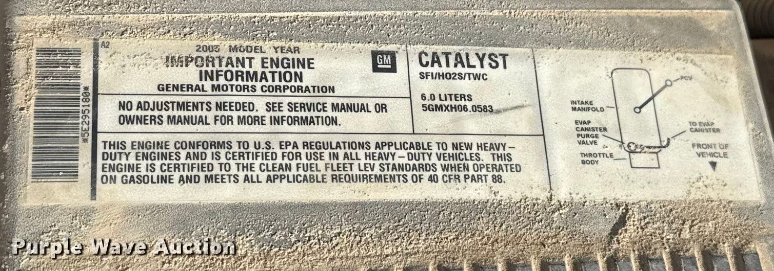 2005 Chevrolet Silverado 2500HD pickup truck. Miles: 188,648 on odometer, VIN: 1GCHC24U25E295180, Unit #: 203123. Engine Displacement: 6.0L, Cylinders: 8, Fuel type: Gas. Transmission Automatic. Interior AC, Heat, Cruise control. Tires Size: LT245/75R16. Notes Dash warning indicator: Check engine, Jump start required during on-site data collection, Driver side door hinge issues, Possible engine issues, rough idle. Oklahoma title. Title distribution may be delayed up to 30 days from verification of funds. Dolese Bros. Co. - Open Inspection Monday, December 29th. 5600 West Reno Avenue. Oklahoma City, OK 73127