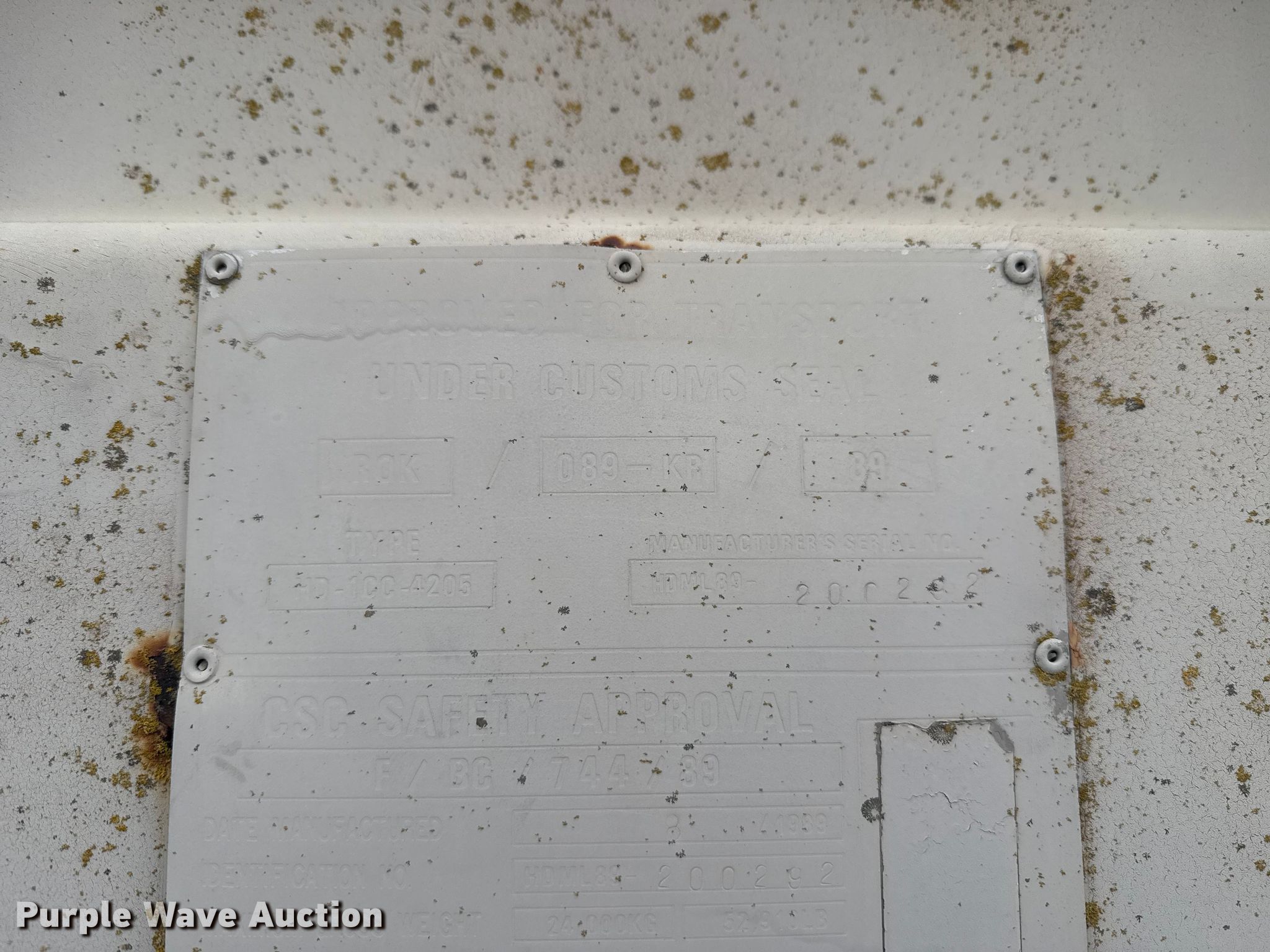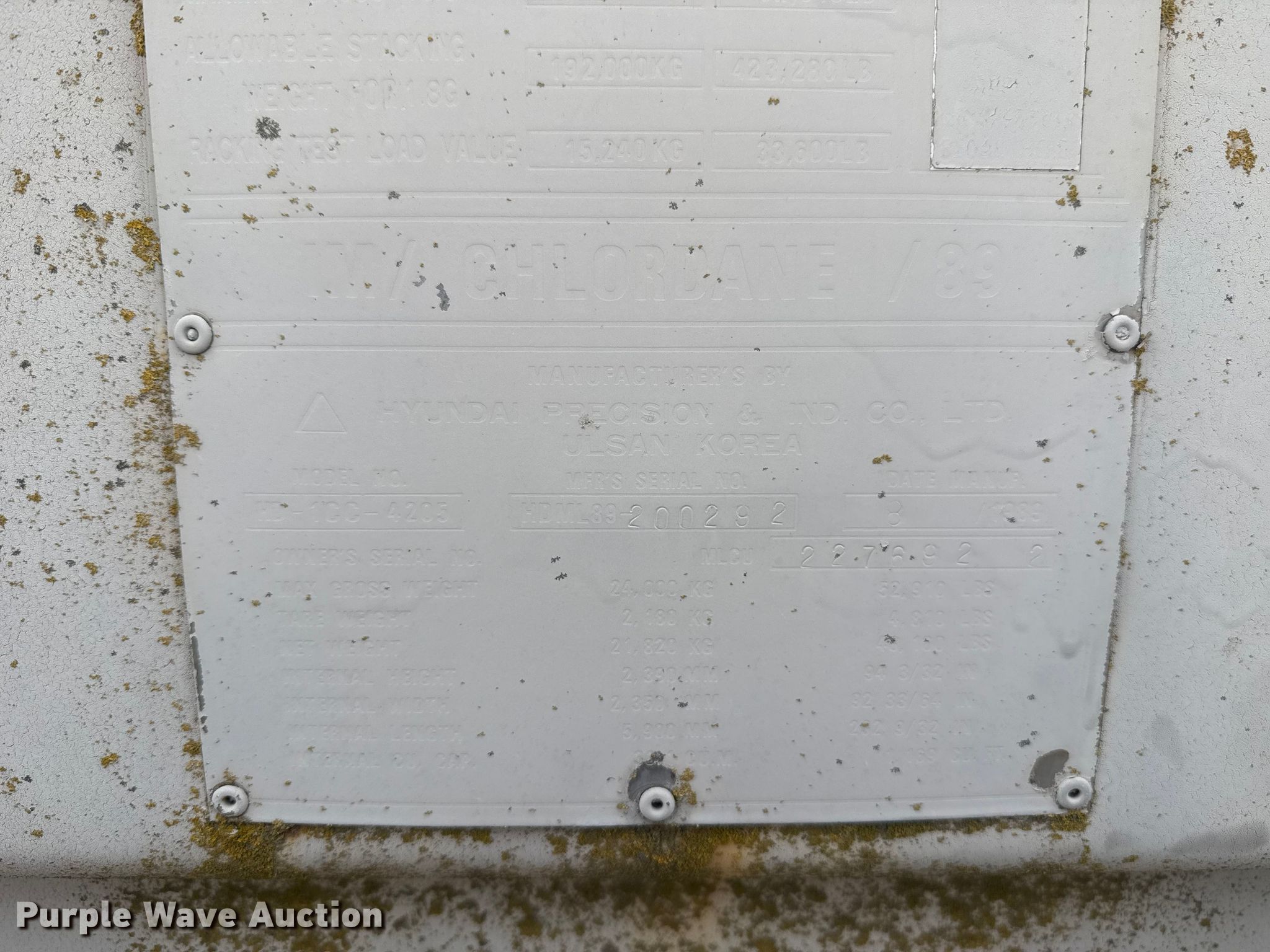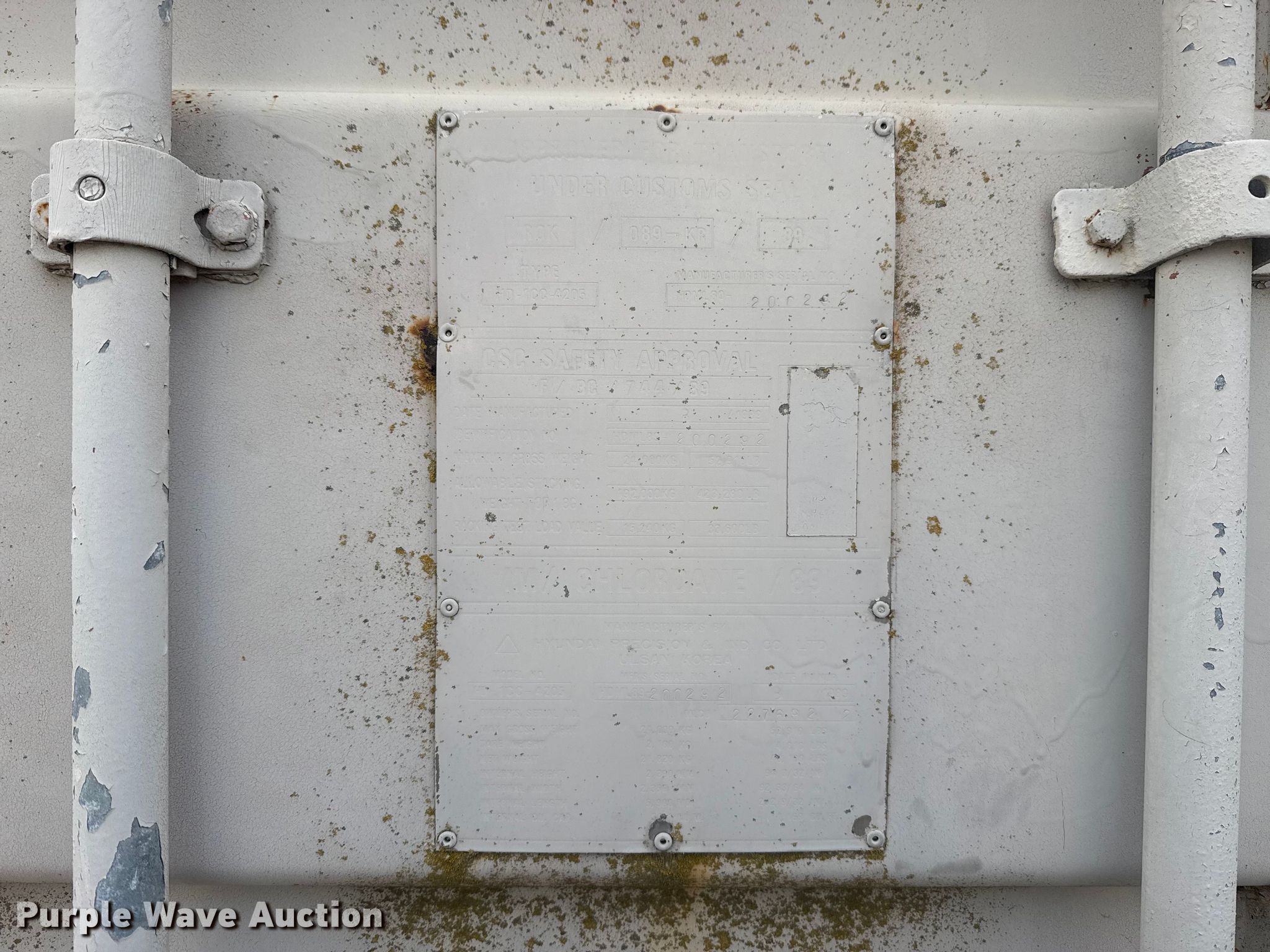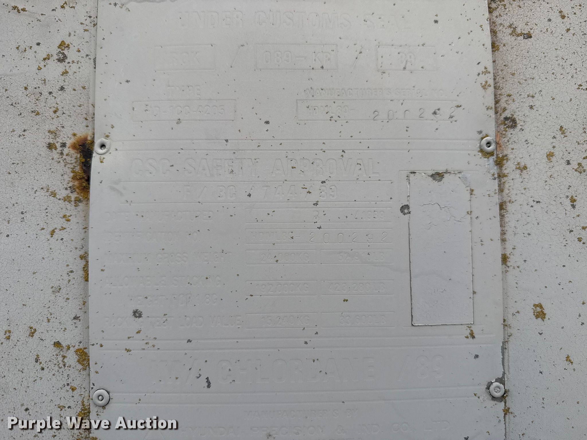 Purple Wave is selling a used Storage or Shipping Container in Oklahoma. This item is a 1989 Hyundai Precision HD-1CC-4205 shipping container with the following: Serial: HDML89-200292