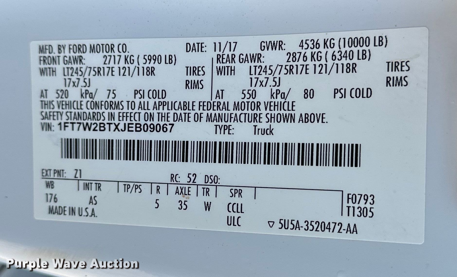 - VIN: 1FT7W2BTXJEB09067