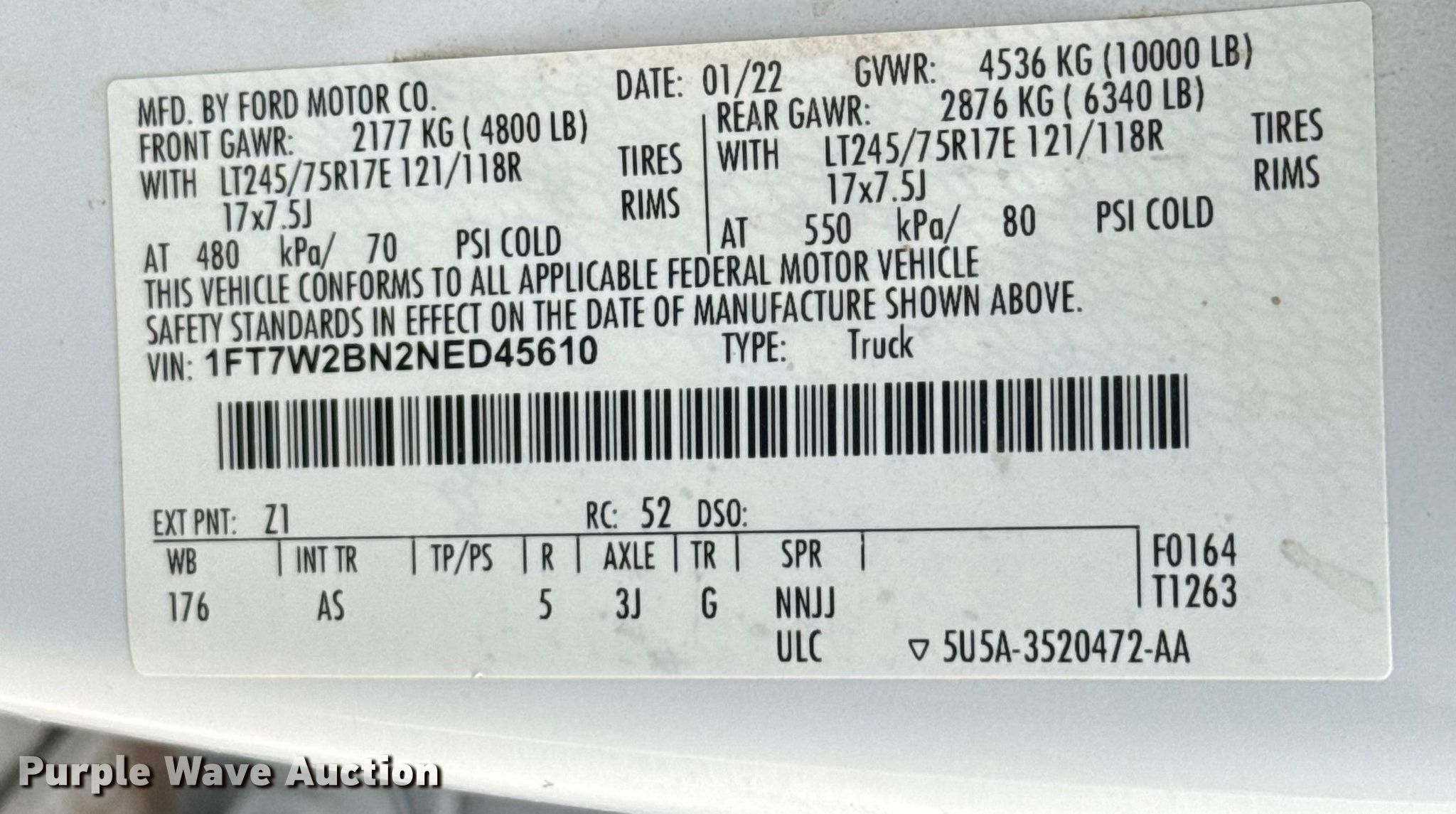 - VIN: 1FT7W2BN2NED45610