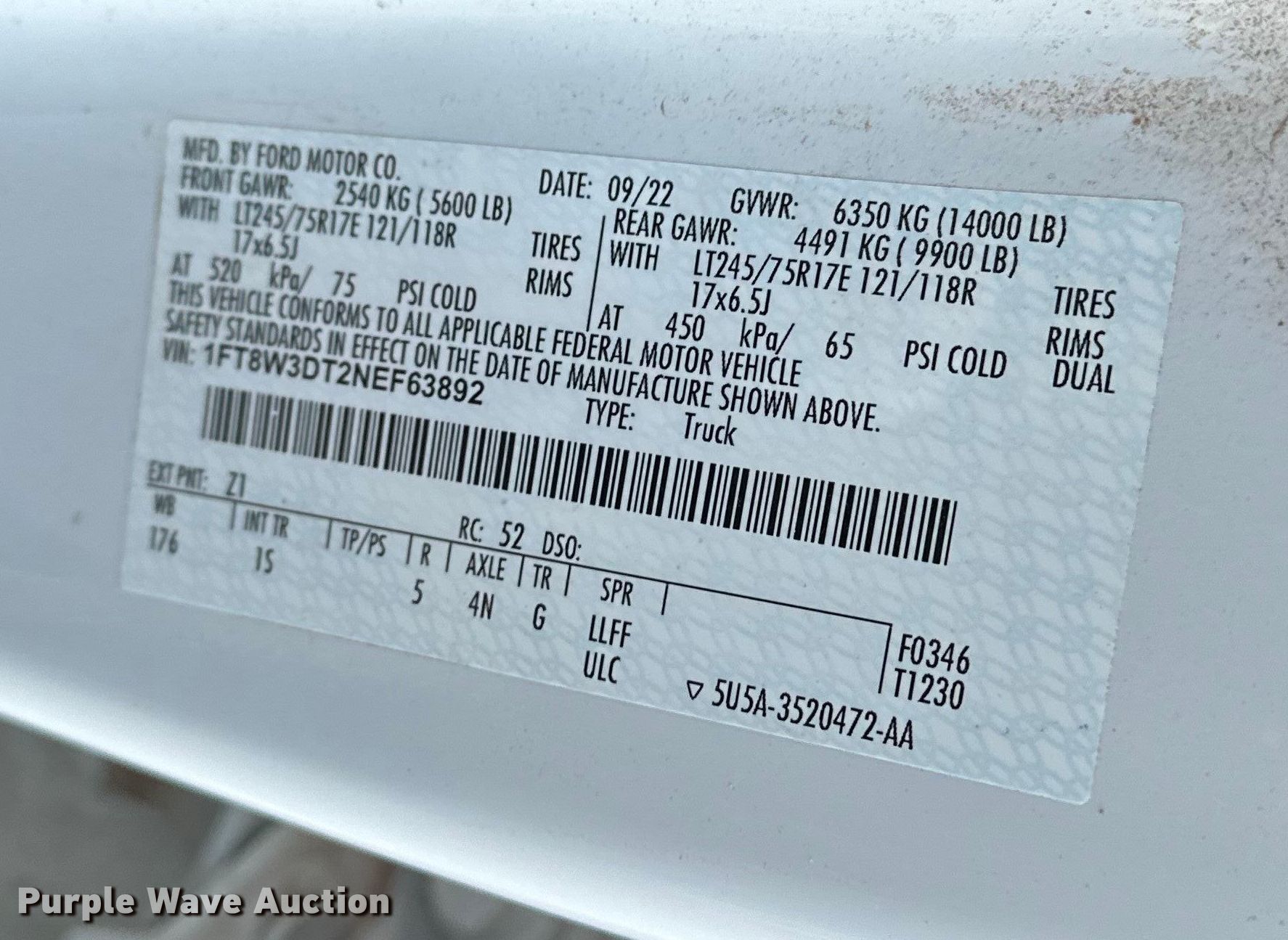 Purple Wave is selling a used 3/4 or 1 Ton Pickup or Van in Oklahoma. This item is a 2022 Ford F350 Super Duty Crew Cab flatbed pickup truck with the following: Miles: 174,752 on odometer, VIN: 1FT8W3DT2NEF63892, Unit #: 111117