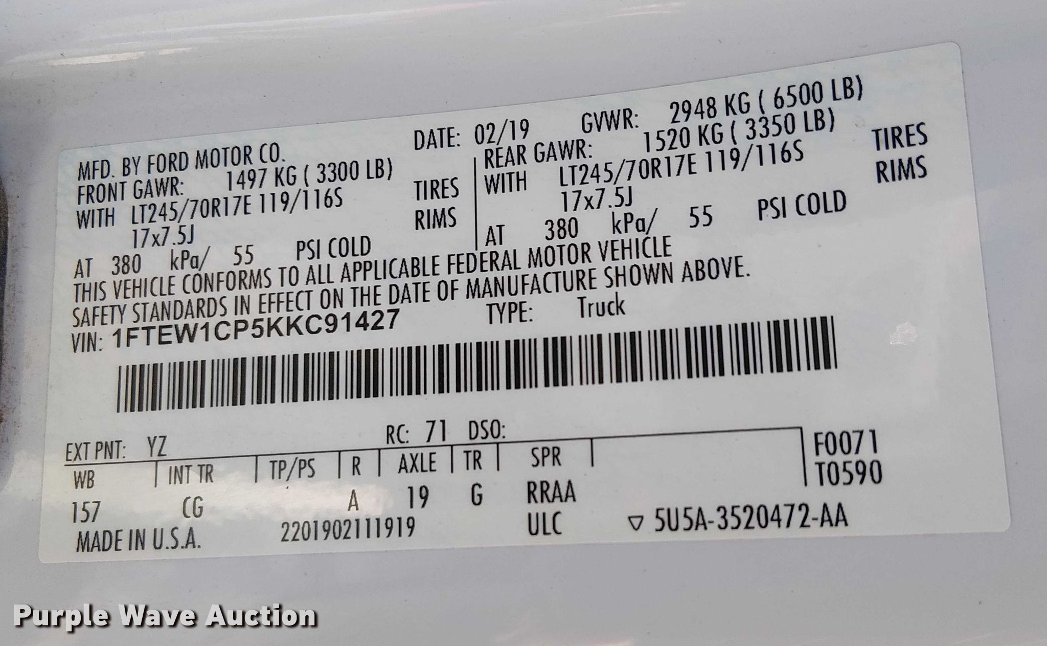 - VIN: 1FTEW1CP5KKC91427