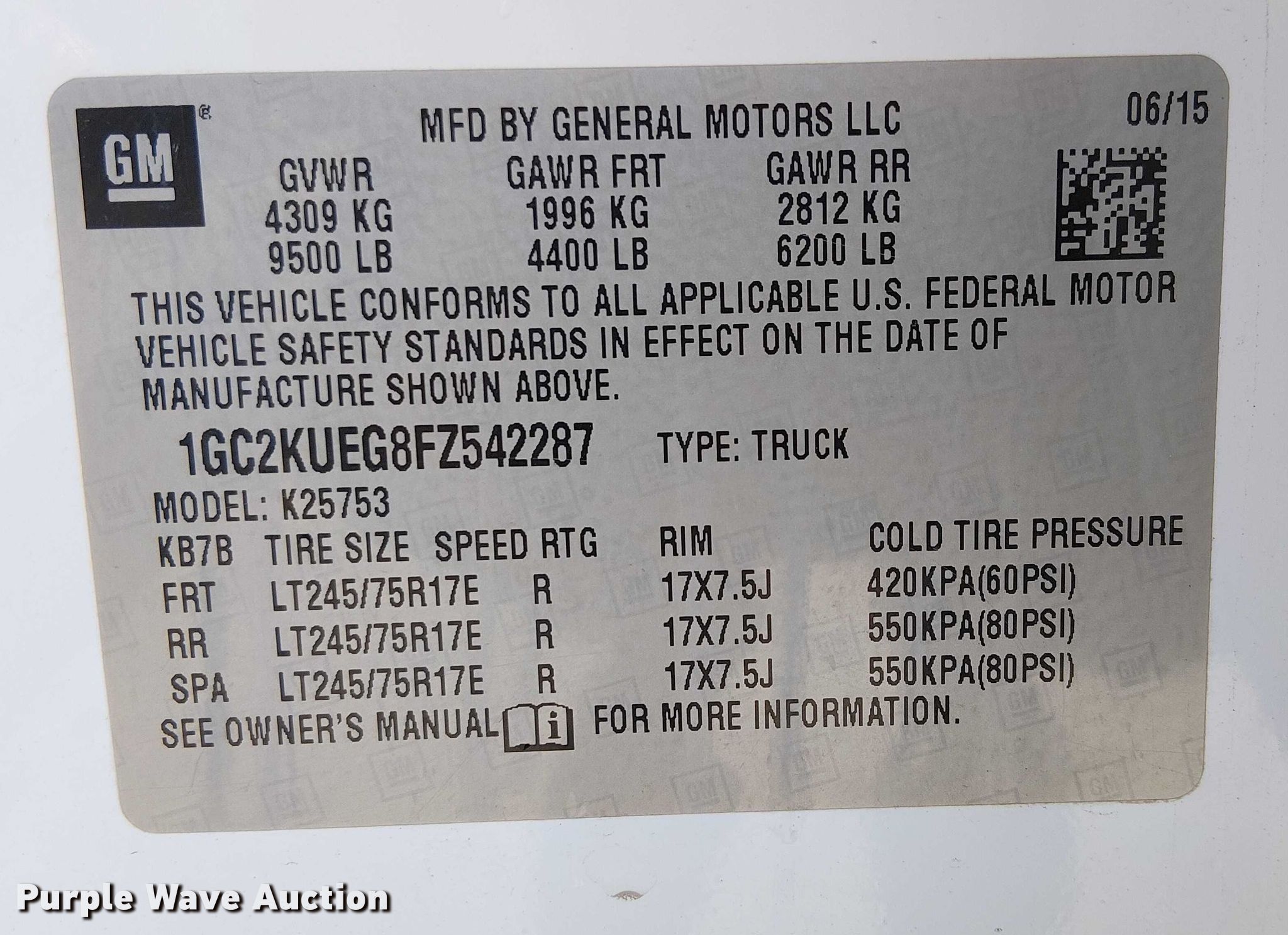 2015 Chevrolet Silverado 2500HD Double Cab pickup truck. Miles: 200,209 on odometer, Hours: 12,515 on meter, VIN: 1GC2KUEG8FZ542287. Engine Displacement: 6.0L, Cylinders: 8, Fuel type: Gas. Transmission Automatic, Four wheel drive. Interior AC, Heat, Heated mirrors, Power windows, Power locks, Cruise control, Backup camera, Brake controller. Tires Size: 245/70R17. Notes Dash warning indicator: Check engine, Windshield chipped or cracked, Exhaust issues, leak, Non-operational backup camera. Arizona title. Title distribution may be delayed up to 14 days from verification of funds. UUCON. Glendale, AZ 85303