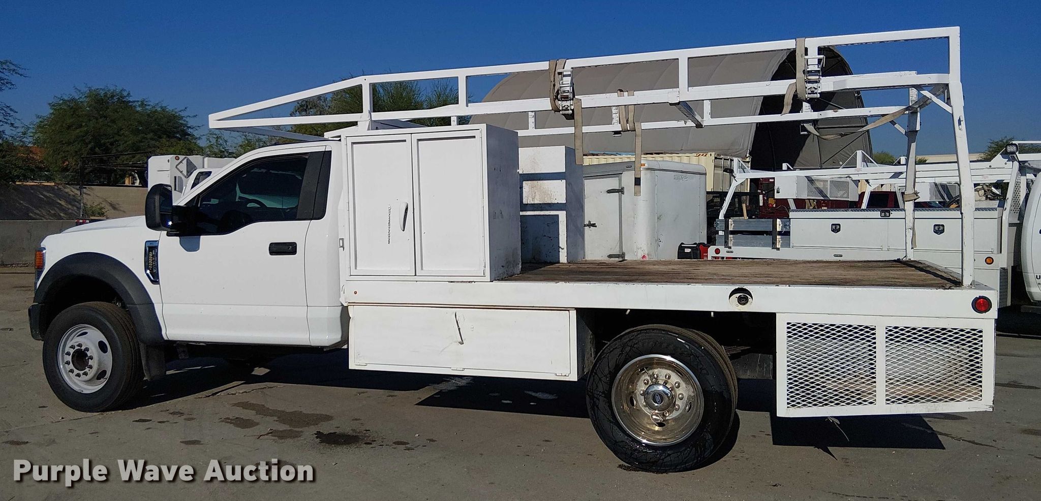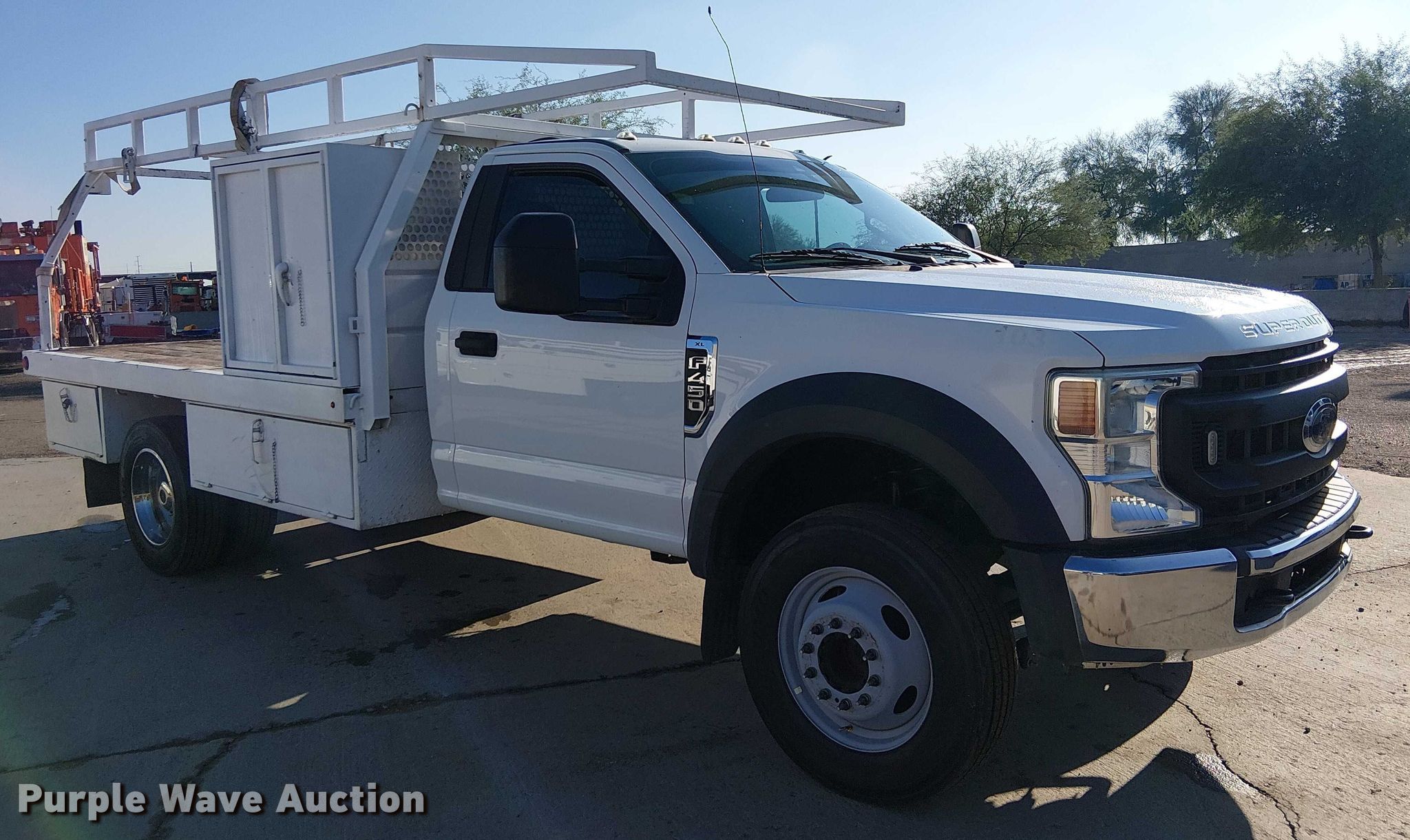 Purple Wave is selling a used Flat Bed Truck in Arizona. This item is a 2021 Ford F450 Super Duty flatbed truck with the following: Miles: 57,451 on odometer, Hours: 5,411 on meter, VIN: 1FDUF4GN7MEC71683