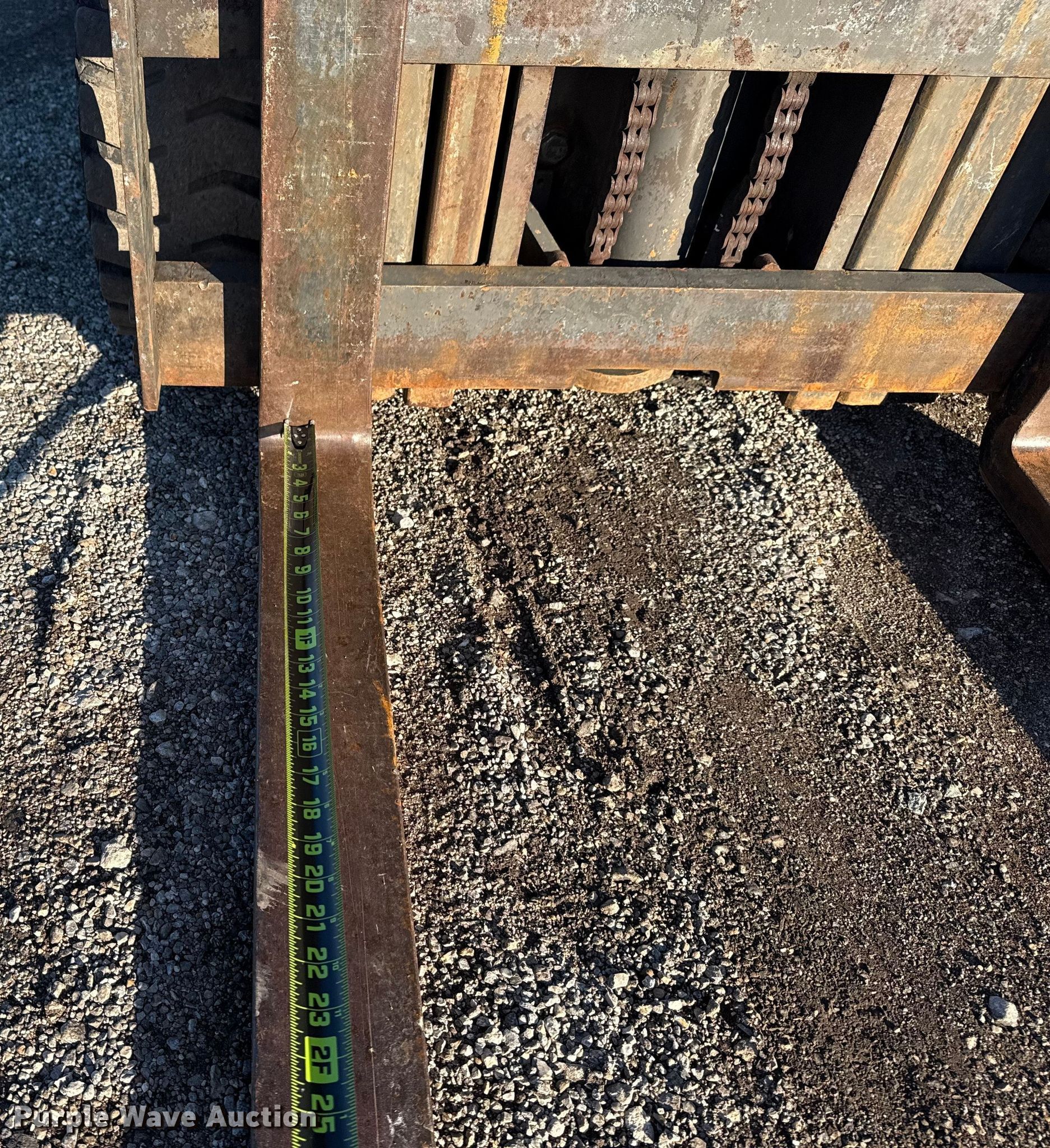 Mitsubishi FGC25 forklift. Hours: 1,444 on meter, Serial: AF82B-50040. Engine Cylinders: 4, Fuel type: LPG LP bottle: Included. Transmission Powershift. Operators station Canopy. Features Maximum lift capacity: 4,700 lbs, Maximum lift height: 189", Collapsed mast height: 82", Mast stages: 2, Mast tilt, Fork length: 42". Tires Front: 21x7x15, Rear: 16x6x10 1/2, Solid. Collinsville, OK 74021