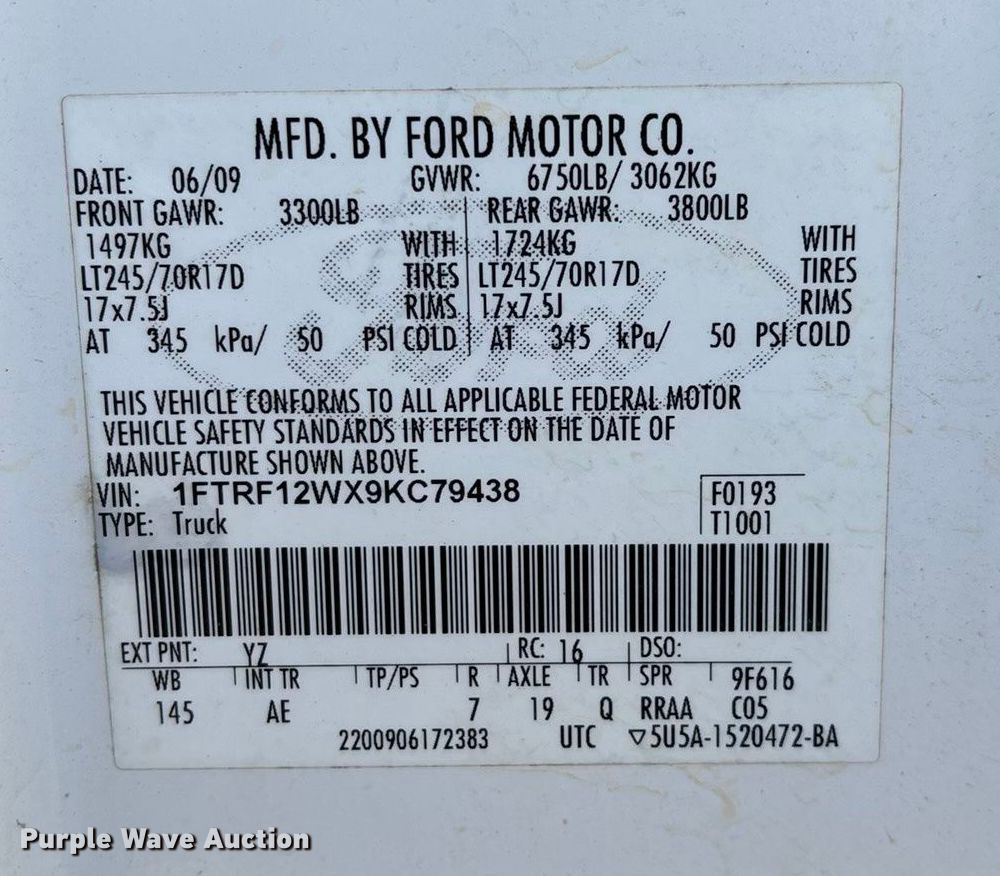 2009 Ford F150 XL pickup truck. Miles: 287,308 on odometer, VIN: 1FTRF12WX9KC79438, Unit #: 10731. Engine Displacement: 4.6L, Cylinders: 8, Fuel type: Gas. Transmission Automatic. Interior AC, Heat, Auxiliary controls, Brake controller. Tires Size: LT245/70R17. Notes Dash warning indicator: TPMS, Windshield chipped or cracked, Hail damage, Jump start required during on-site data collection, Possible engine issues, burns oil , Oil leak. Missouri title. Title distribution may be delayed up to 30 days from verification of funds. Brightspeed. El Dorado Springs, MO 64744