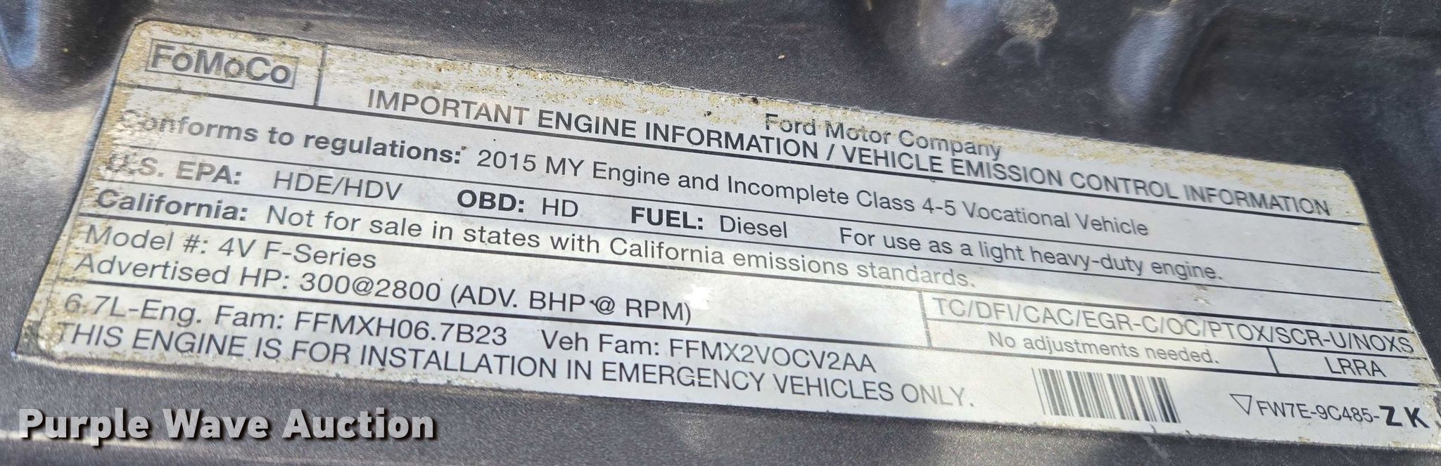 2015 Ford F550 Super Duty XLT ambulance. Miles: 215,287 on odometer, VIN: 1FDUF5GT1FEC04410. Engine Ford, Displacement: 6.7L, Cylinders: 8, Fuel type: Diesel. Transmission Automatic. Chassis Axles: Single, Suspension: Air, Brakes: Hydraulic, GVWR: 18,000 lbs. Interior AC, Heat, Heated mirrors, Power windows, Power locks, Cruise control, Backup camera, Auxiliary controls, Brake controller. Features Ambulance body PA/ siren controls, Oxygen hookups. Tires Size: 225/70R19.5. Notes Dash warning indicator: Check engine, Hail damage, Emissions system modified , Fuel rail issues, needs replaced. Oklahoma title. Title distribution may be delayed up to 30 days from verification of funds. Creek County Emergency Ambulance Service. Drumright, OK 74030