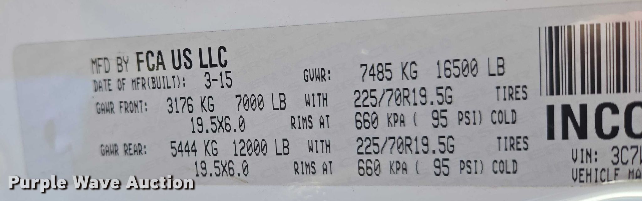 2015 RAM 4500HD ambulance. Miles: 382,005 on odometer, VIN: 3C7WRKBL1FG635738. Engine Cummins, Displacement: 6.7L, Cylinders: 6, Fuel type: Diesel. Transmission Automatic. Chassis Axles: Single, Suspension: Air, Brakes: Hydraulic, GVWR: 16,500 lbs. Interior AC, Heat, Heated mirrors, Power windows, Power locks, Cruise control, Backup camera, Auxiliary controls. Features Ambulance body PA/ siren controls, Oxygen hookups. Tires Size: 225/70R19.5. Notes Dash warning indicator: Check engine, Jump start required during on-site data collection, Intermittent odometer illumination issues, Emissions system modified , PA mic missing. Oklahoma title. Title distribution may be delayed up to 30 days from verification of funds. Creek County Emergency Ambulance Service. Drumright, OK 74030