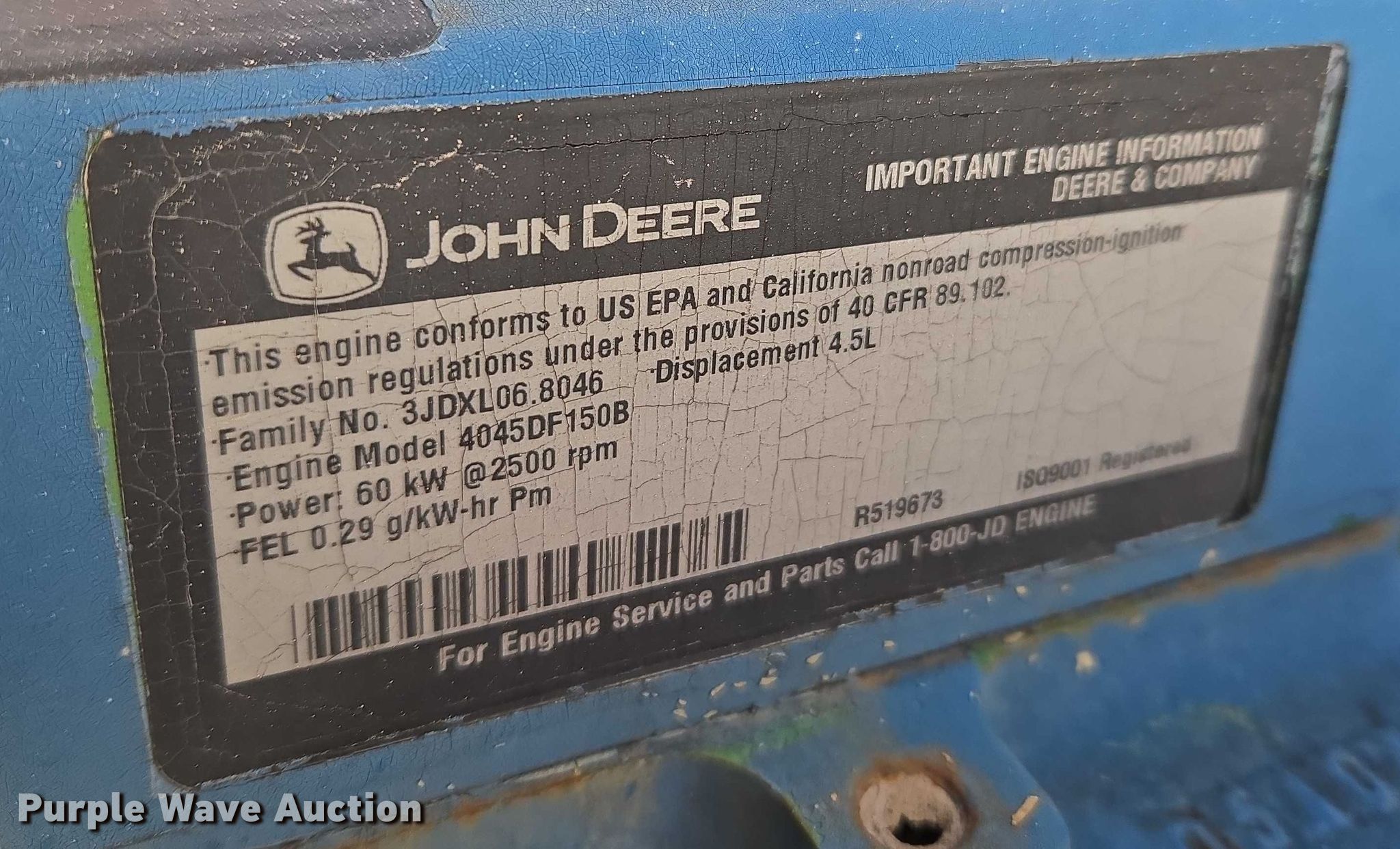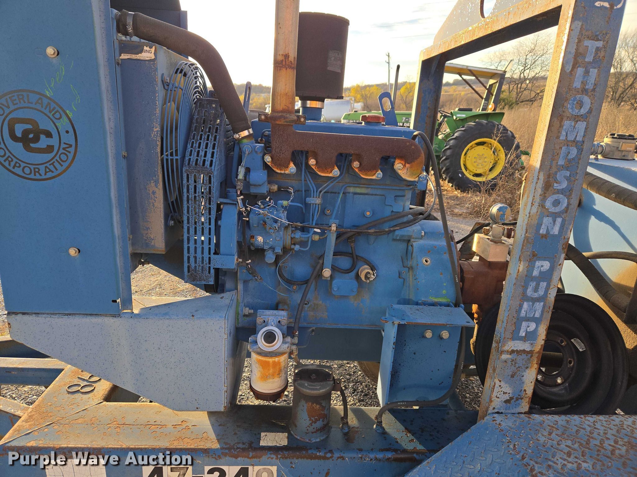 Thompson pump. Hours: 693 on meter. Dimensions Overall Length: 11', Width: 5' 3". Engine John Deere 4045DF150B, Displacement: 4.5L, Cylinders: 4, Fuel type: Diesel. Tires Size: P225/75R15. Notes Fuel delivery system issues , Starts with starting fluid, Unknown operating condition. Transfer of ownership documentation will be a bill of sale. Overland Corporation. 534 U.S. 77. Ardmore, OK 73401