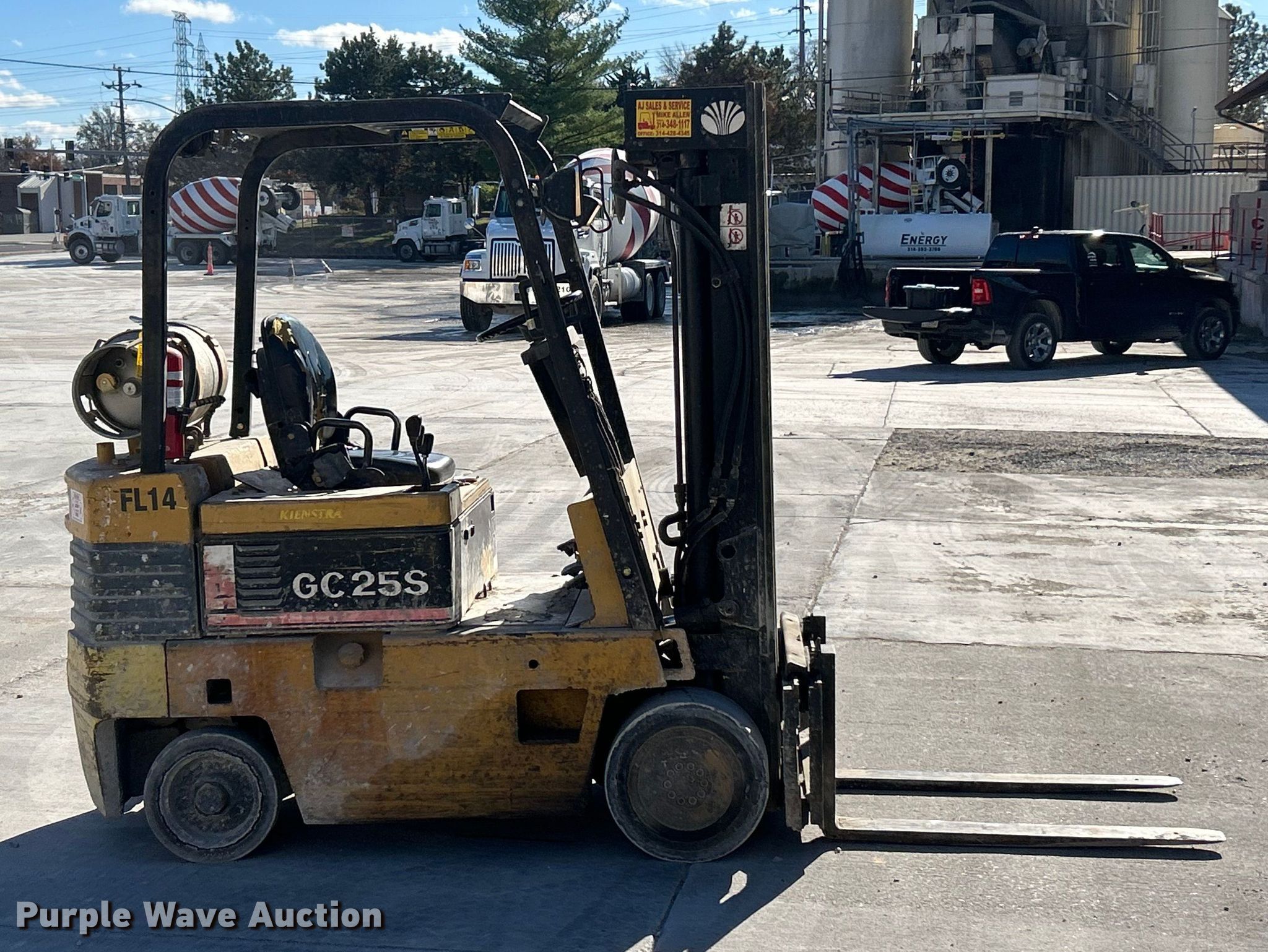 Daewoo GC25S forklift. Hours: 8,318 on meter, Serial: 206-00366. Engine Cylinders: 4, Fuel type: LPG LP bottle: Not included. Transmission Powershift. Operators station OROPS. Features Maximum lift capacity: 4,500 lbs, Maximum lift height: 188", Collapsed mast height: 80", Mast stages: 3, Side shift, Mast tilt. Tires Front: 18x8x12 1/8, Rear: 16x5x10.5, Solid. Kienstra Materials. St. Louis, MO 63114