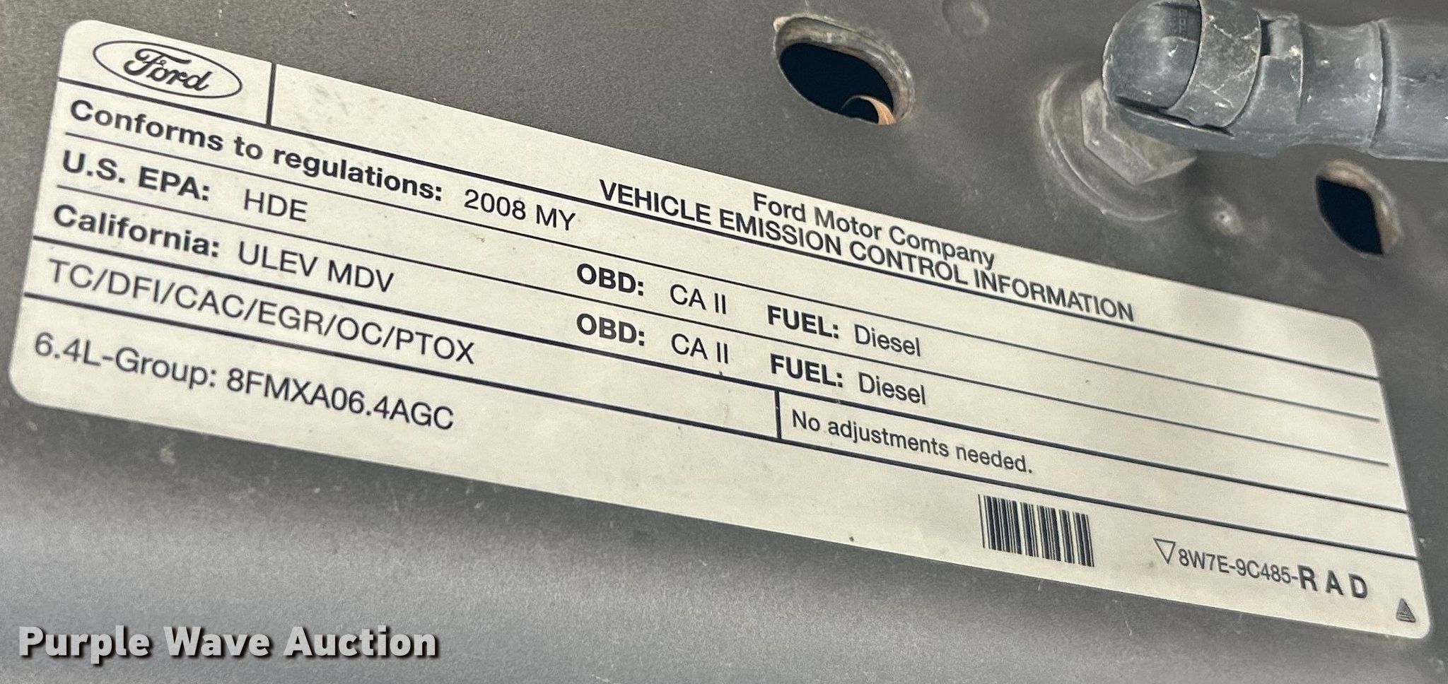 2008 Ford F350 Super Duty Crew Cab pickup truck. Miles: 217,746 on odometer, VIN: 1FTWW31R18EB80336. Engine Displacement: 6.4L, Cylinders: 8, Fuel type: Diesel. Transmission Automatic, Four wheel drive. Interior AC, Heat, Heated mirrors, Power windows, Power locks, Cruise control, Auxiliary controls, Brake controller. Features Hitch: Gooseneck. Tires Size: 33x12.50R20. Notes Windshield chipped or cracked, Power steering issues, leak. Illinois title. Title distribution may be delayed up to 14 days from verification of funds. Andy Guthrie. Scheller, IL 62883